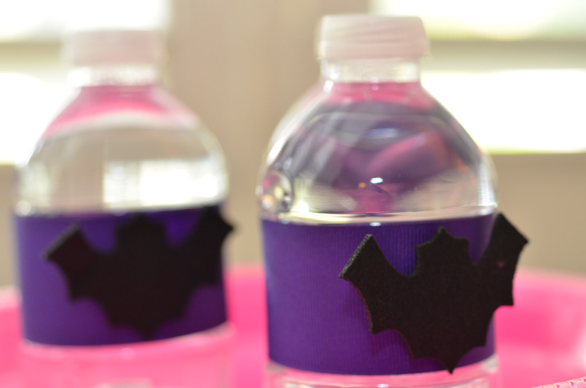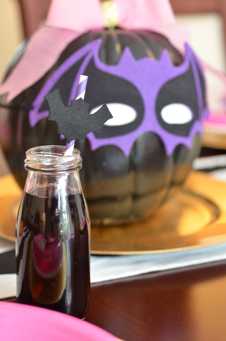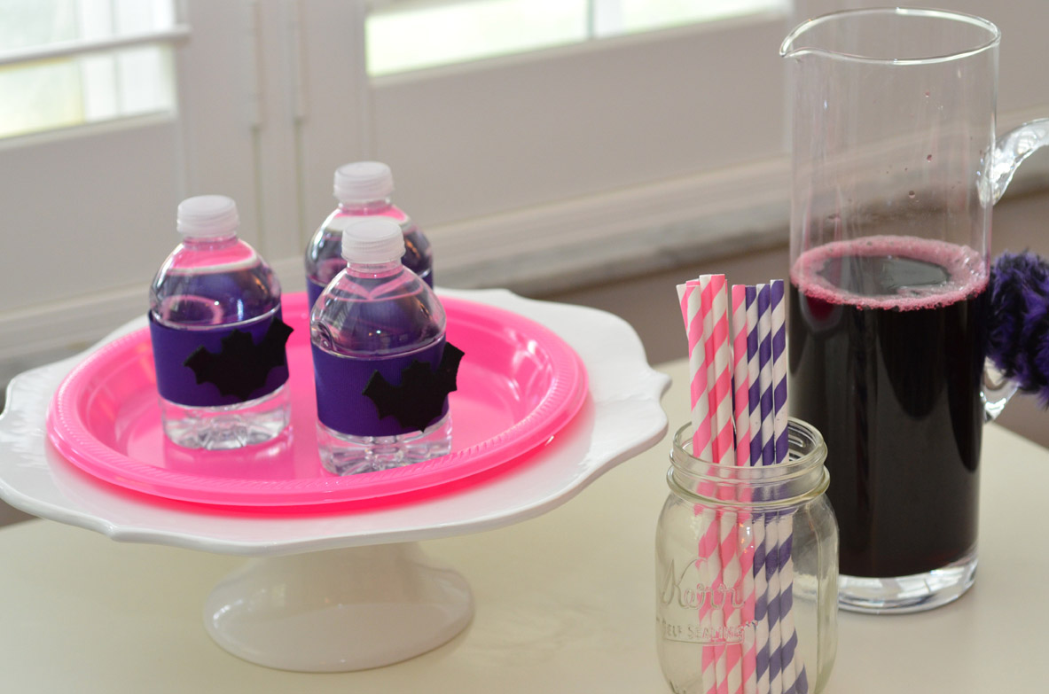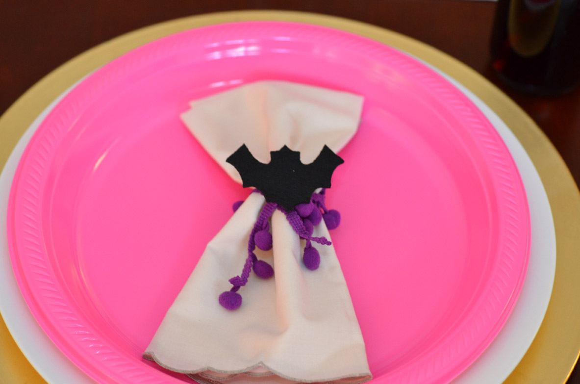 For each guest place setting we used a gold charger, white plate with a pink plate on top. Our napkins were tied with the purple pom pom trim and topped with a mini bat. For their glasses we used our favorite milk bottle and topped them with straws with bat decor.