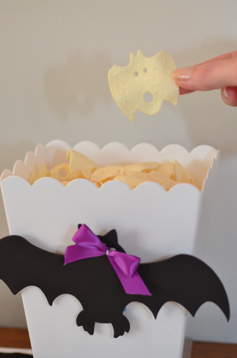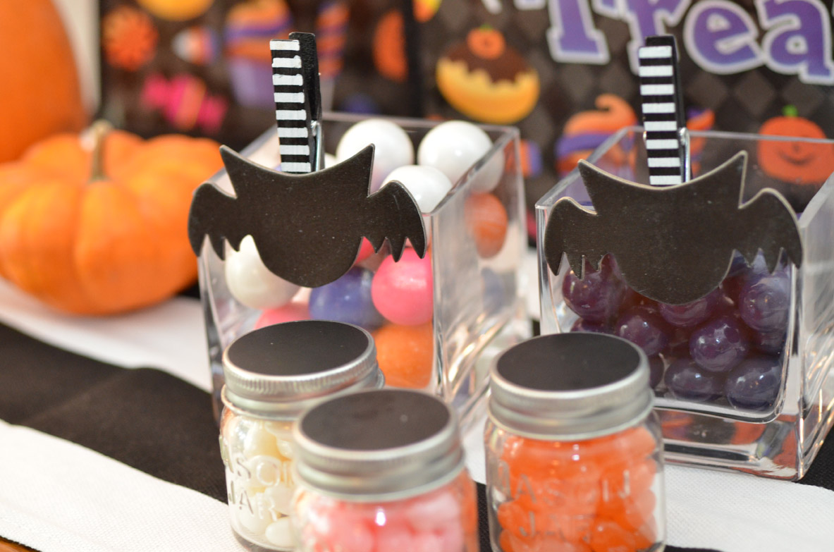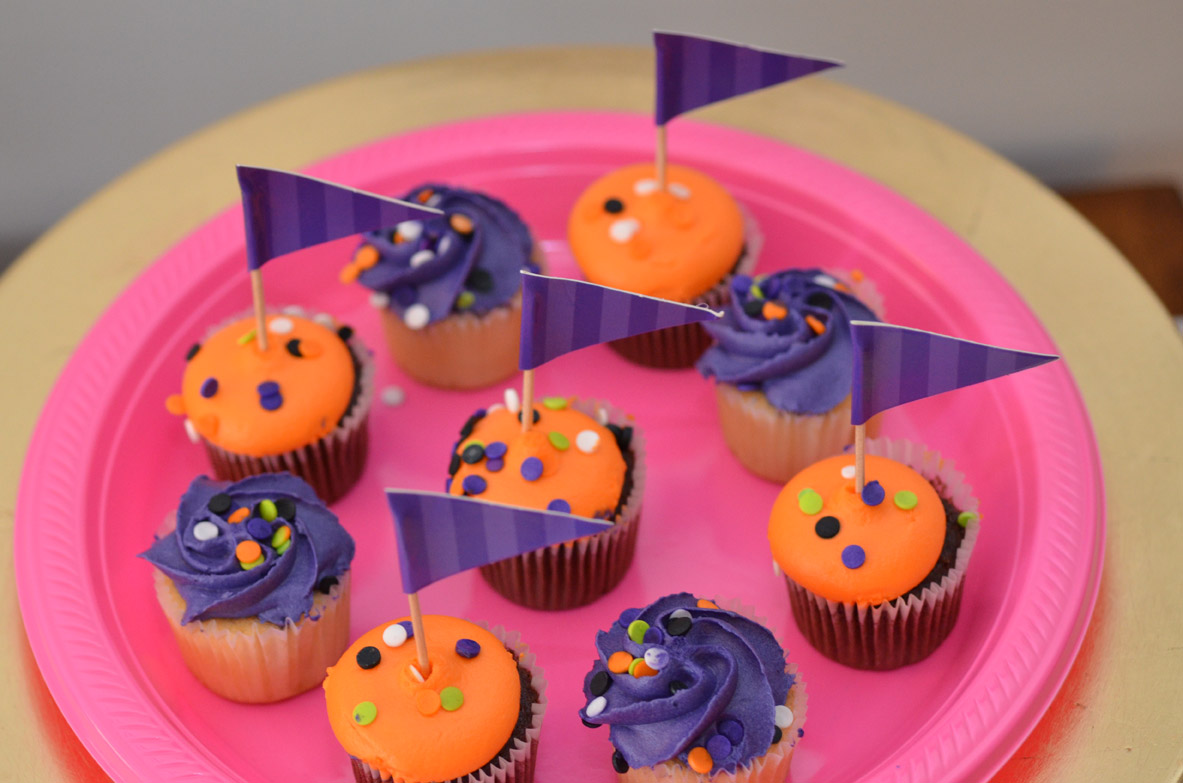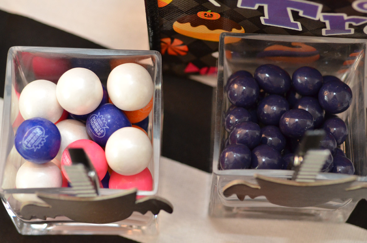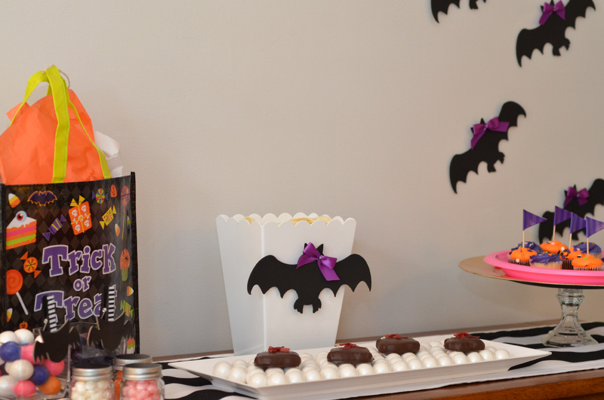 We were originally going to bake our own cookies. When I saw these bat cookies at Trader Joe's I knew we no longer needed to make them. I made bows out of fruit by the foot to stick with our theme. The purple and orange mini cupcakes were a hit with everyone. The bat chips also from Trader Joe's were so cute! Who knew there were bat chips. Fresh Market never disappoints with their candy selection including chocolate covered raisins, gumballs and jelly beans.