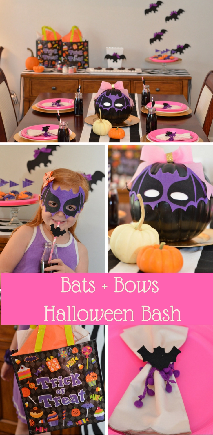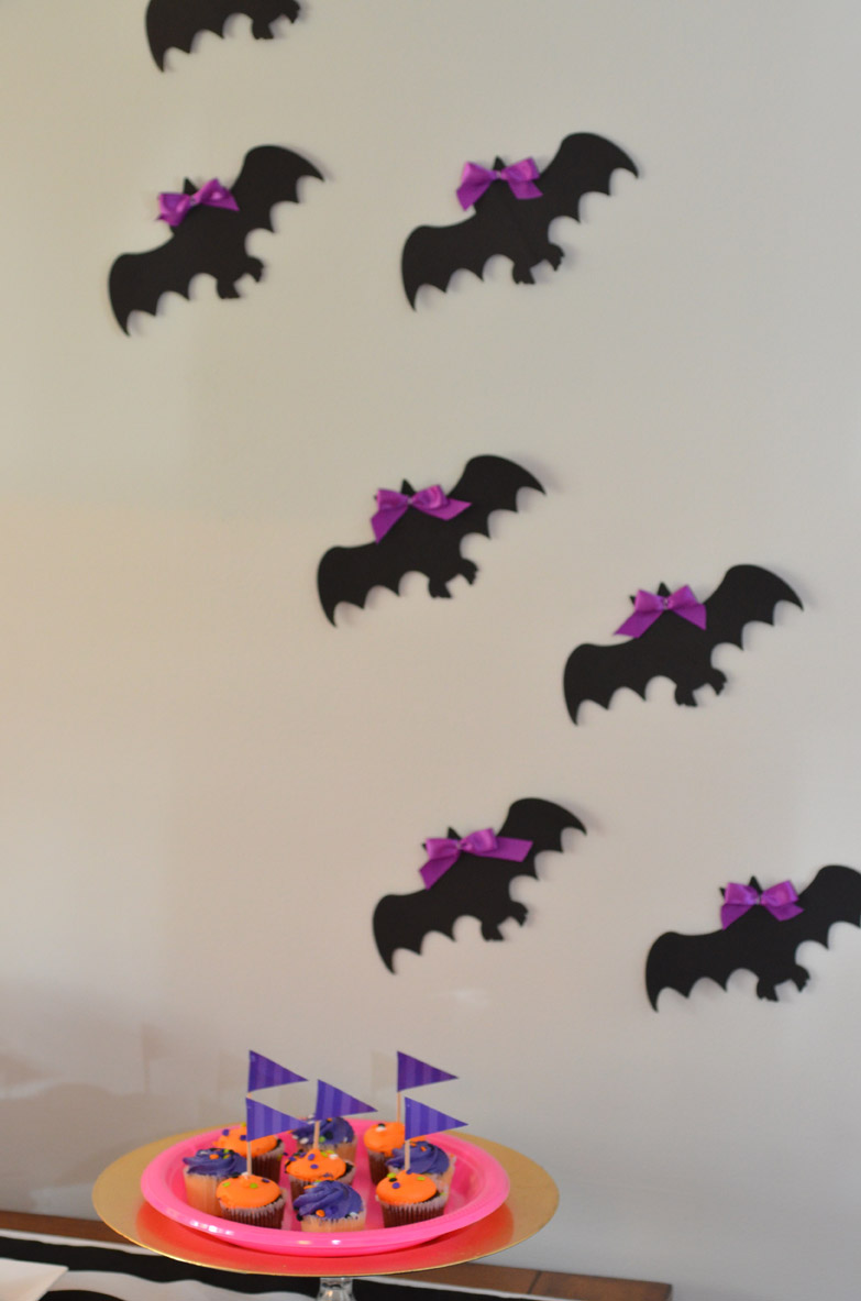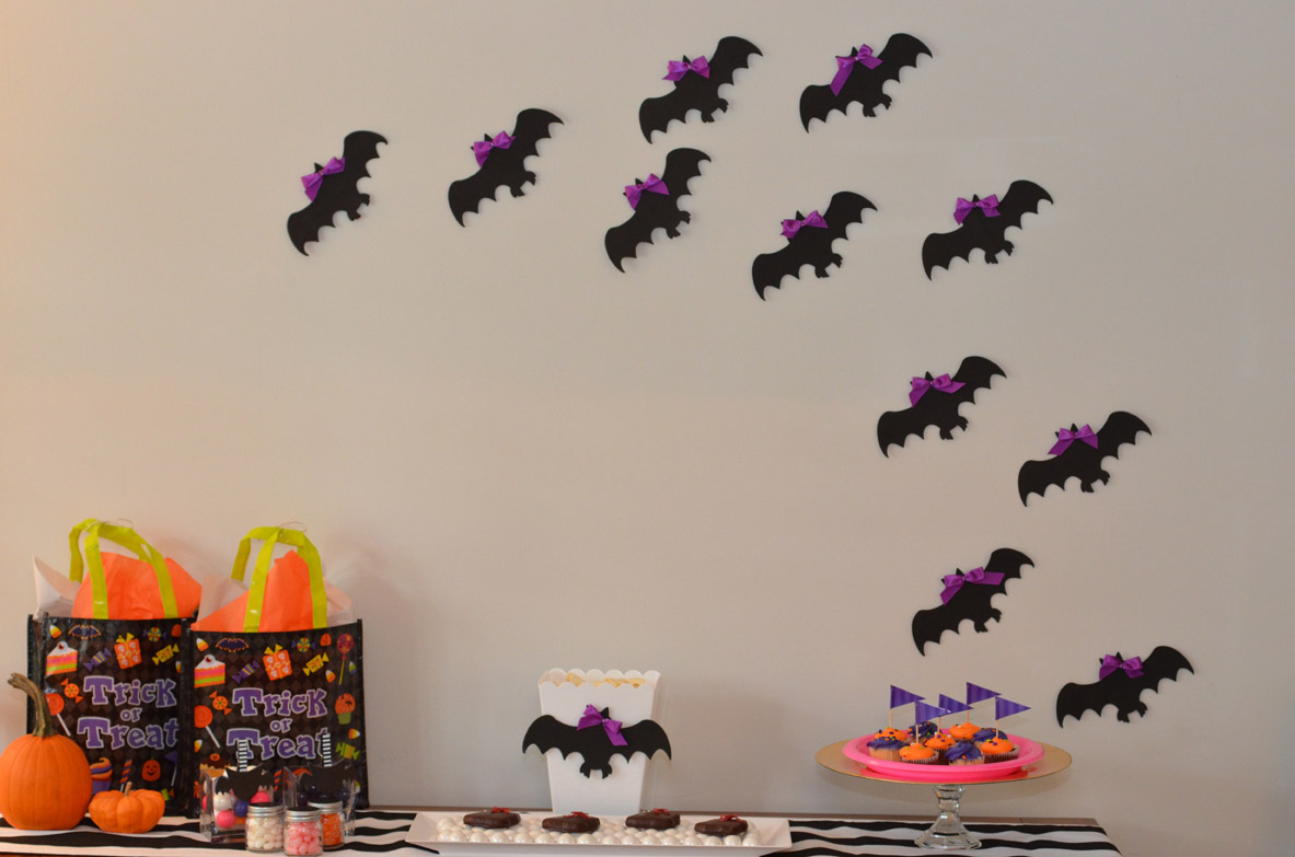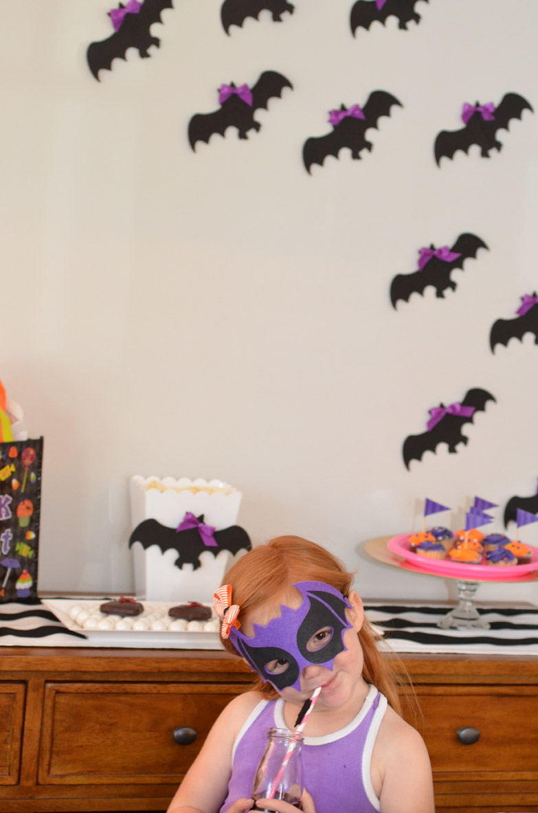 I was never a Halloween lover until Bailey was born. Annaliese from Made of Sugar and Spice Boo-tiful ball preview on Instagram inspired me to create this party. We had a black, pink and purple Bats + Bows Halloween Party. Bailey and I found these black and purple bat masks and she wanted to get them for all of her friends.