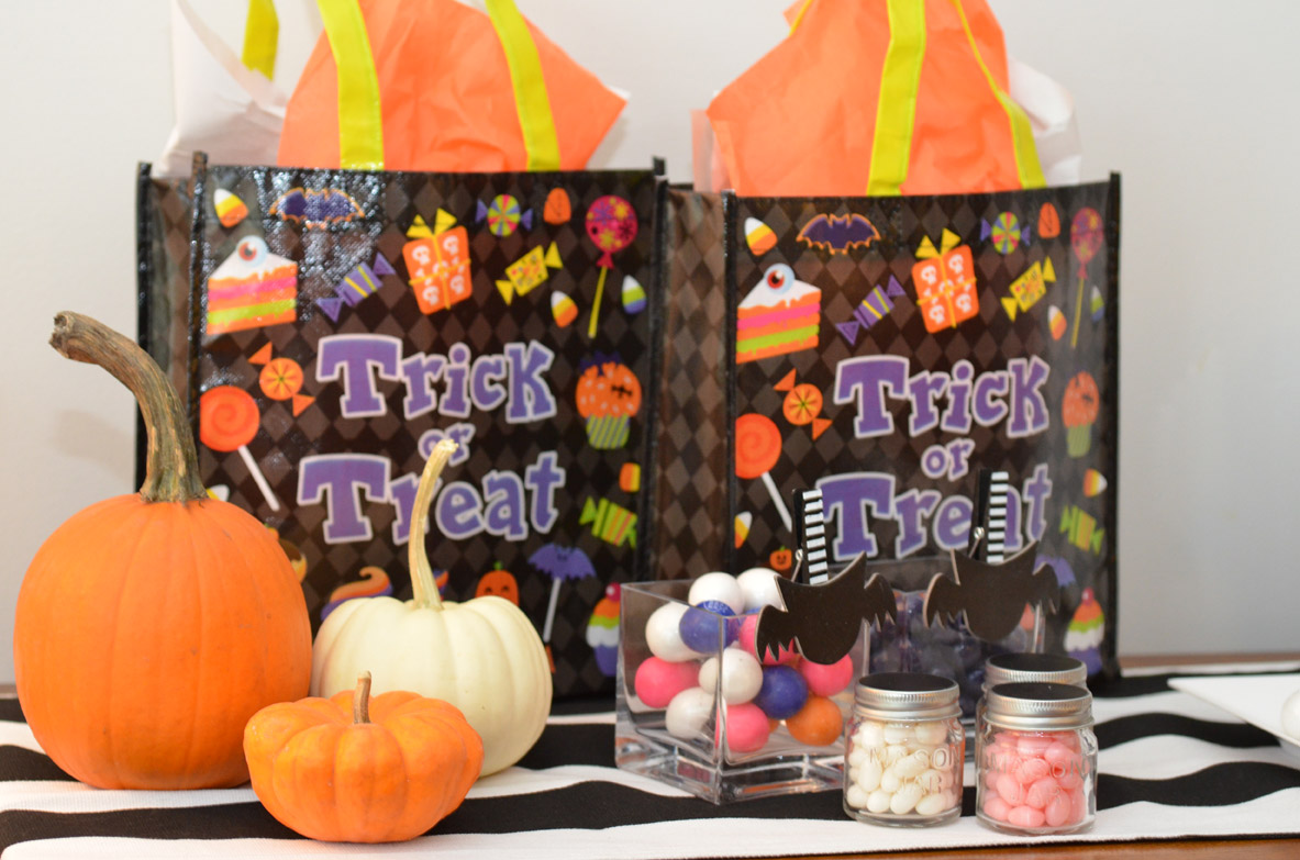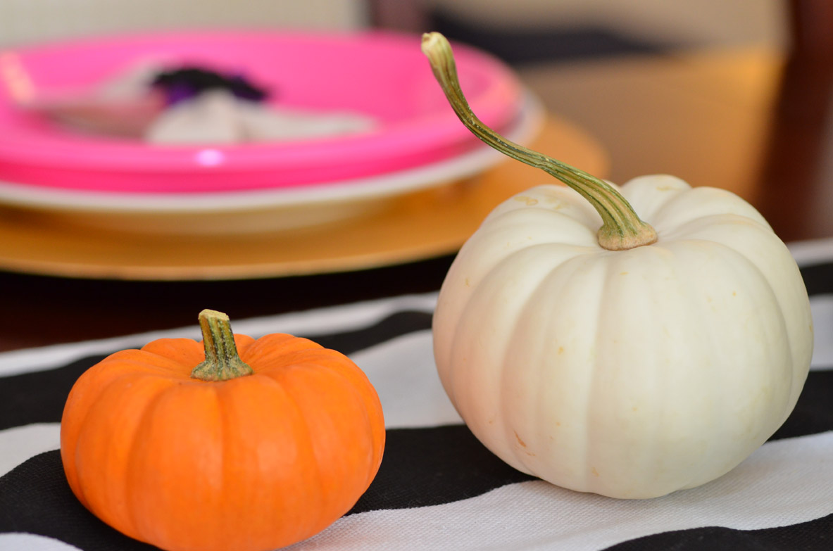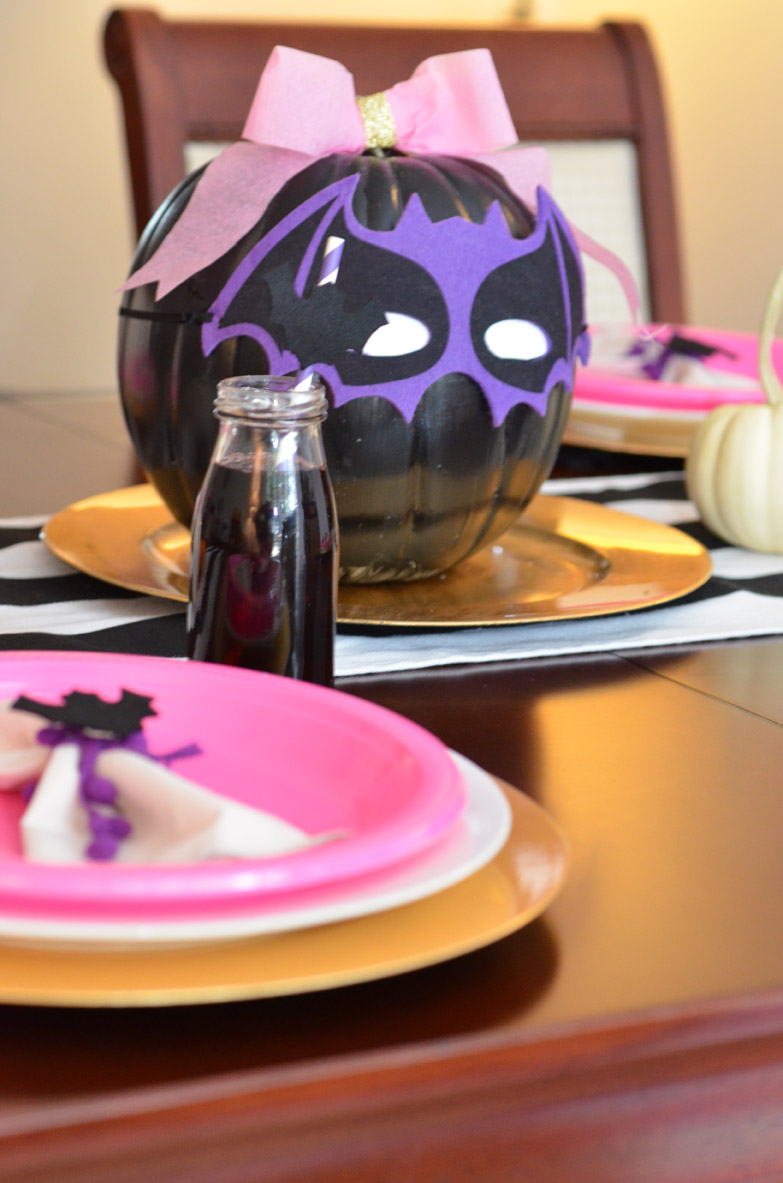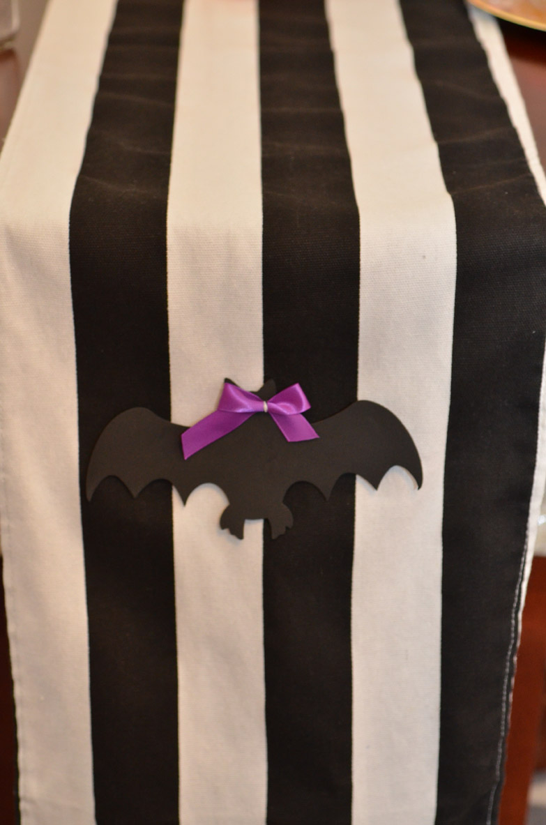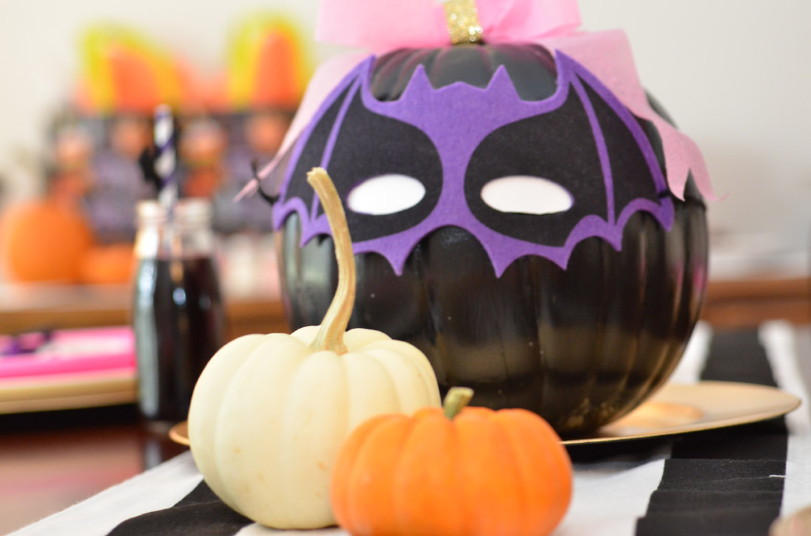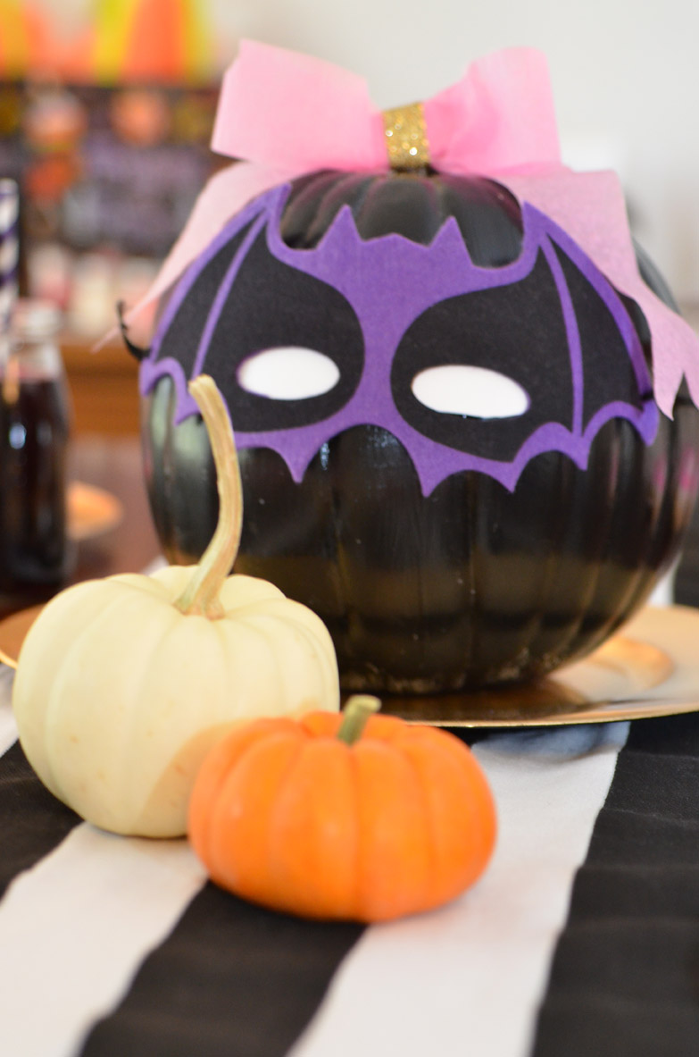 For our centerpiece we started with our black and white table runner from Oriental Trading and then layered on pumpkins. We knew that we wanted to use the bat masks in the design so we tried it on our big pumpkin and it was perfect. Then we added a bow and some show paper behind it so that the mask popped.