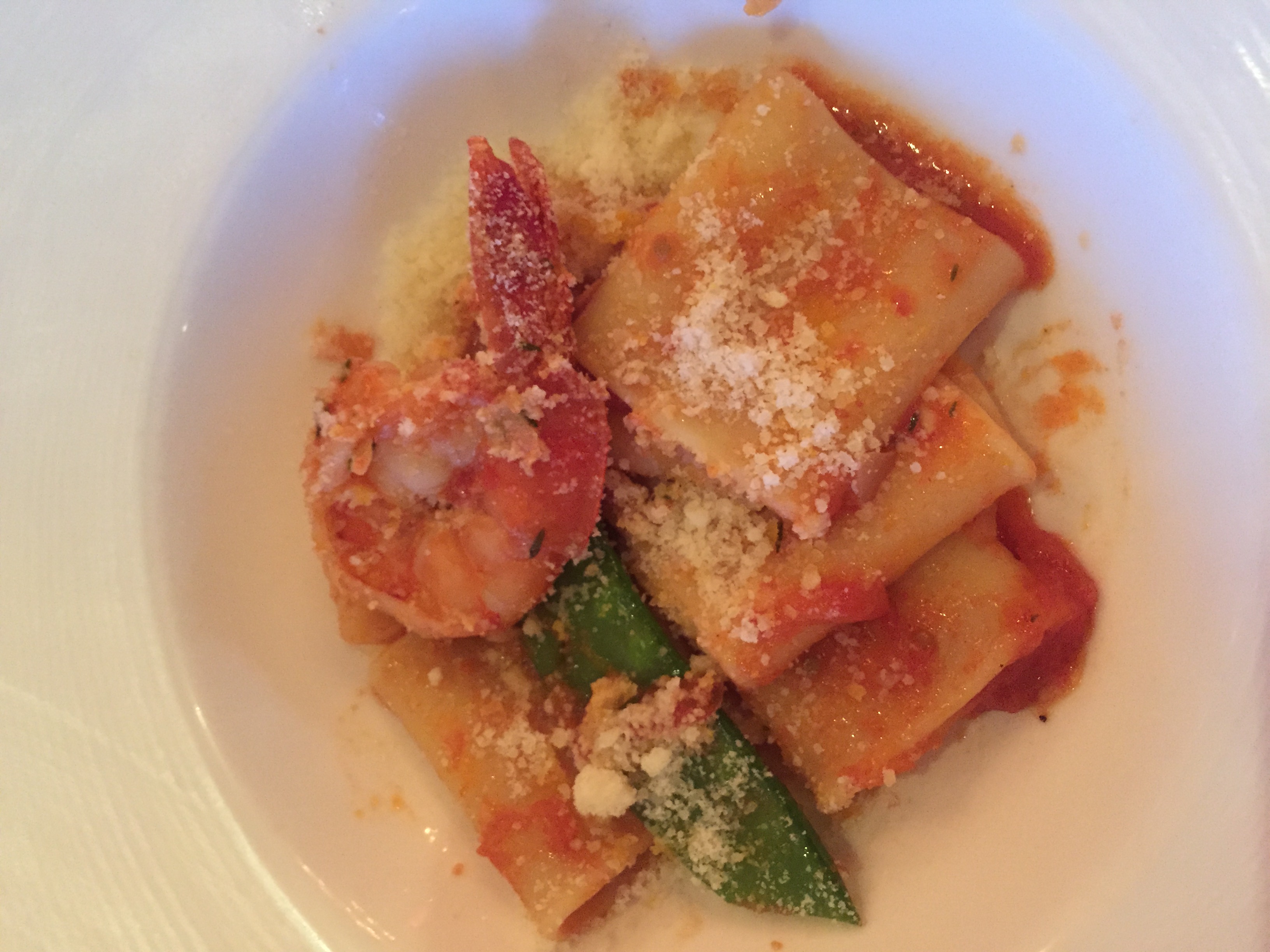 Our second course was Mezze Maniche al Sapore del Mediterraneo with short tube pasta with shrimp, bay scallops, pea pods, fresh pomodoro and basil. I rarely think to mix shrimp and scallops with tomato sauce, but after trying this I will be ordering the combo more often. This homemade pasta made me never want to buy box pasta again.