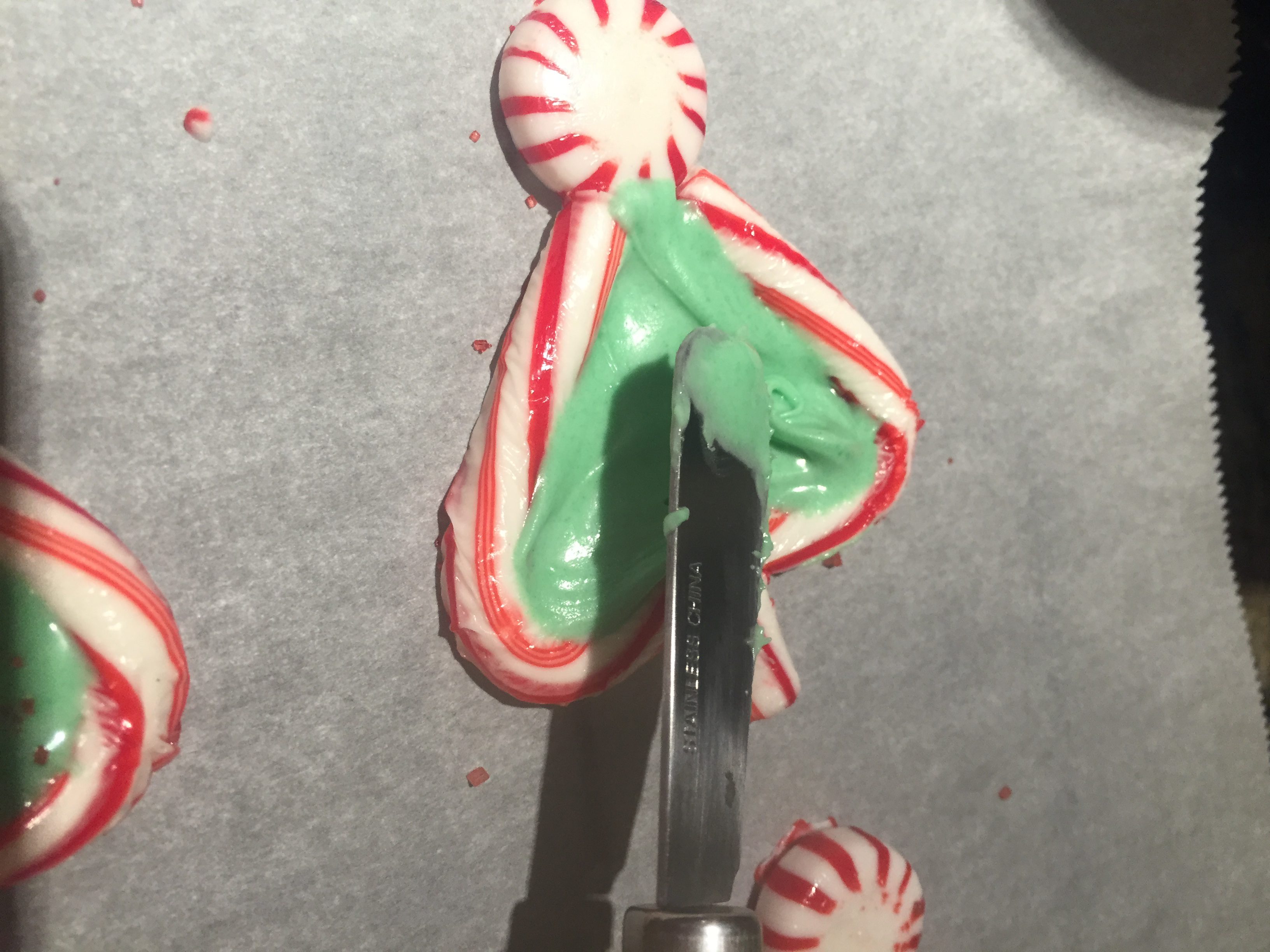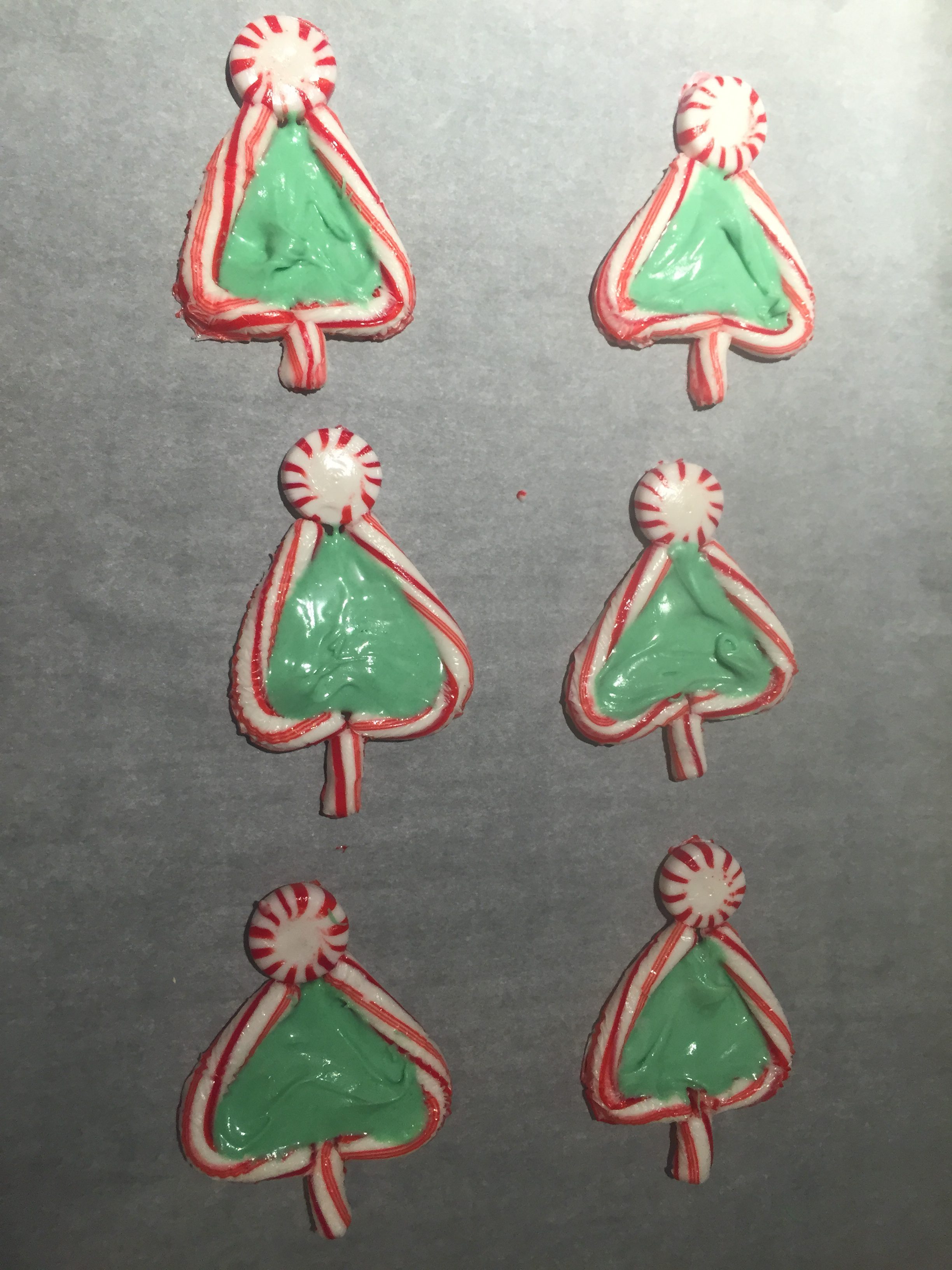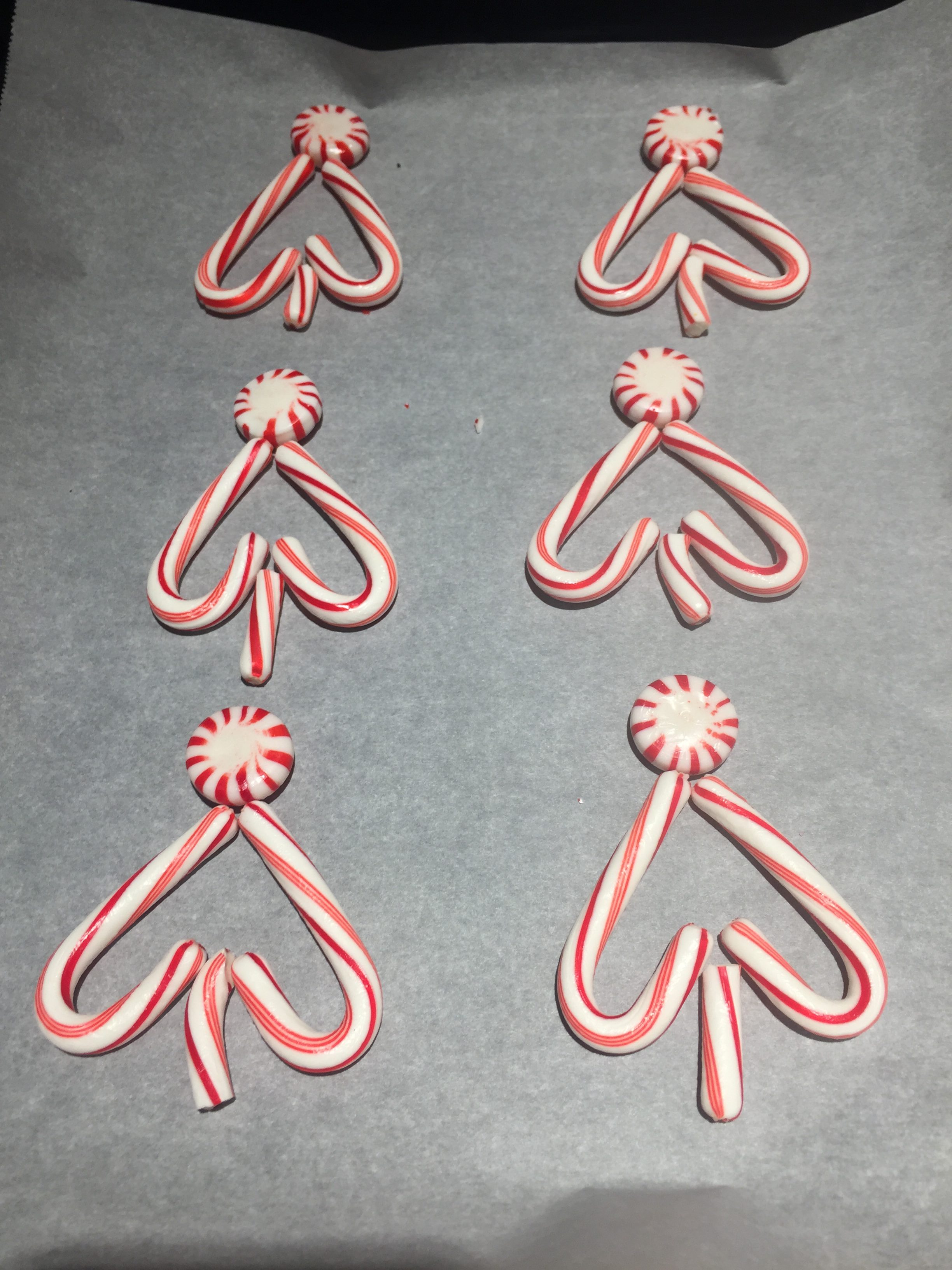 - When you remove them from the oven straight out the tree section and make sure all the pieces are touching, so that they cool together. Be super careful. I burned myself in this step. The candy canes are super hot.
