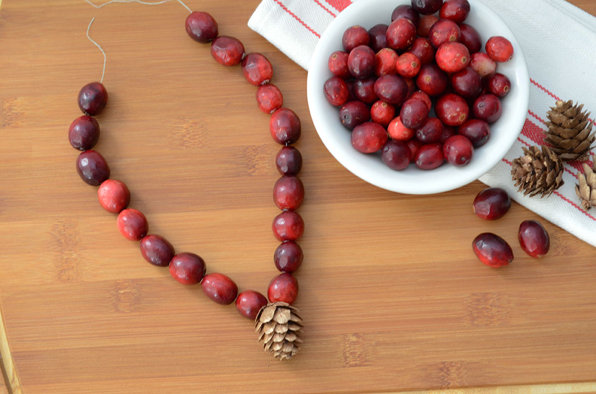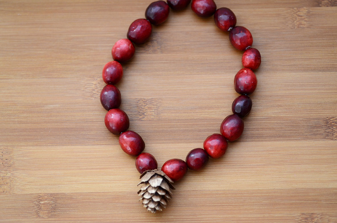 Determine the length. We made necklaces and bracelets. I simply string the cranberries together by placing the needle through the middle of each cranberry. We added a pine cone to the middle as an accent.