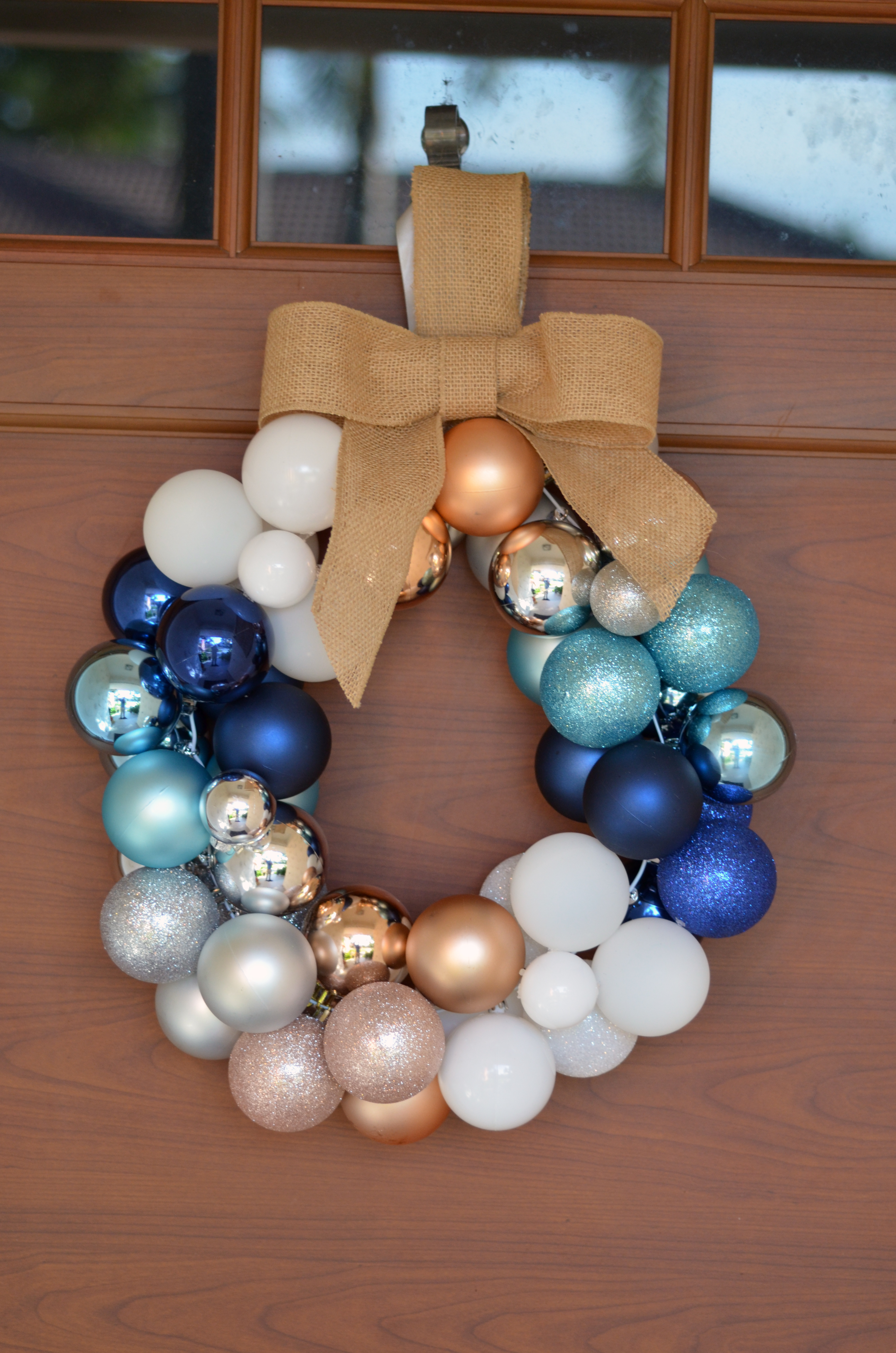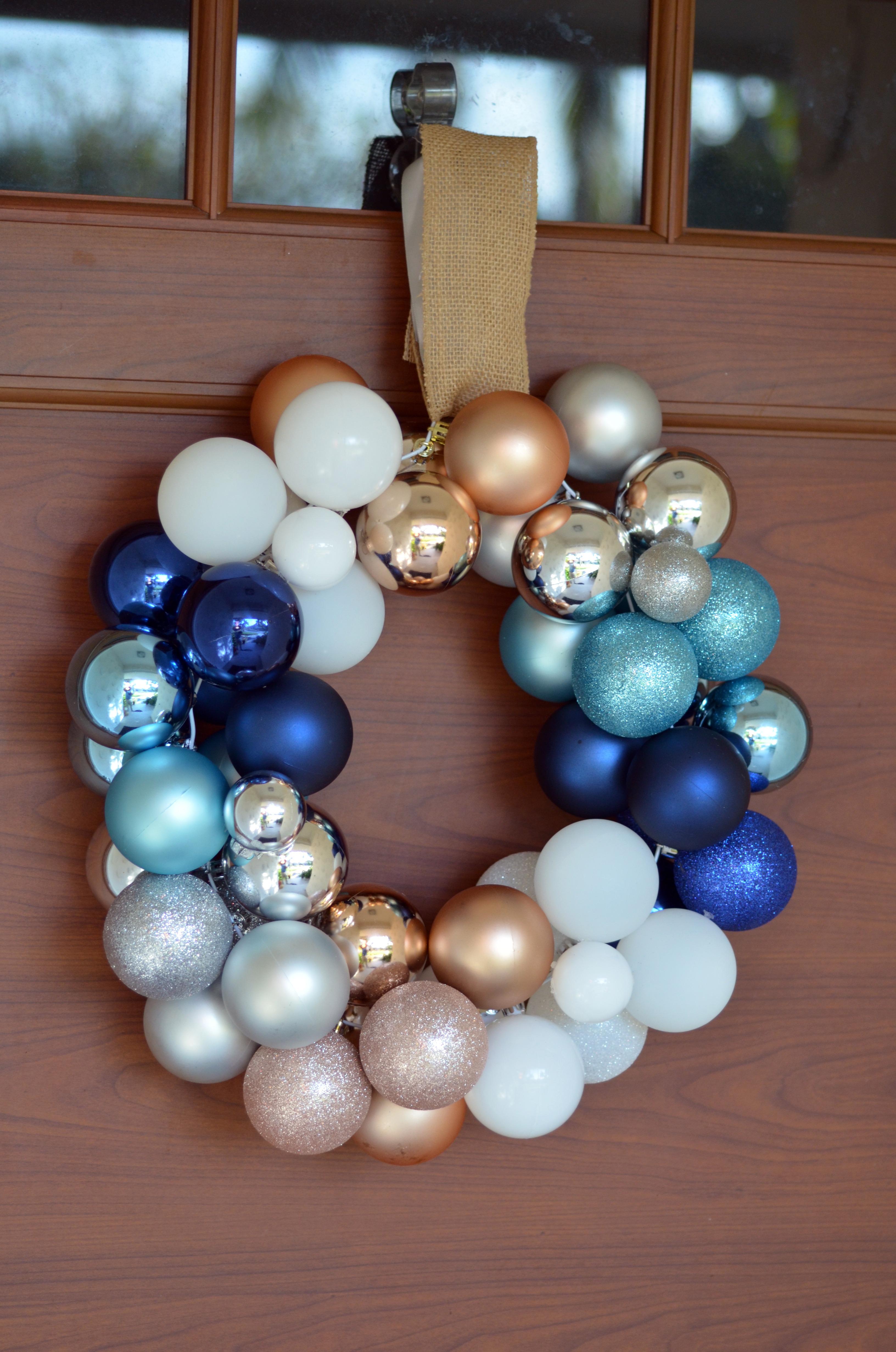 Pro Tip: Mix large and small ornaments.  Can you use one color or mix multiple colors.  If you use more than 1 color I recommend doing 4 of the same color in a row.  Some of the ornaments will be on the backside of the wreath and some on the the front so you end of not seeing all them.