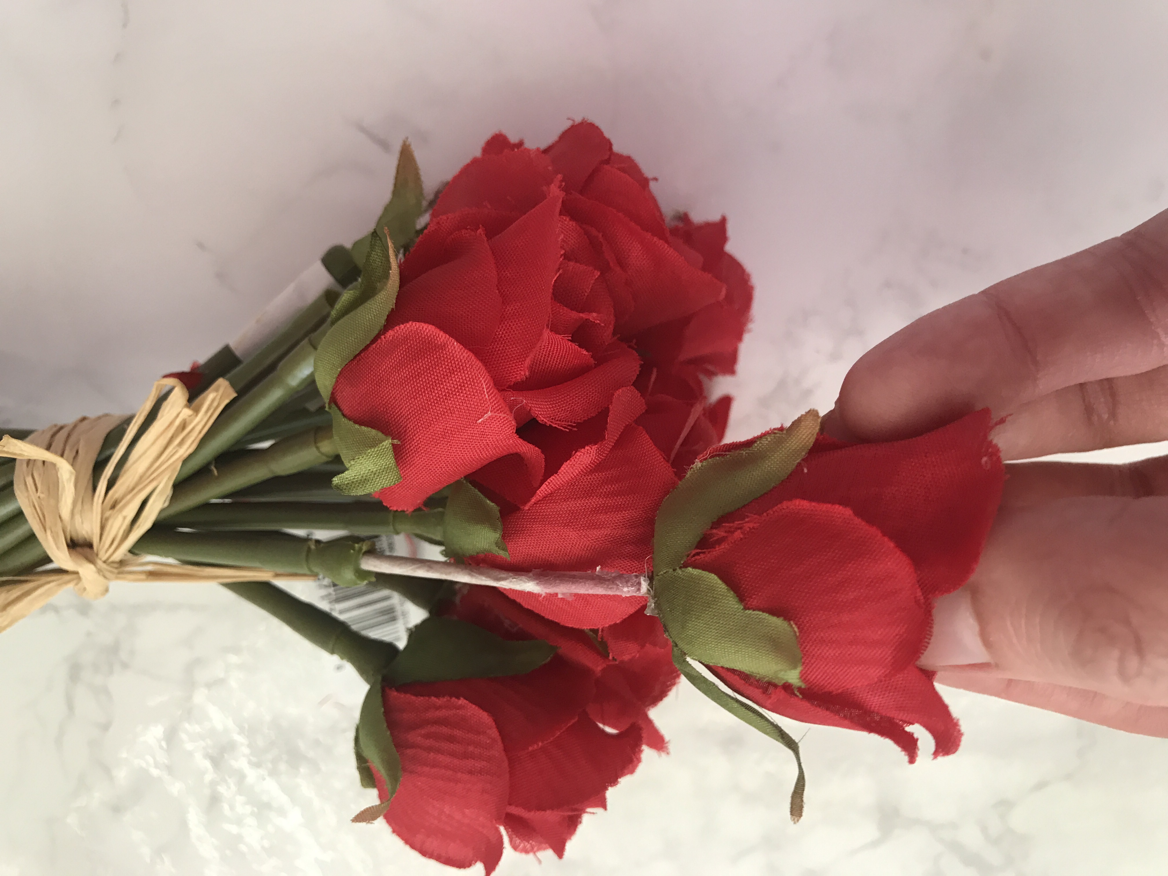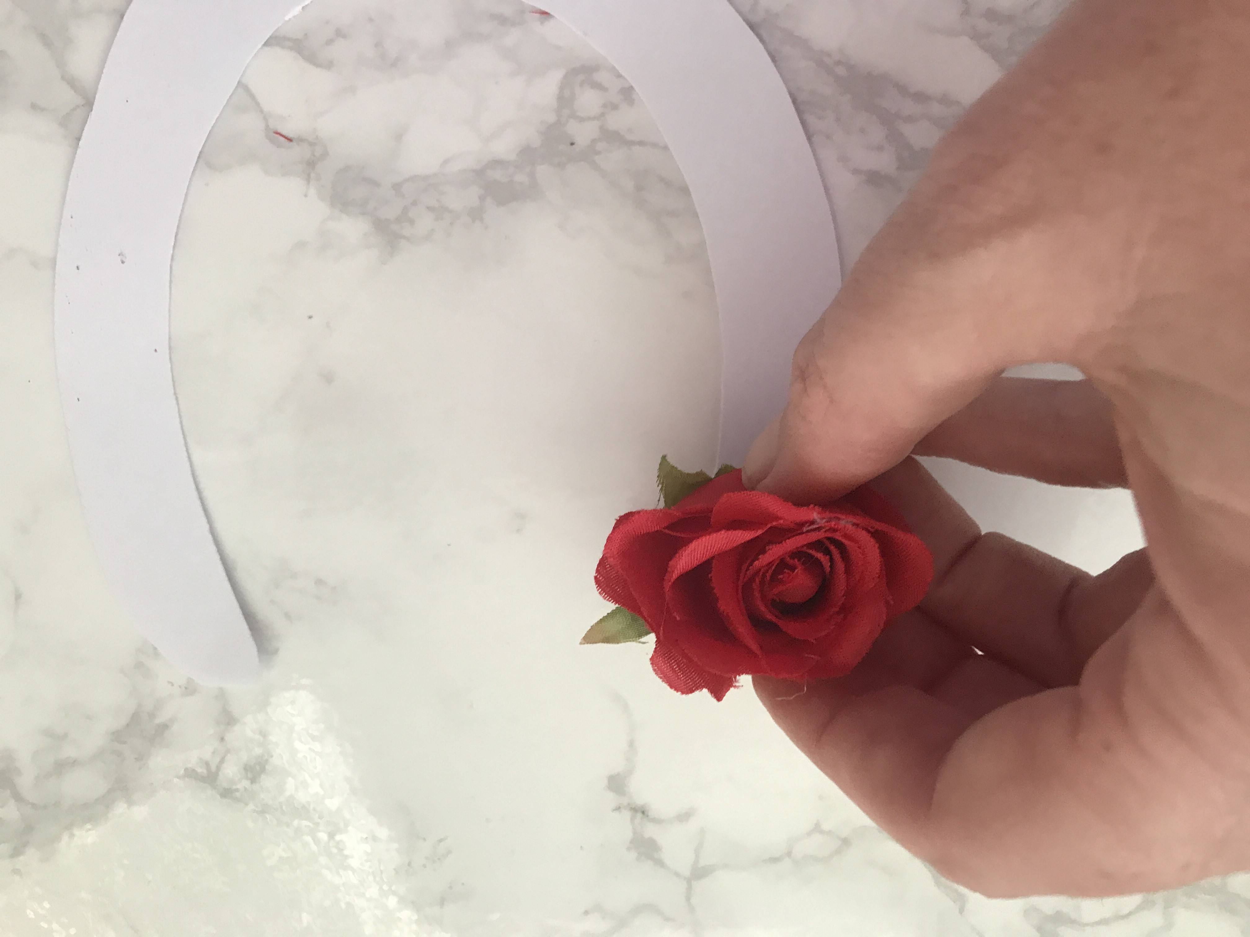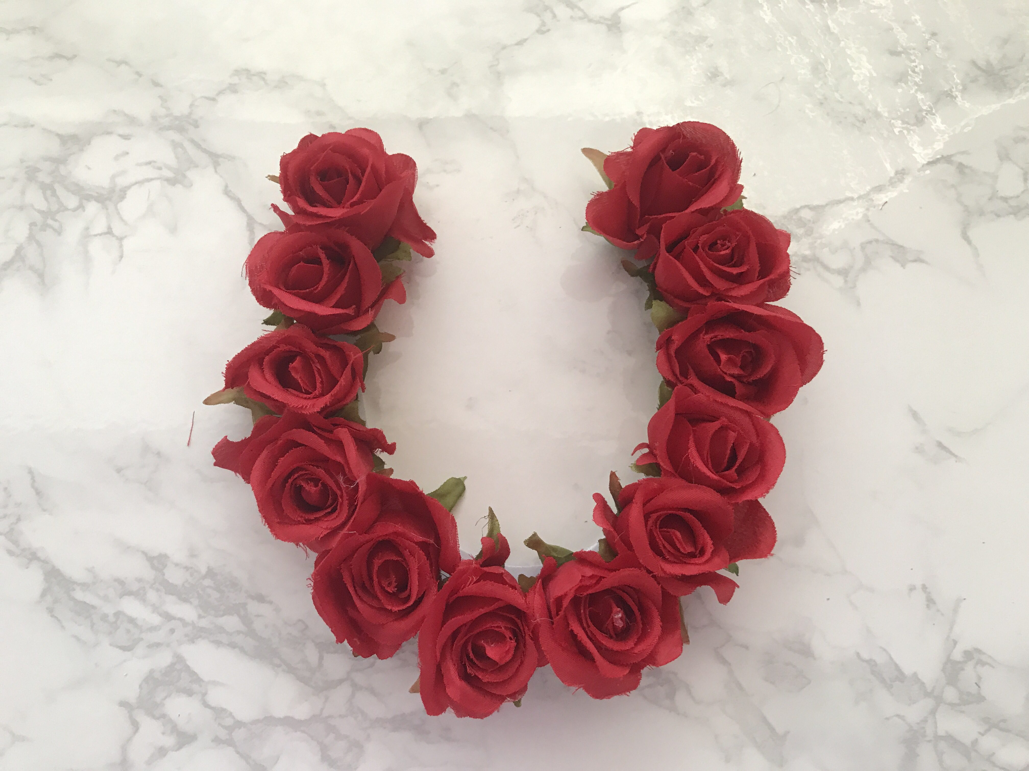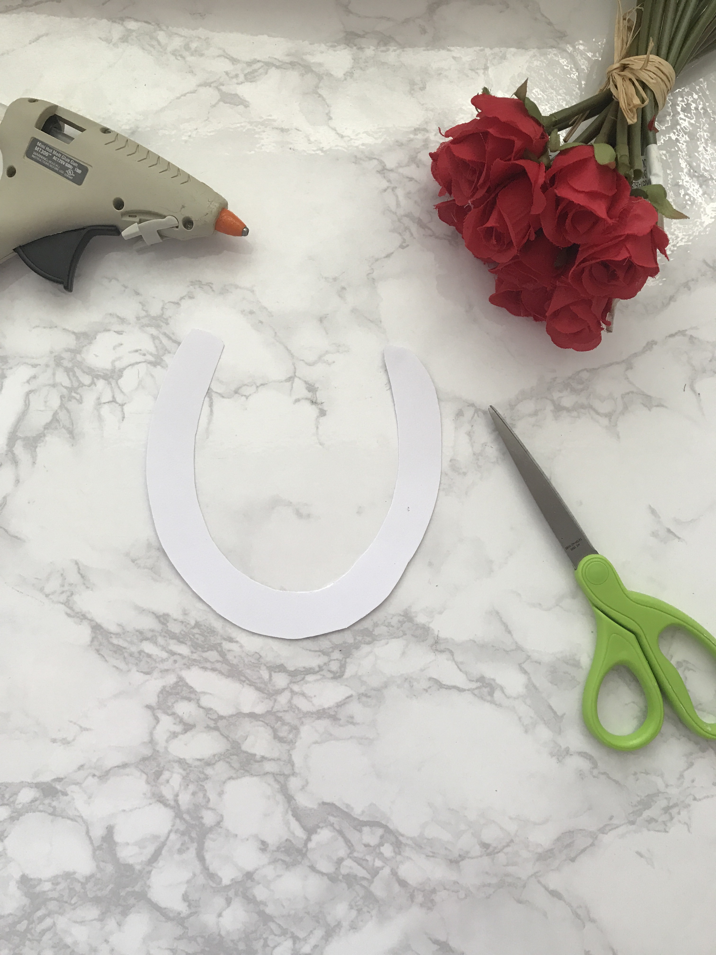 I wanted to include pops of red roses since they screen derby party. I made these super easy horseshoe in red roses. To make it I simply cut out the horse shoe shape. Then I took fake mini red roses and removed the stems. Hot glued them onto the paper. I love the way it turned out.
