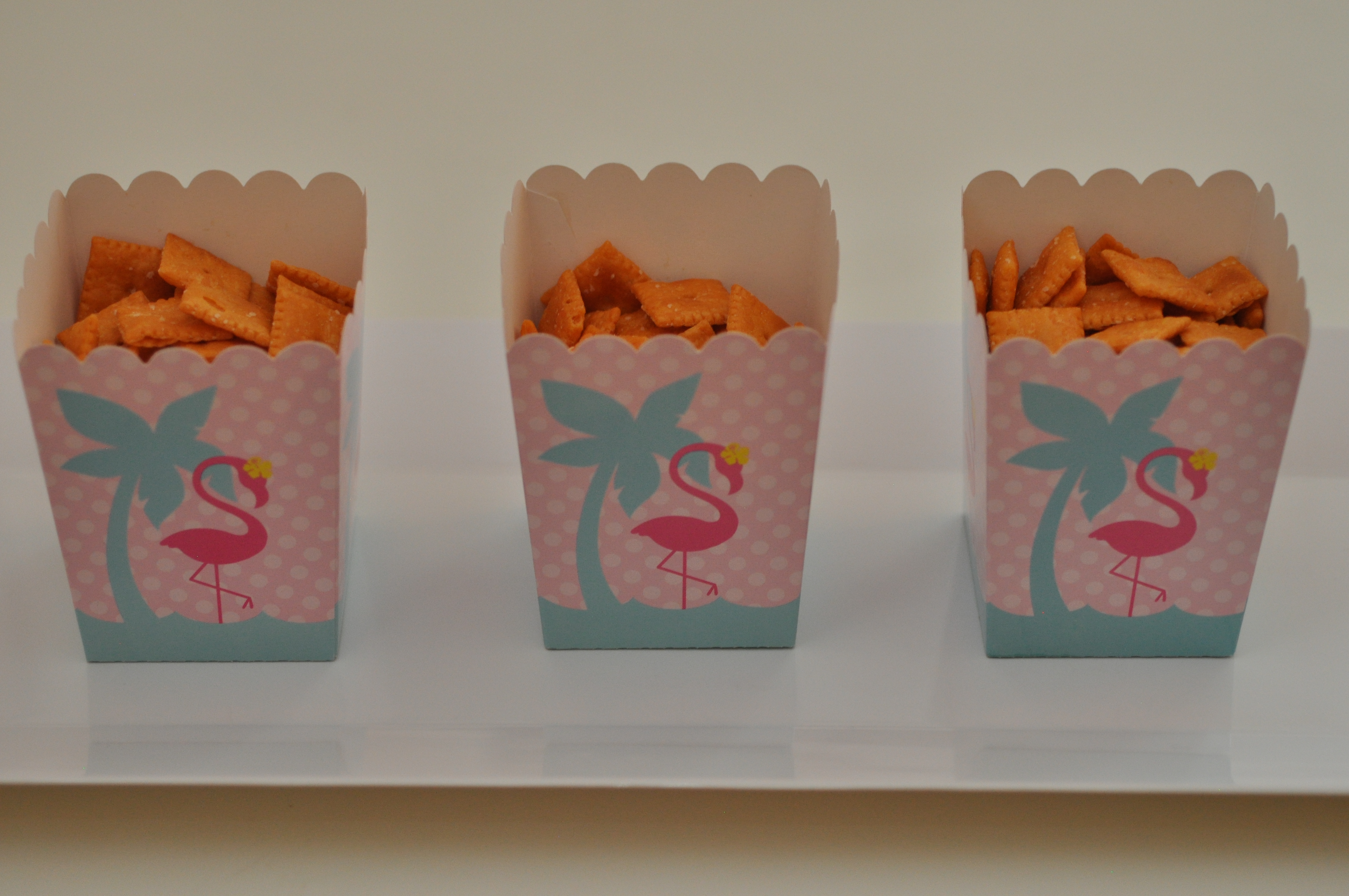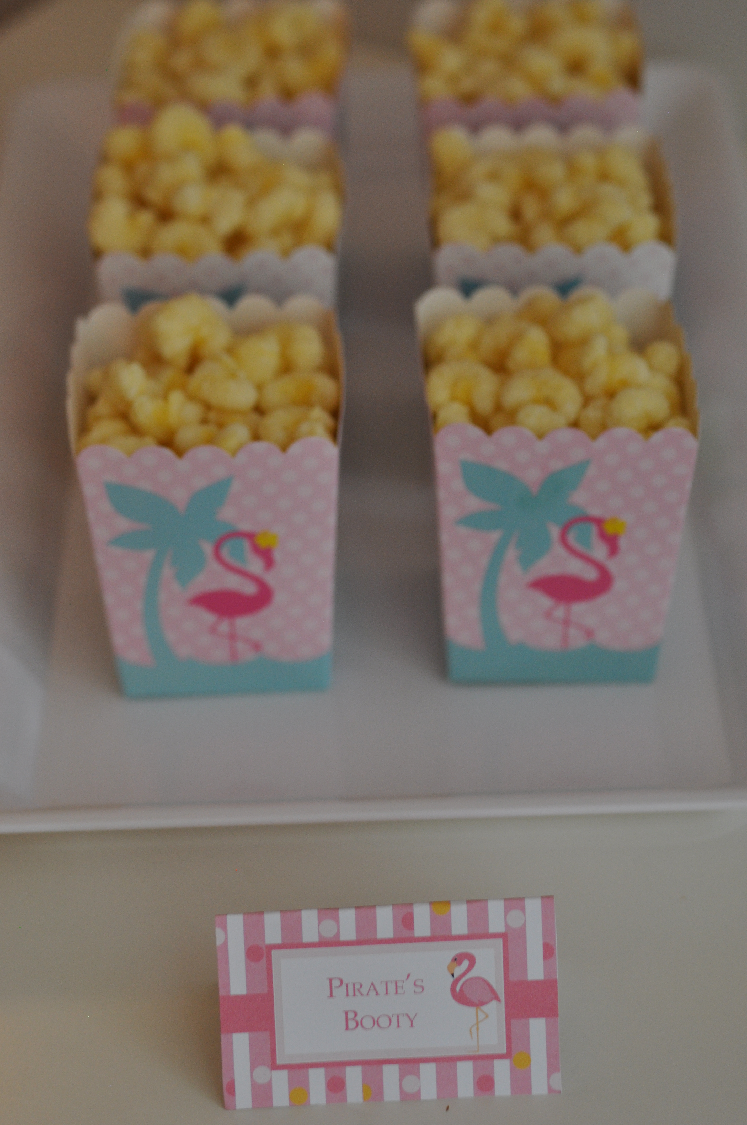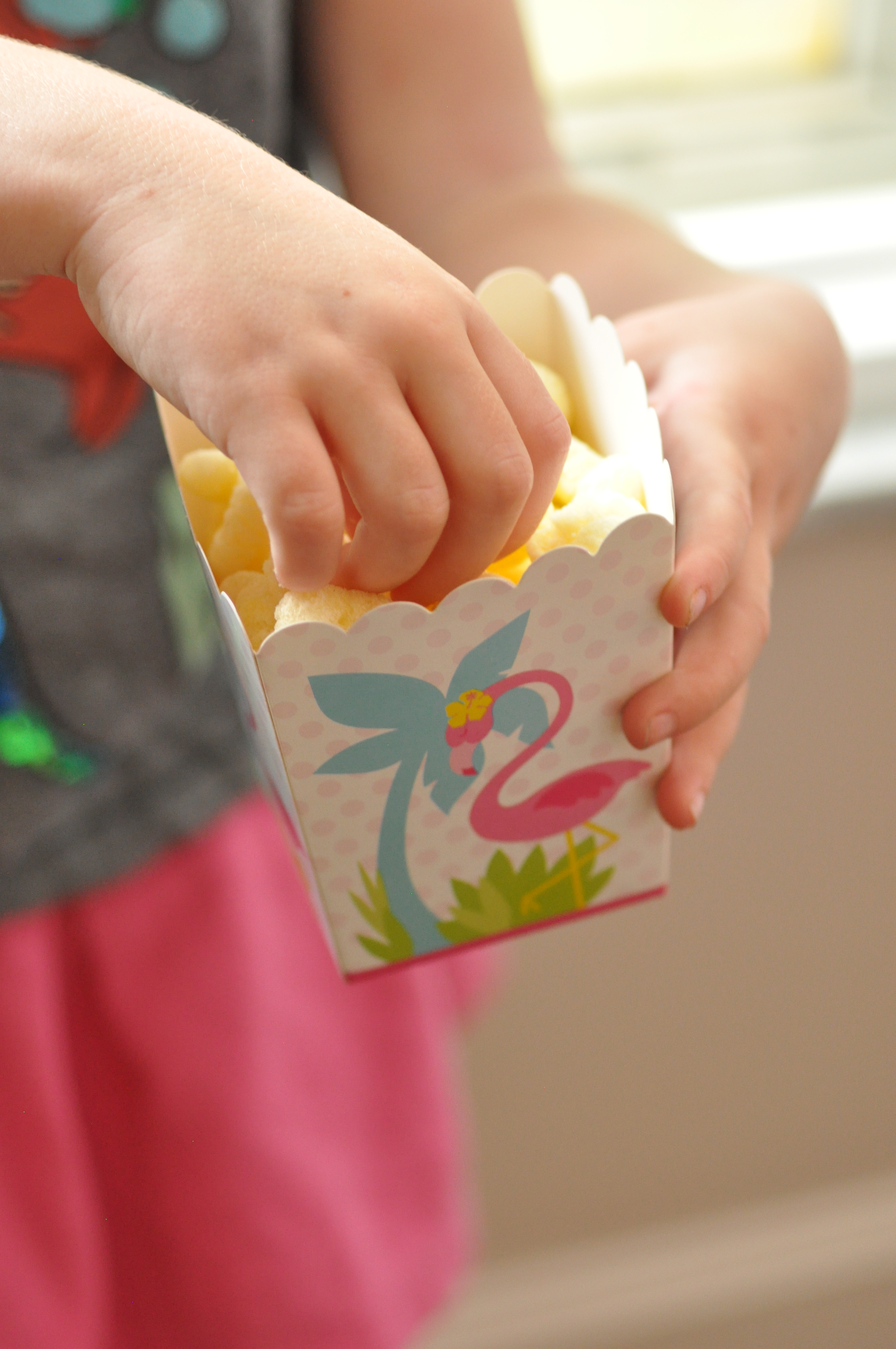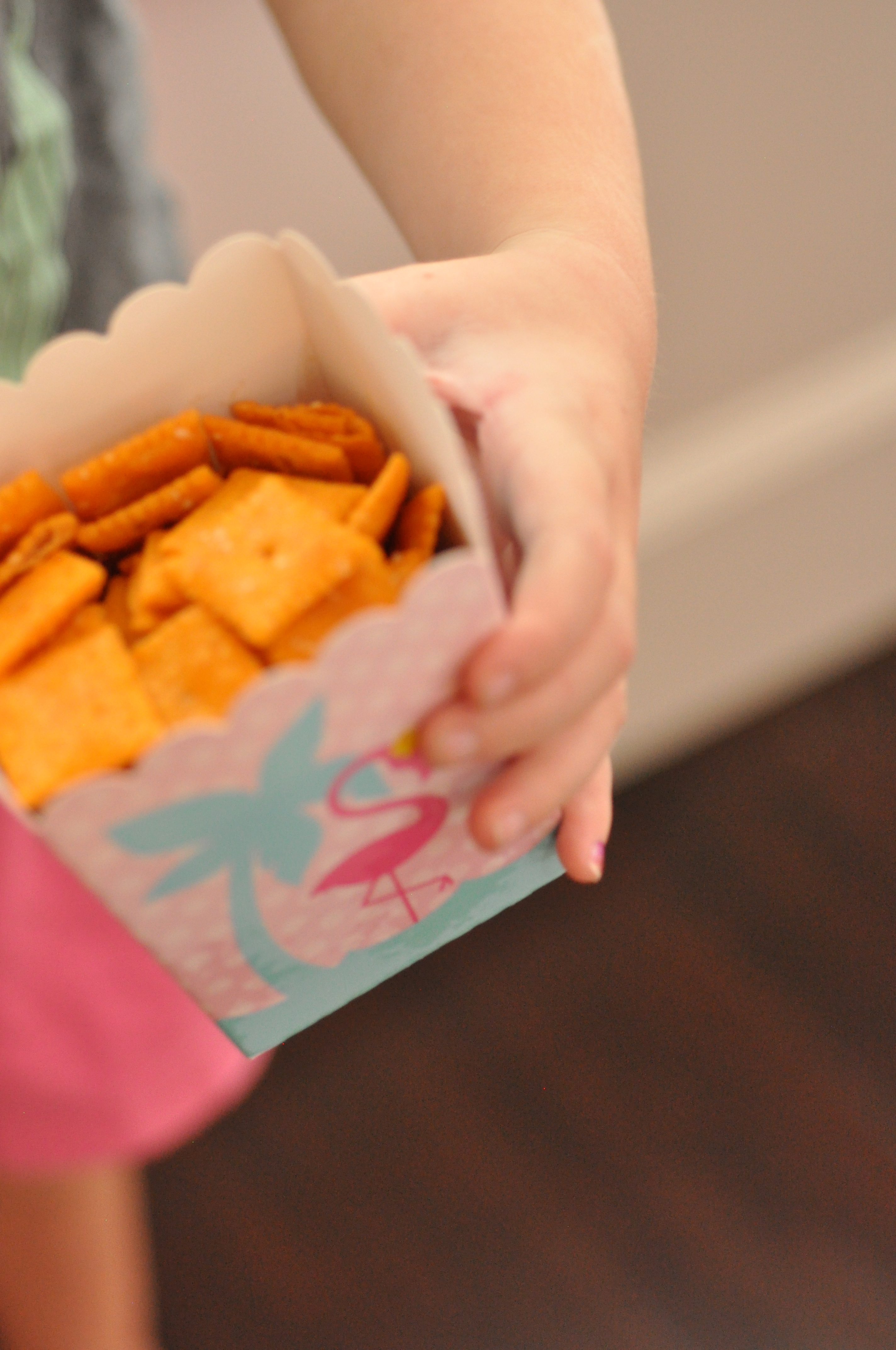 I love for the food to reflect the guest of honor so we had Bailey plan the menu. Grapes were perfect for our Flamingo Treat Stand. "We" being my dad cut the watermelon into Flamingo shapes using a cookie cutter. The Flamingo Popcorn Boxes were the perfect containers for the Pirates Booty and Cheez-its. Pizza was always a hit with the kids.