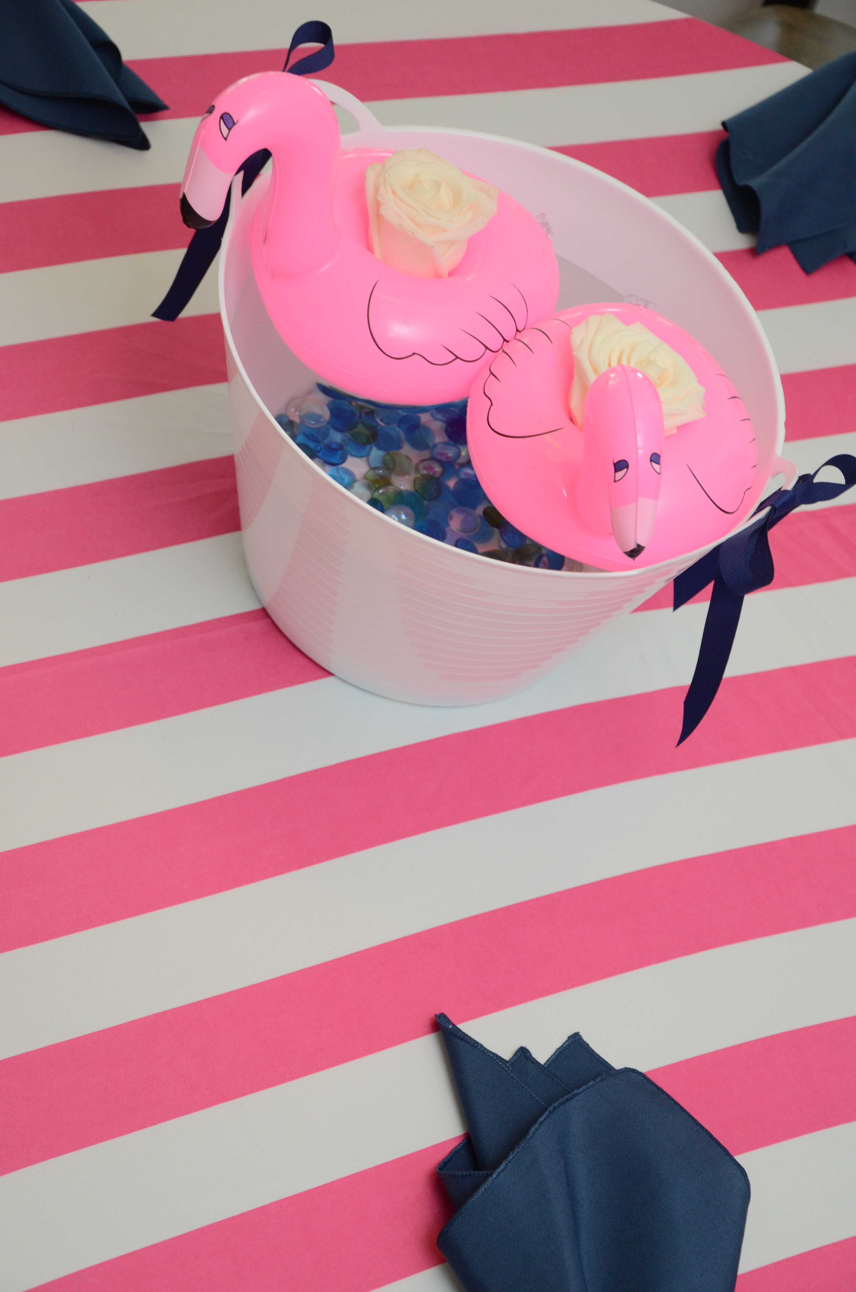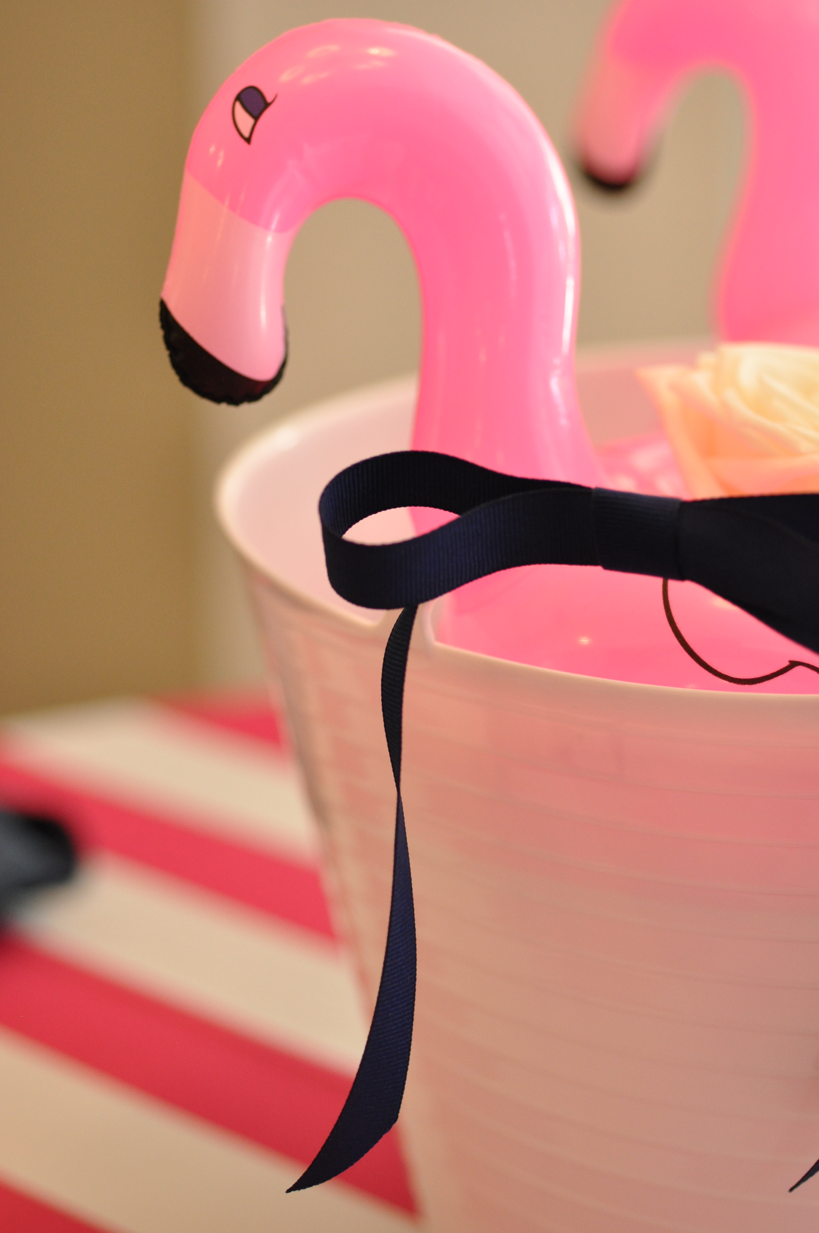 We included a navy bow on each handle to tie in our navy chairs. Fresh flowers make me happy so I like to include them in all my parties. A single white rose in each of the Flamingos filled in the coaster perfectly. I was so in love with the table I set up our dining table when we got home so I could continue to enjoy them. We will be enjoying the Flamingo Coasters for years to come, not just for another Flamingo Birthday Party, but in our pool.