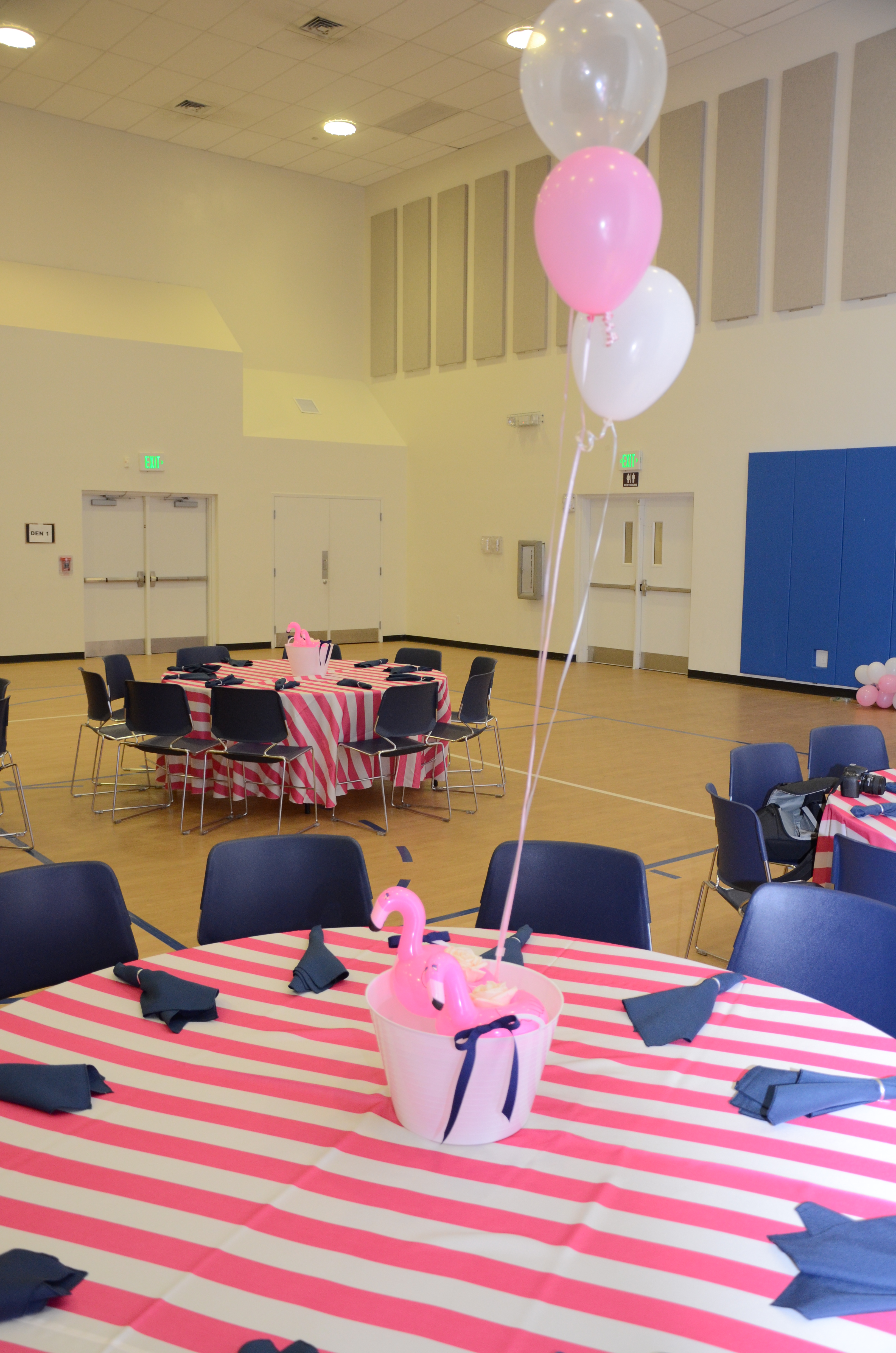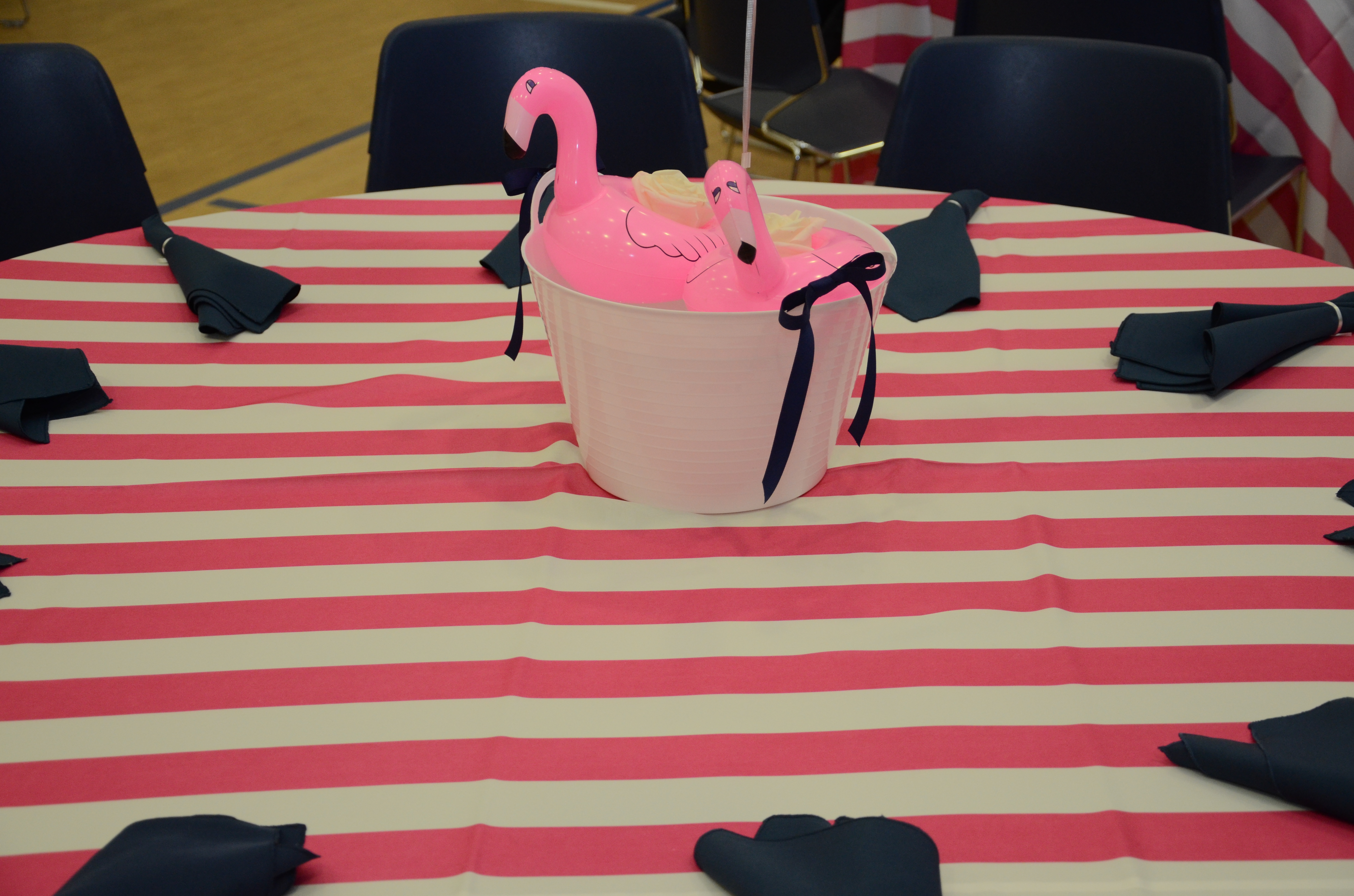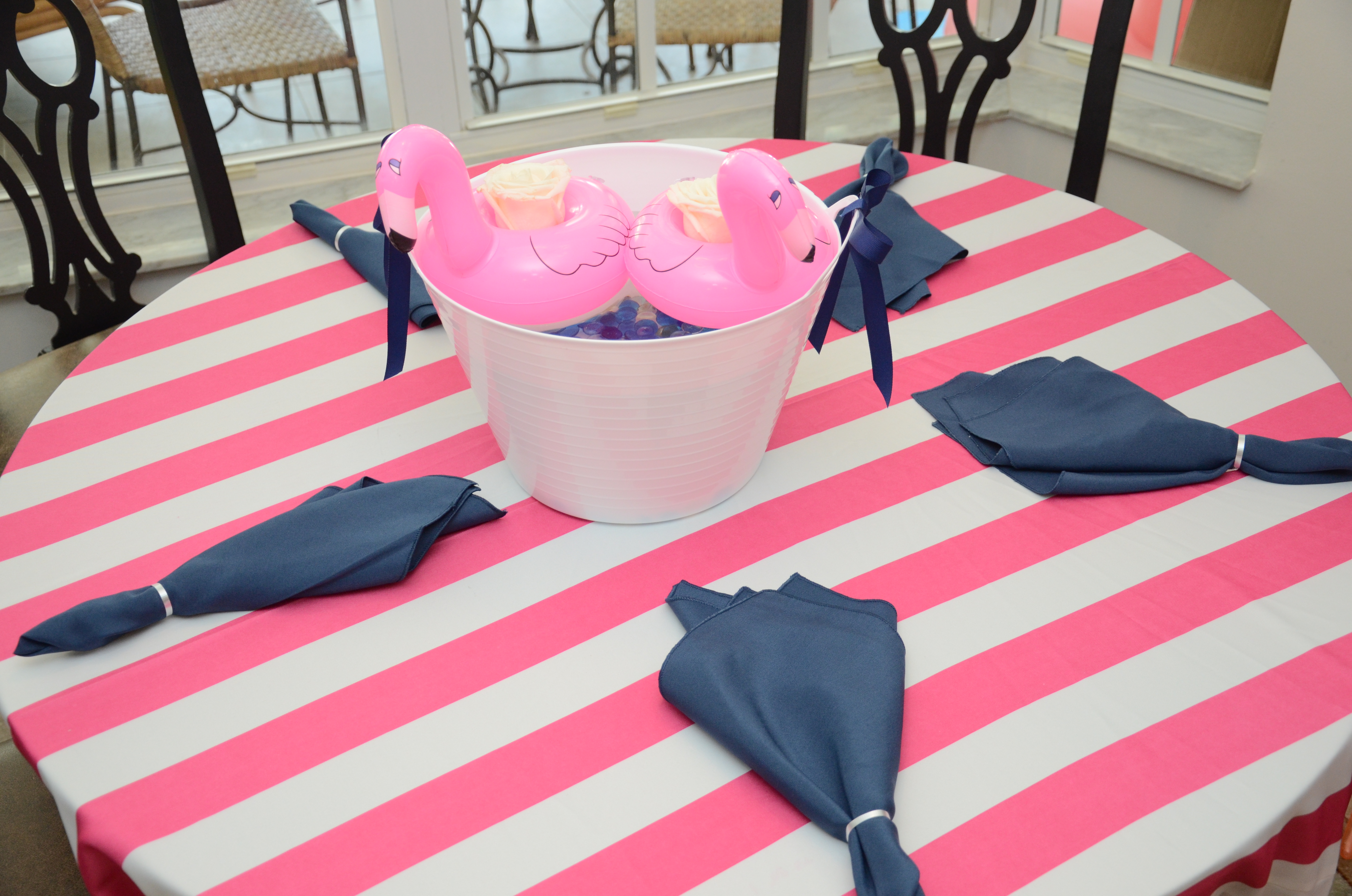 A rental of 6 table linens and 70 napkins is a small order for their team, but they treated us like we were VIPs. Sharron showed us all the options that coordinated with our Flamingo centerpieces and let us setup tables until we were 100% happy. It was an amazing first experience for me and my mini-planner! The navy napkins with a white tie were the perfect way to make it look like we wanted blue chairs. Some friends even asked if I had rented chairs.