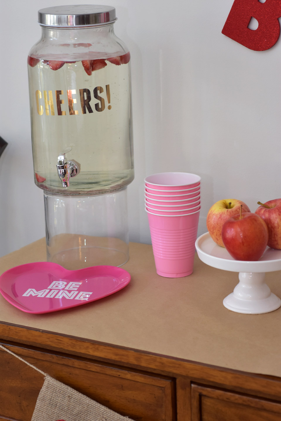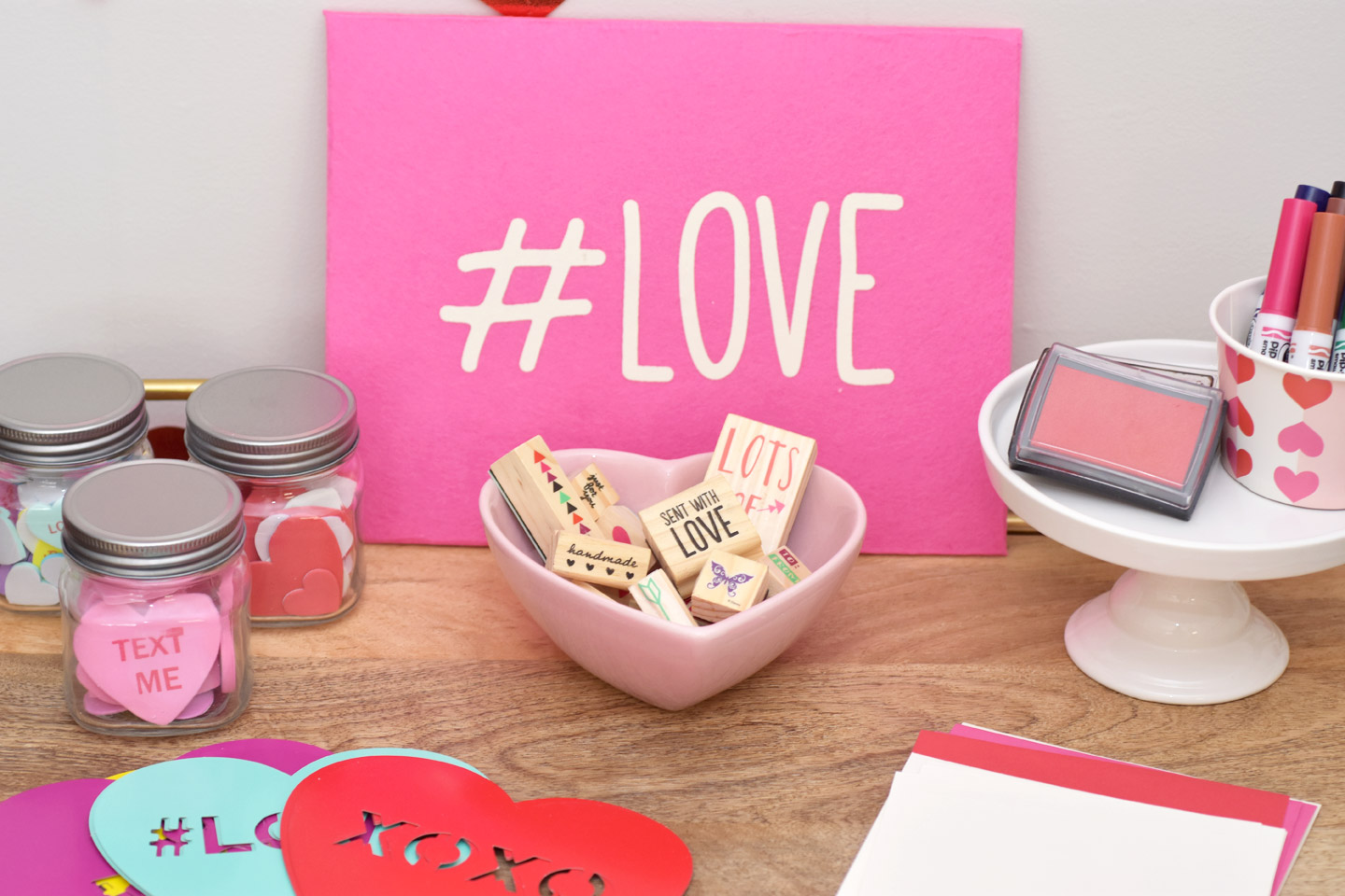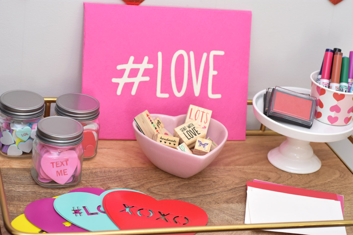 Organize your supplies in a fun way. We started by hanging strings of hearts as a backdrop behind our bar cart. I love how this turned out. It was also the first thing that guests saw when they walked in the door. We used matching bowls to store the markers to tie in our supplies to our table decor. I love these text me, tweet me stickers we stored into in mini mason jars so the girls could easier move them over to the table with them. The heart bowl also from Target was a fun way to store all the stamps. I love using cake stands for food and non food items.