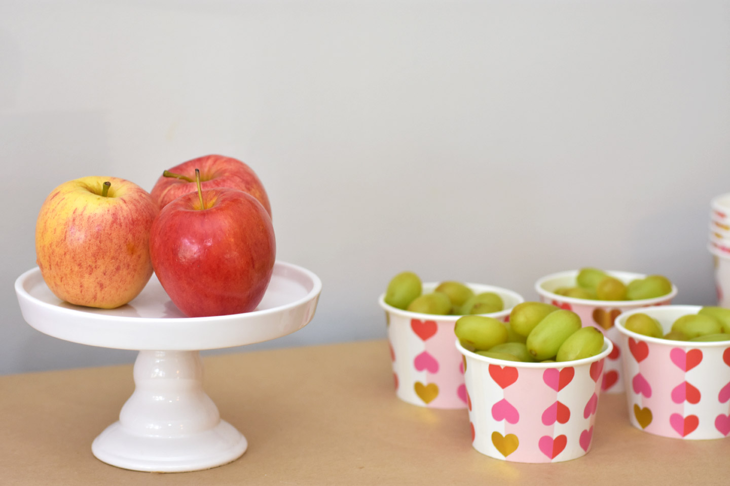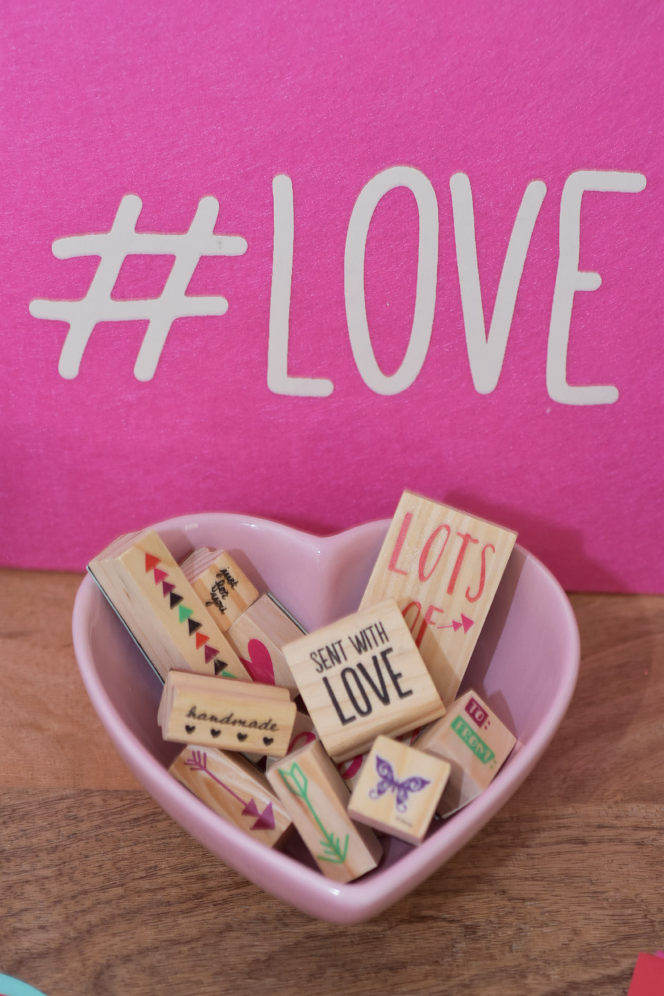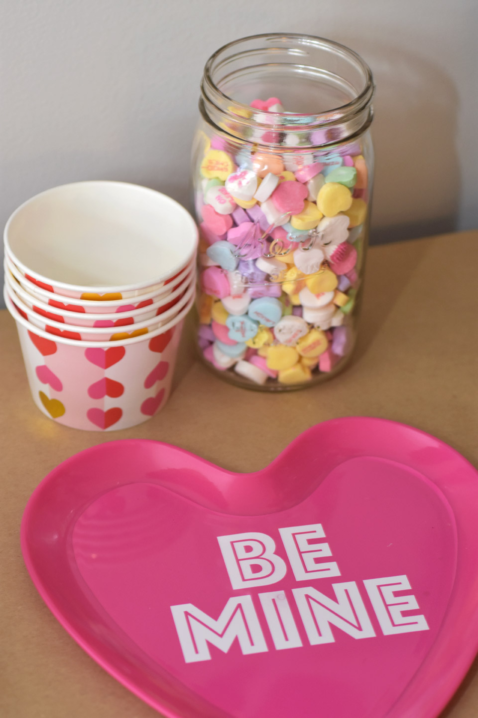 Organize your supplies in a fun way. We started by hanging strings of hearts as a backdrop behind our bar cart. I love how this turned out. It was also the first thing that guests saw when they walked in the door. We used matching bowls to store the markers to tie in our supplies to our table decor. I love these text me, tweet me stickers we stored into in mini mason jars so the girls could easier move them over to the table with them. The heart bowl also from Target was a fun way to store all the stamps. I love using cake stands for food and non food items.