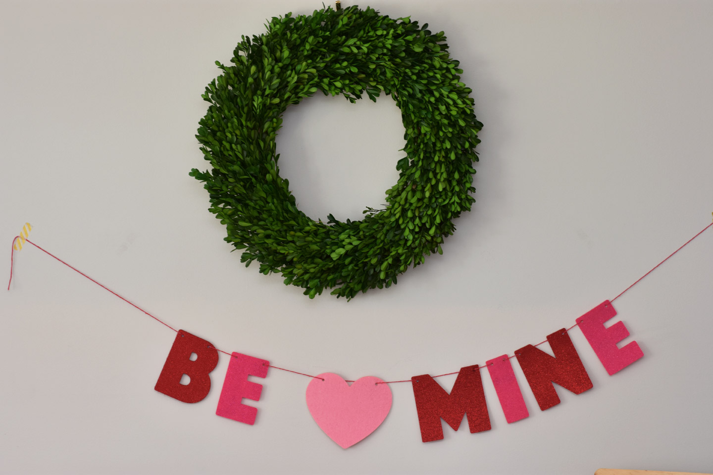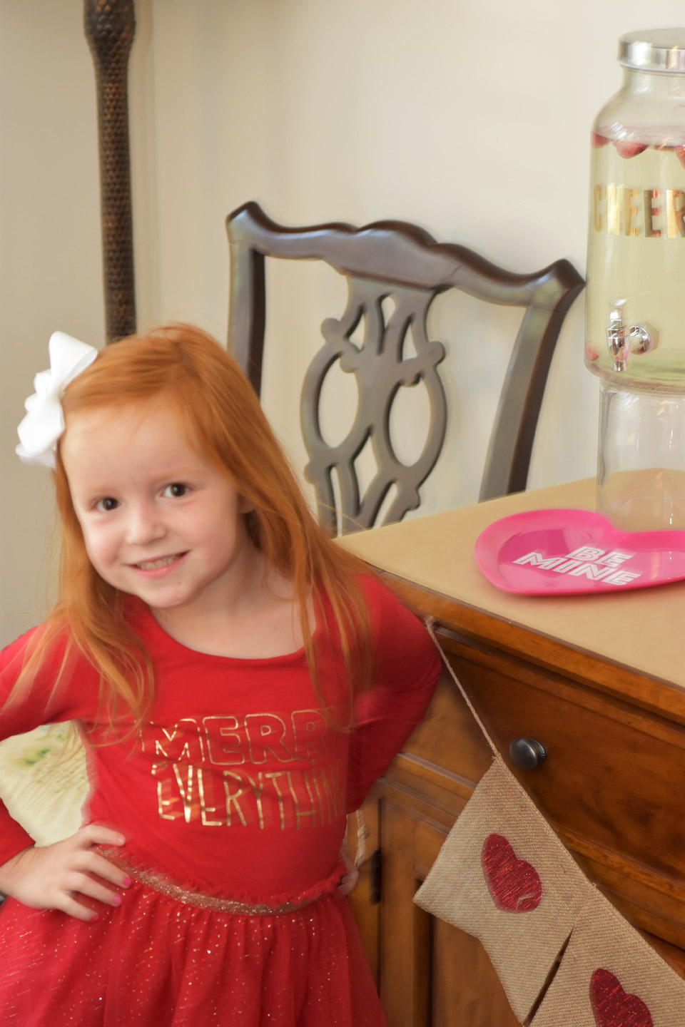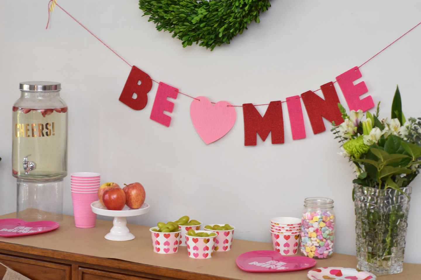For Valentine's Day you can never go wrong with hearts. I love my boxwood wreath and want to leave it up all year. the Be Mine banner worked perfect under it. I added a heart banner below it. We also included lots of balloons all around the room on the floor. They were such a big hit. The girls love just throwing them around the room.