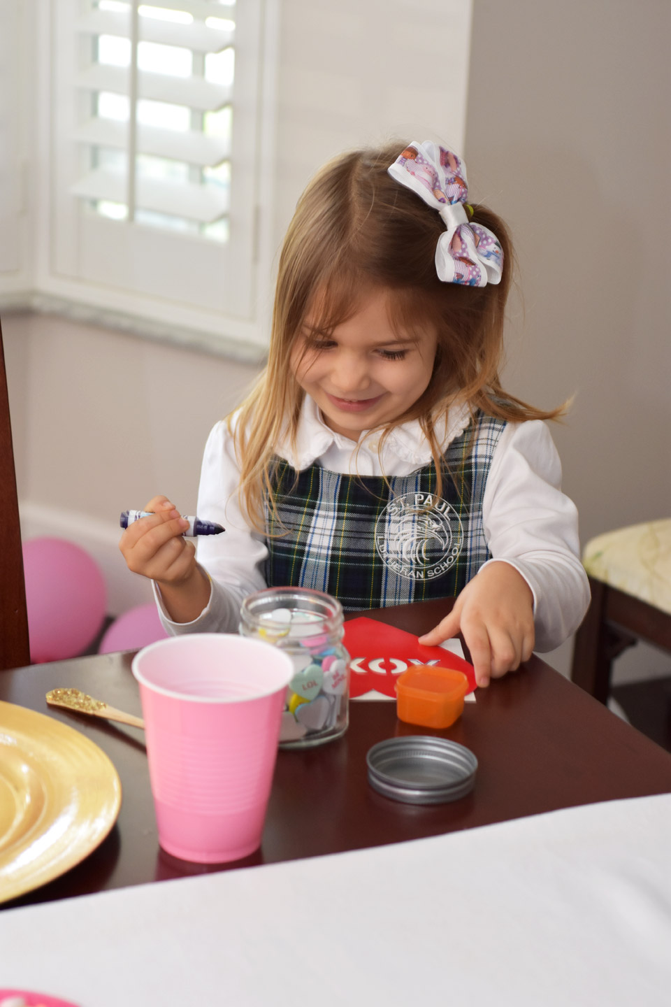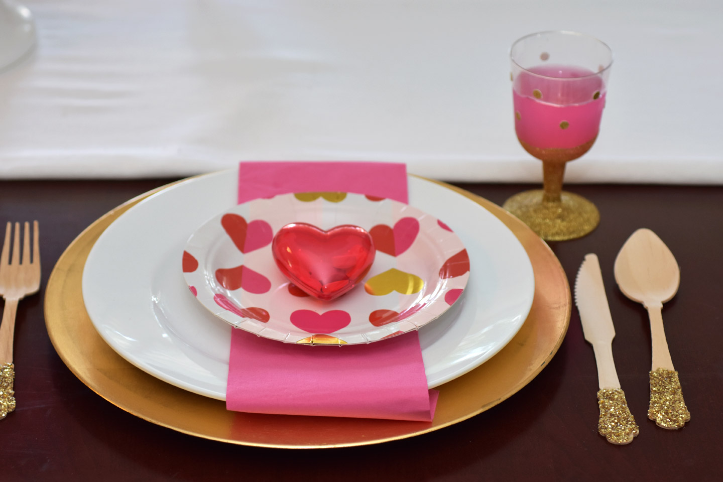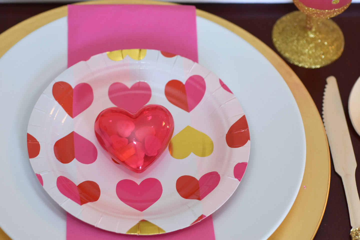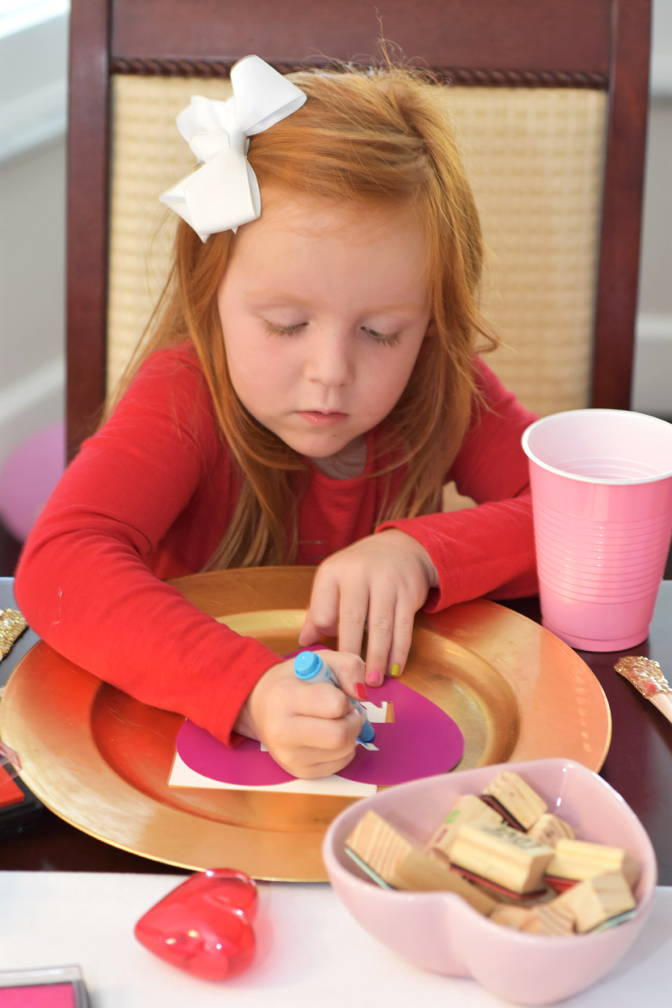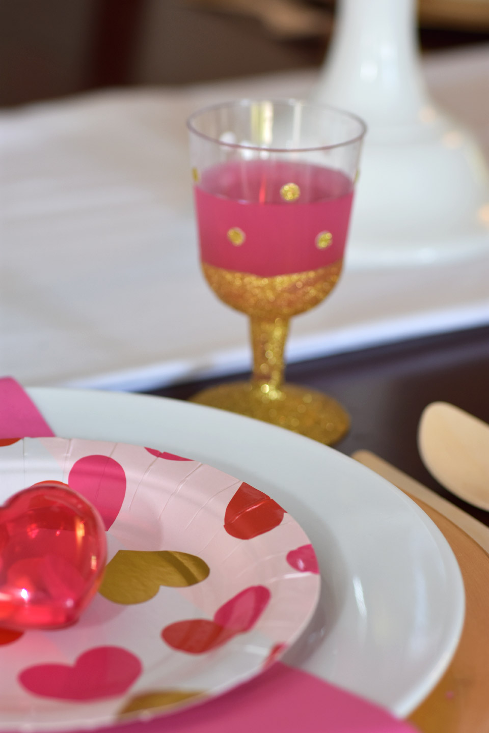 For the table setting you can keep it simple. Pick your color palette. I fell in love with these heart plates from Target. The pink, red and gold set the colors for the party. The silverware was a huge hit. The girls loved eating with extra sparkles. I also recommend using a charger at each place setting. We had the girls do their cards on the chargers just in case the girls colored off the page.