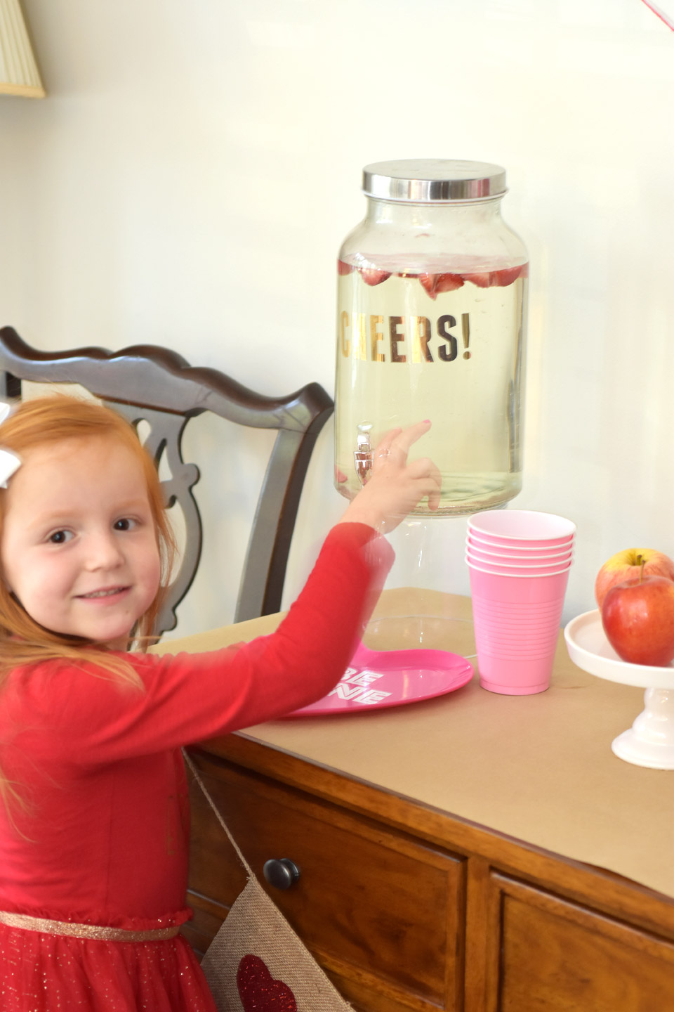 Since we we hosted the party as an after school party we served apples and grapes for snacks. I served each girl one place of pink lemonade. We also had strawberry infused water in our cheers container. The girls loved being able to pour their own drinks.