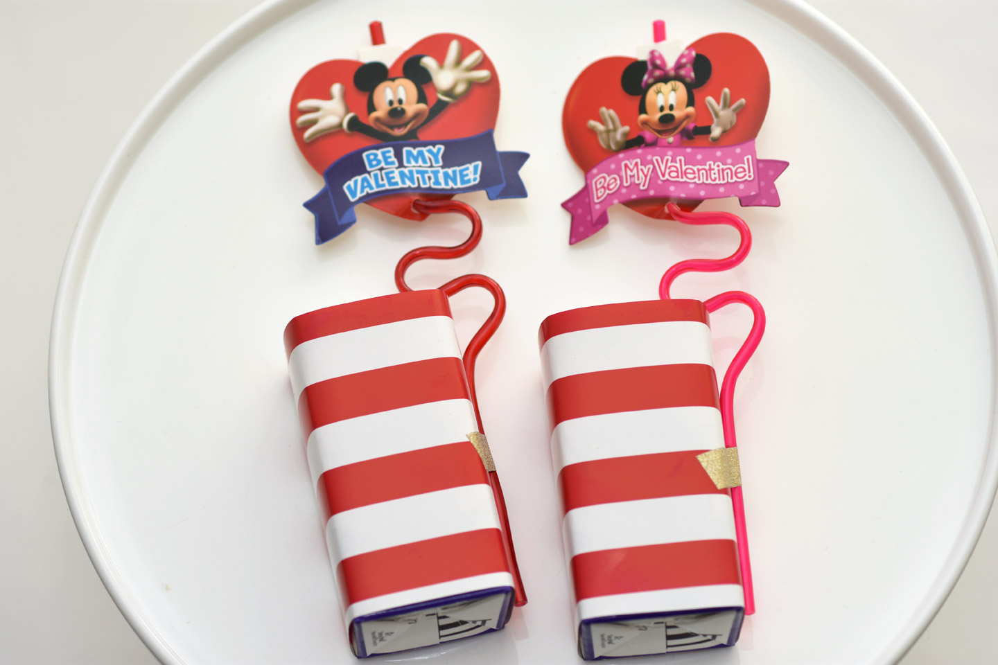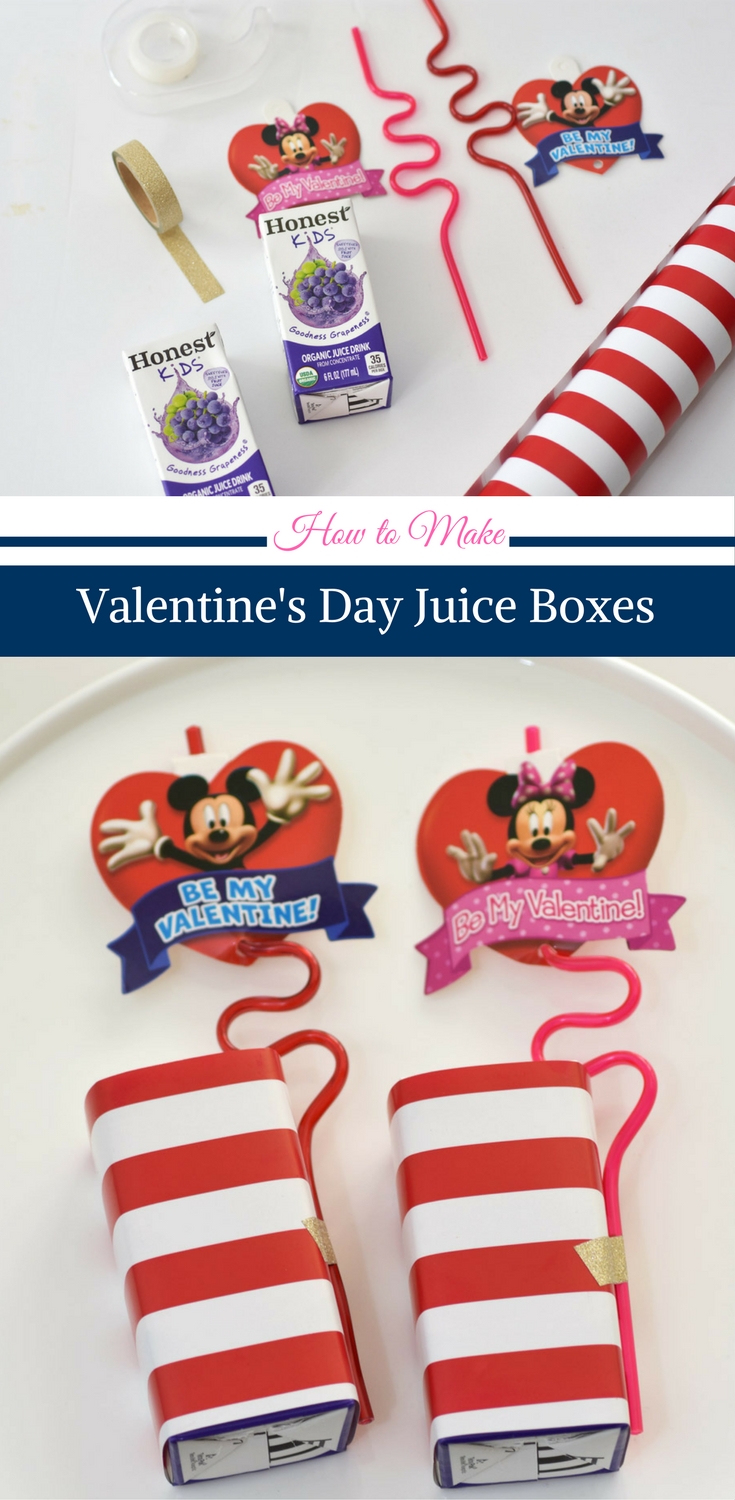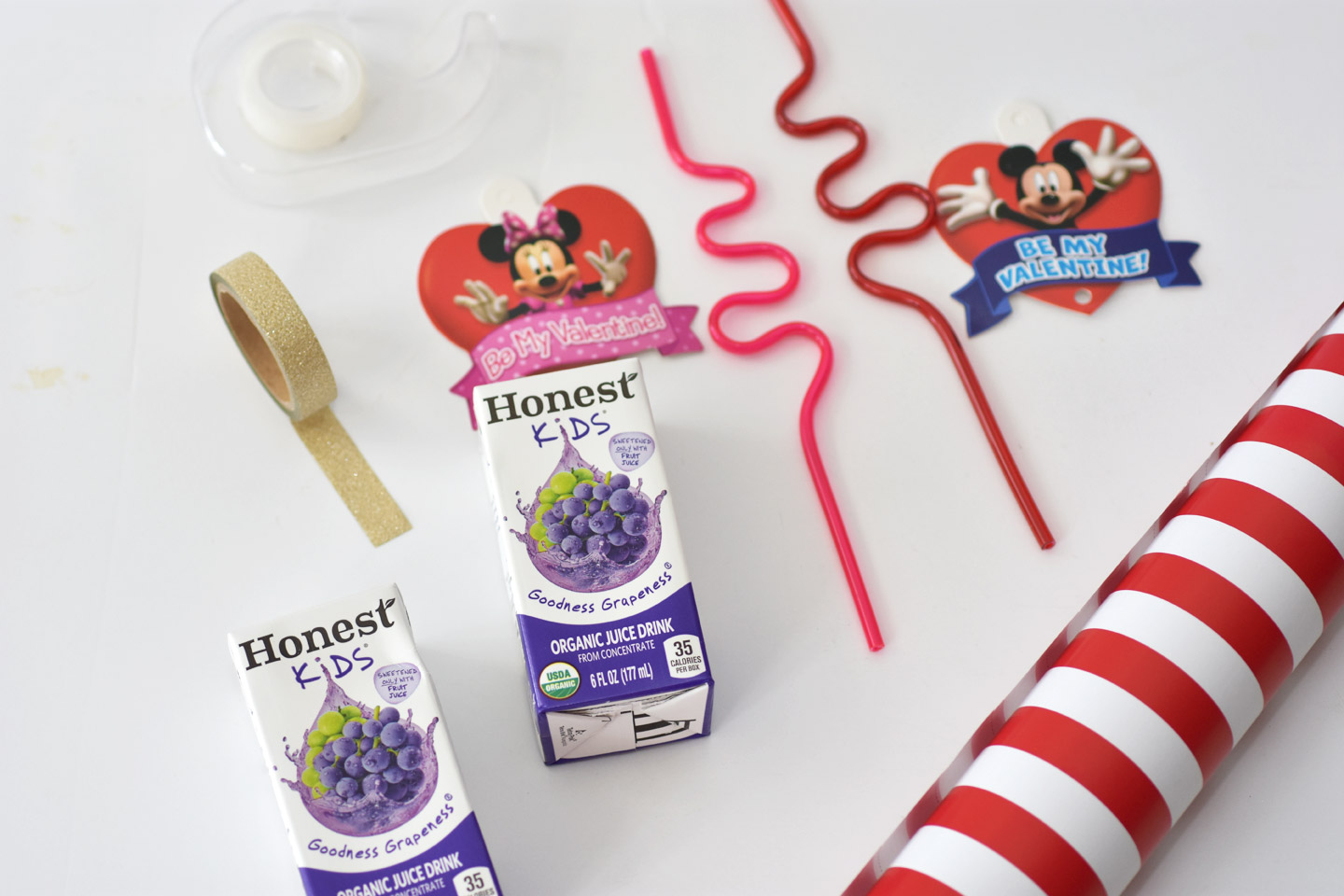 These Valentine's Day Juice Boxes are perfect for an afternoon snack or for a class party. All you need is juice boxes, wrapping paper, tape and a fun straw.