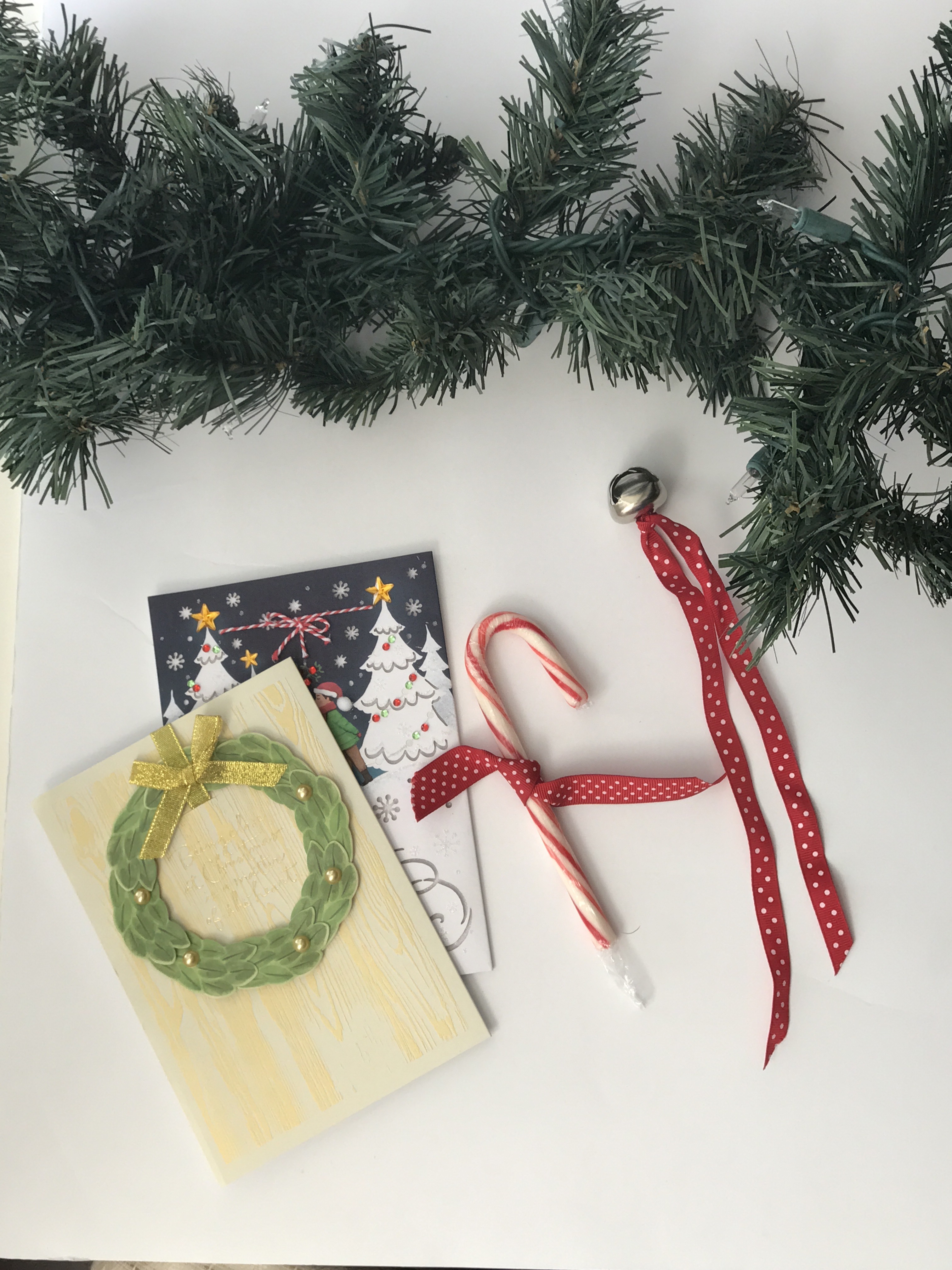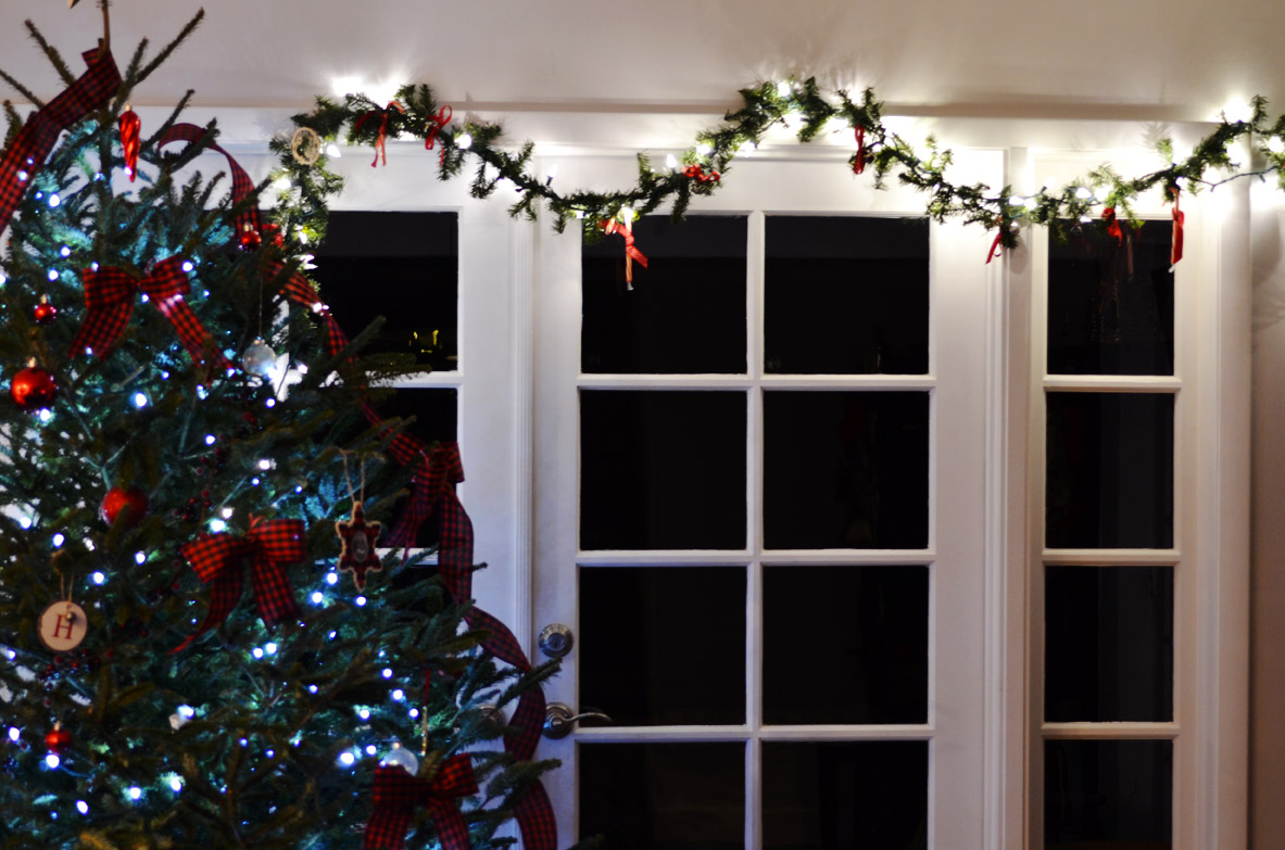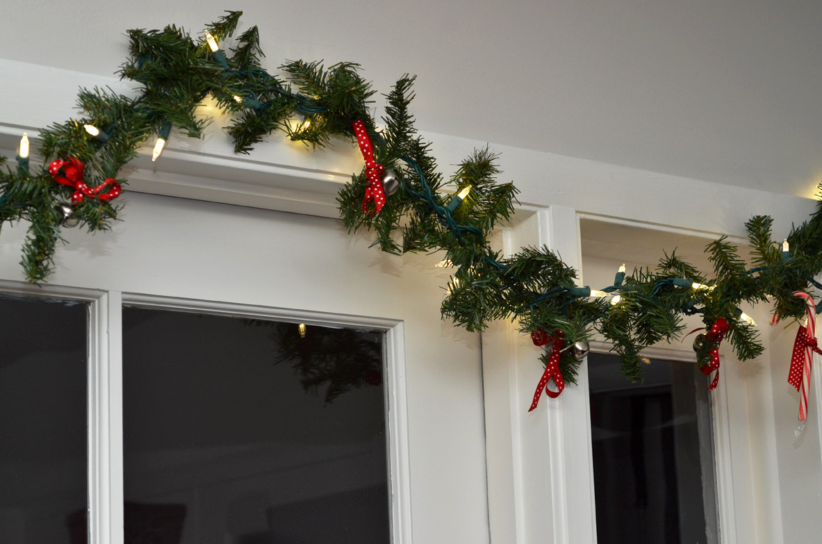 1. Add decorations to your garland. You can use pre-lite garland. I had regular garland and added Christmas lights to it. Then I added candy canes and bells.