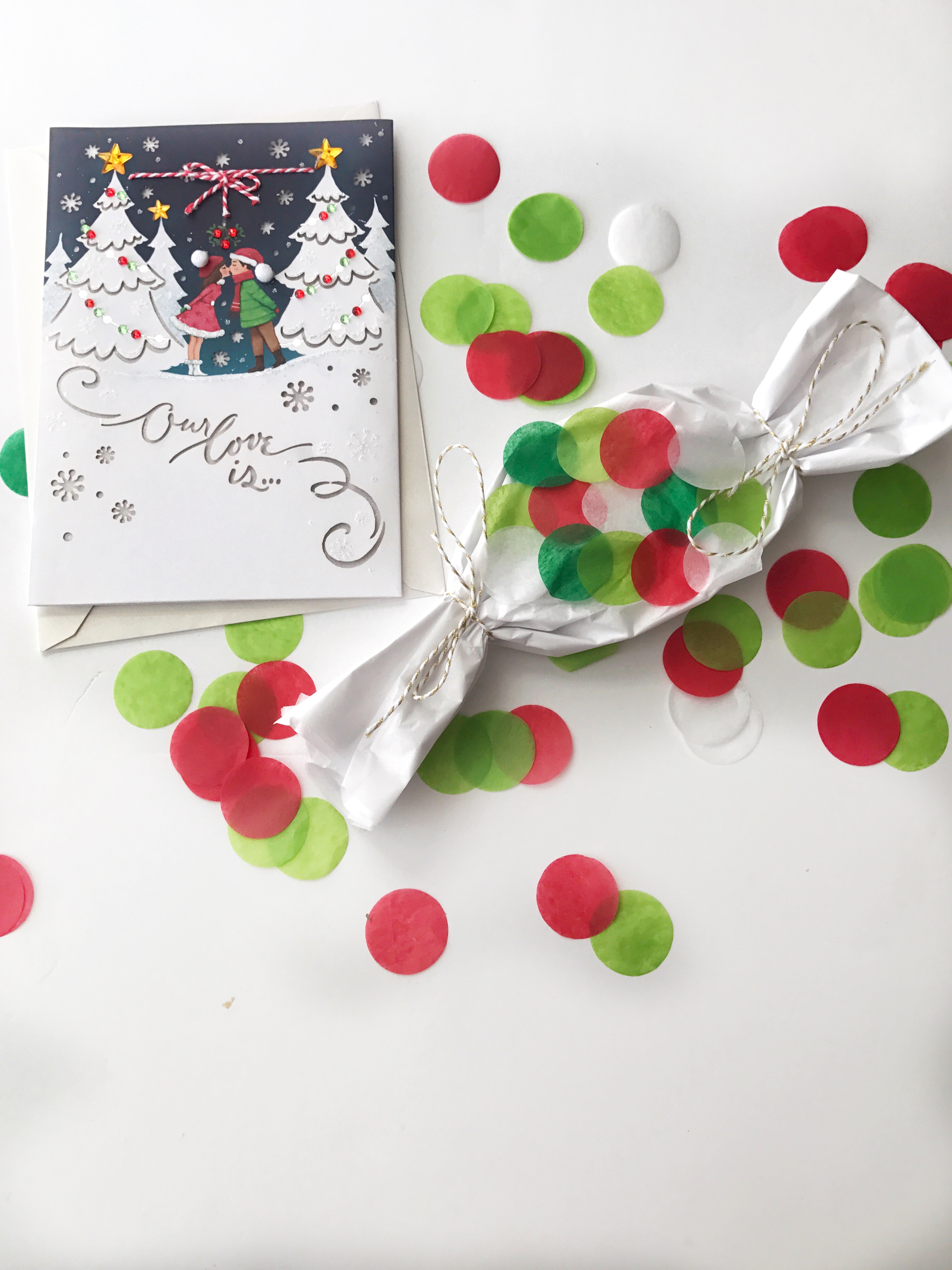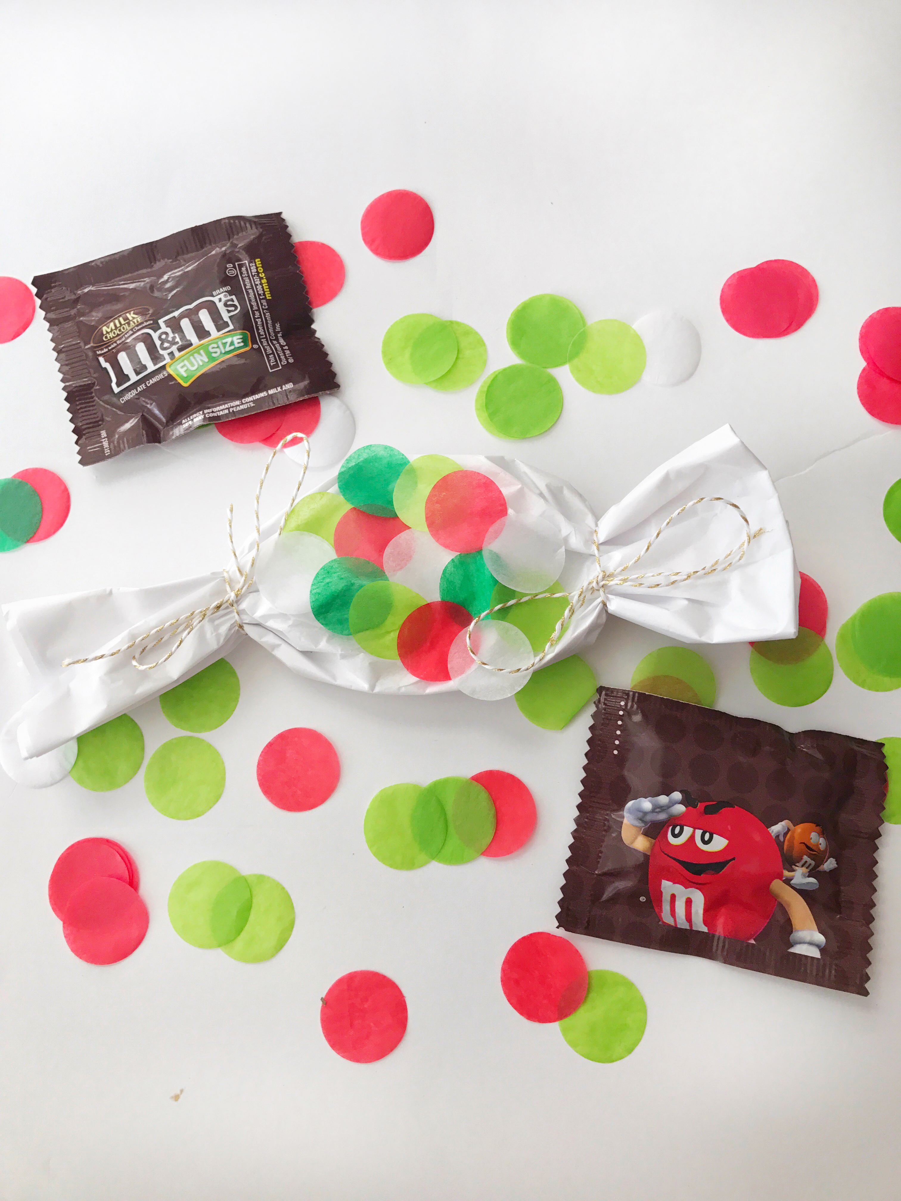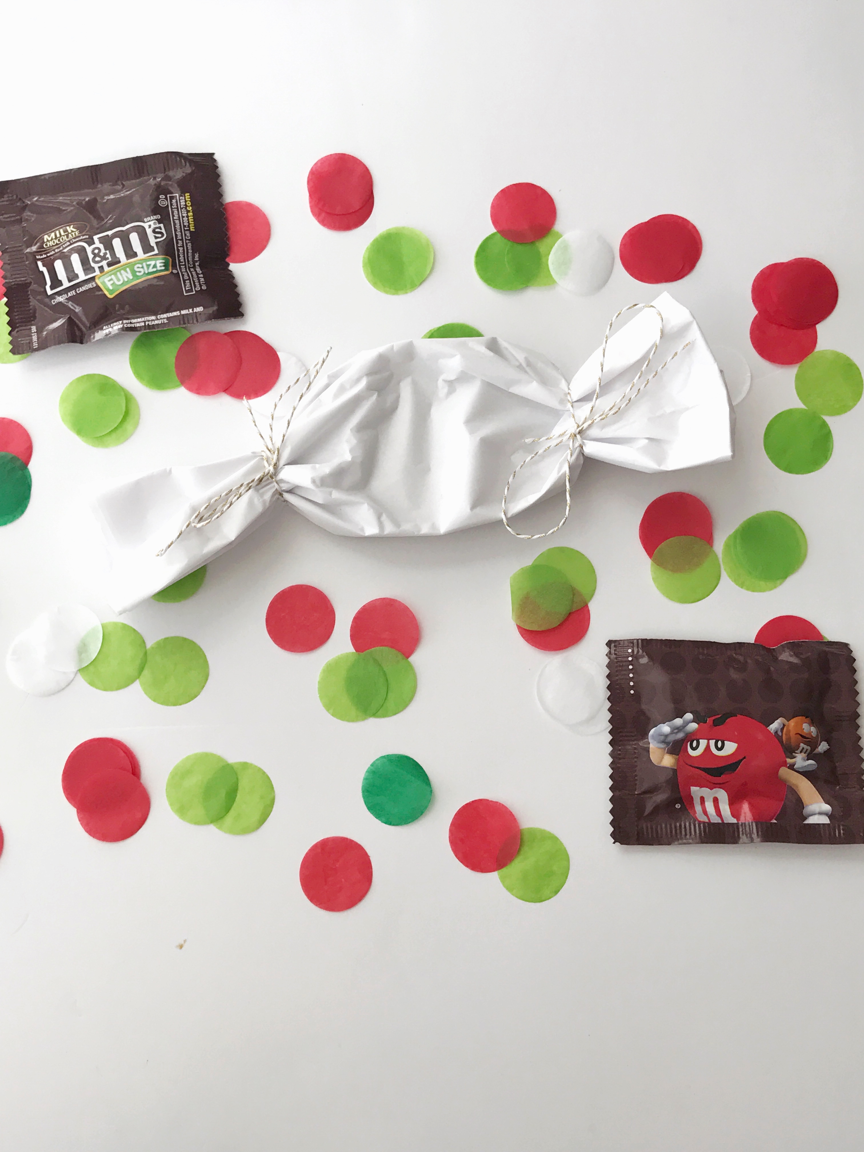 Wrapping is my favorite part of gift giving. I believe presentation is everything and can make anything special. So I wrapped them in tissue paper like a candy. Wrapped the ends in a ribbon. Then I added double sided tape and decorated the package with the tissue circle cutouts.