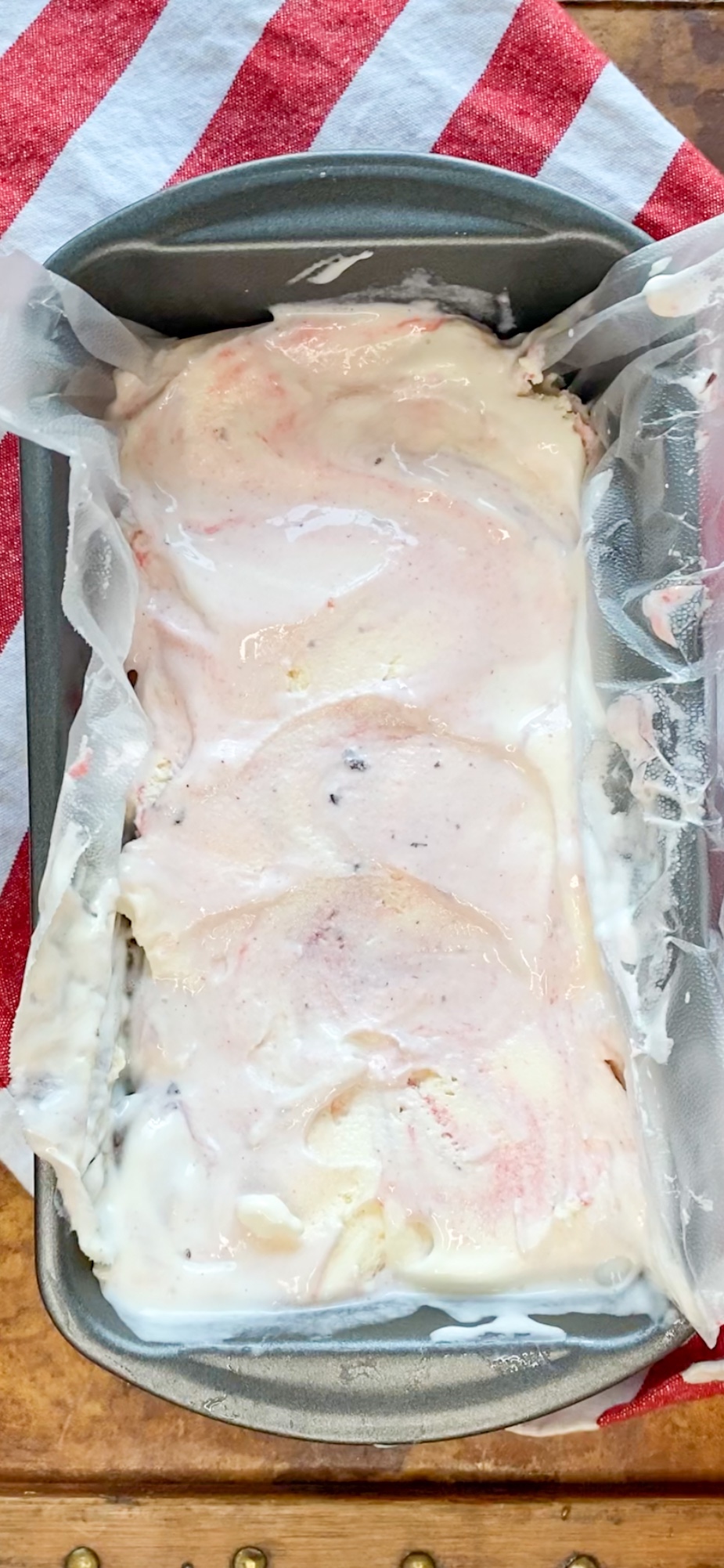 - While ice cream is softening, line loaf pans well with plastic wrap, leaving several inches of overhang.
