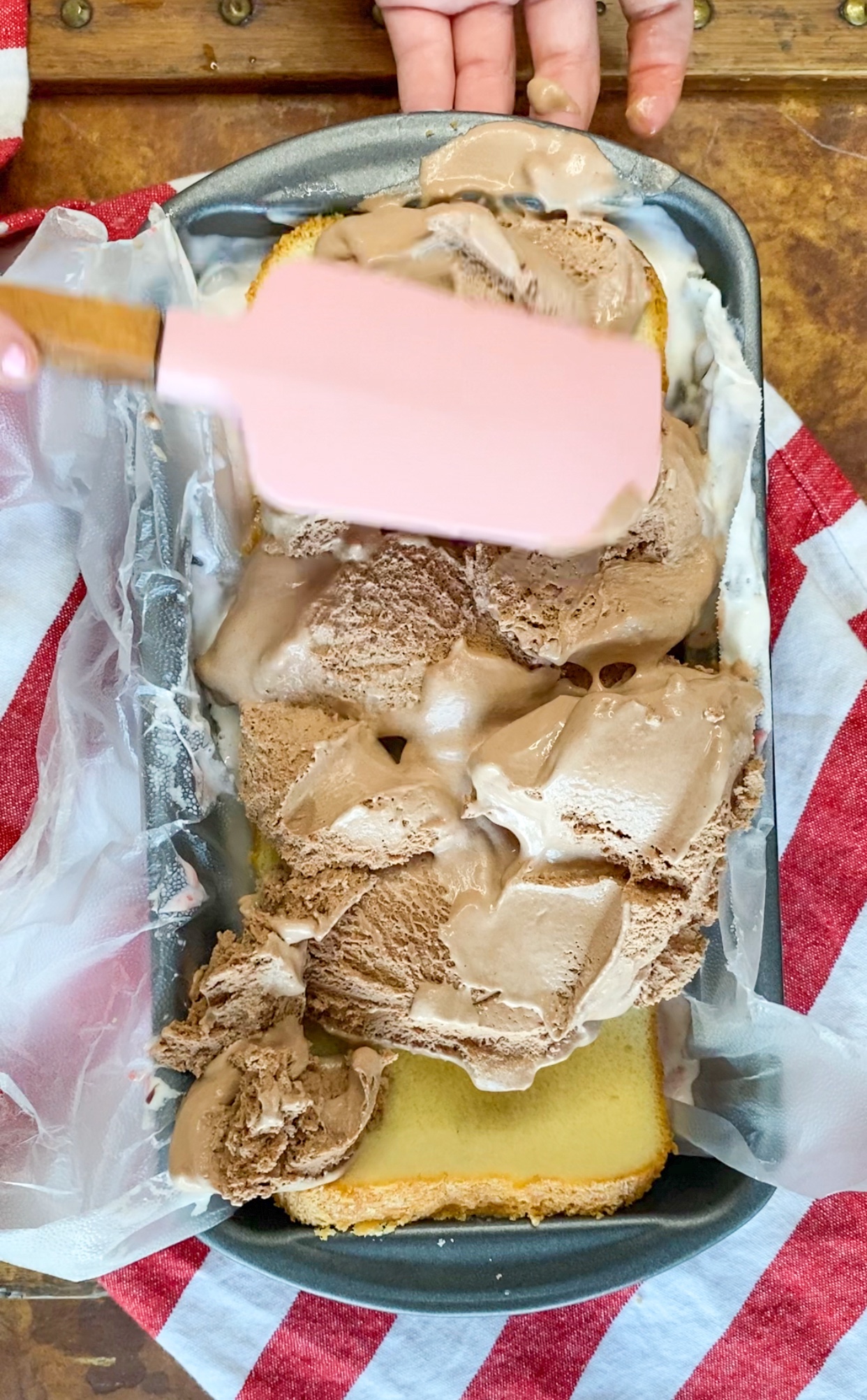- Then spoon your second flavor of softened ice cream onto the pound cake. Use a spatula to even out the ice cream to create your second ice cream layer.