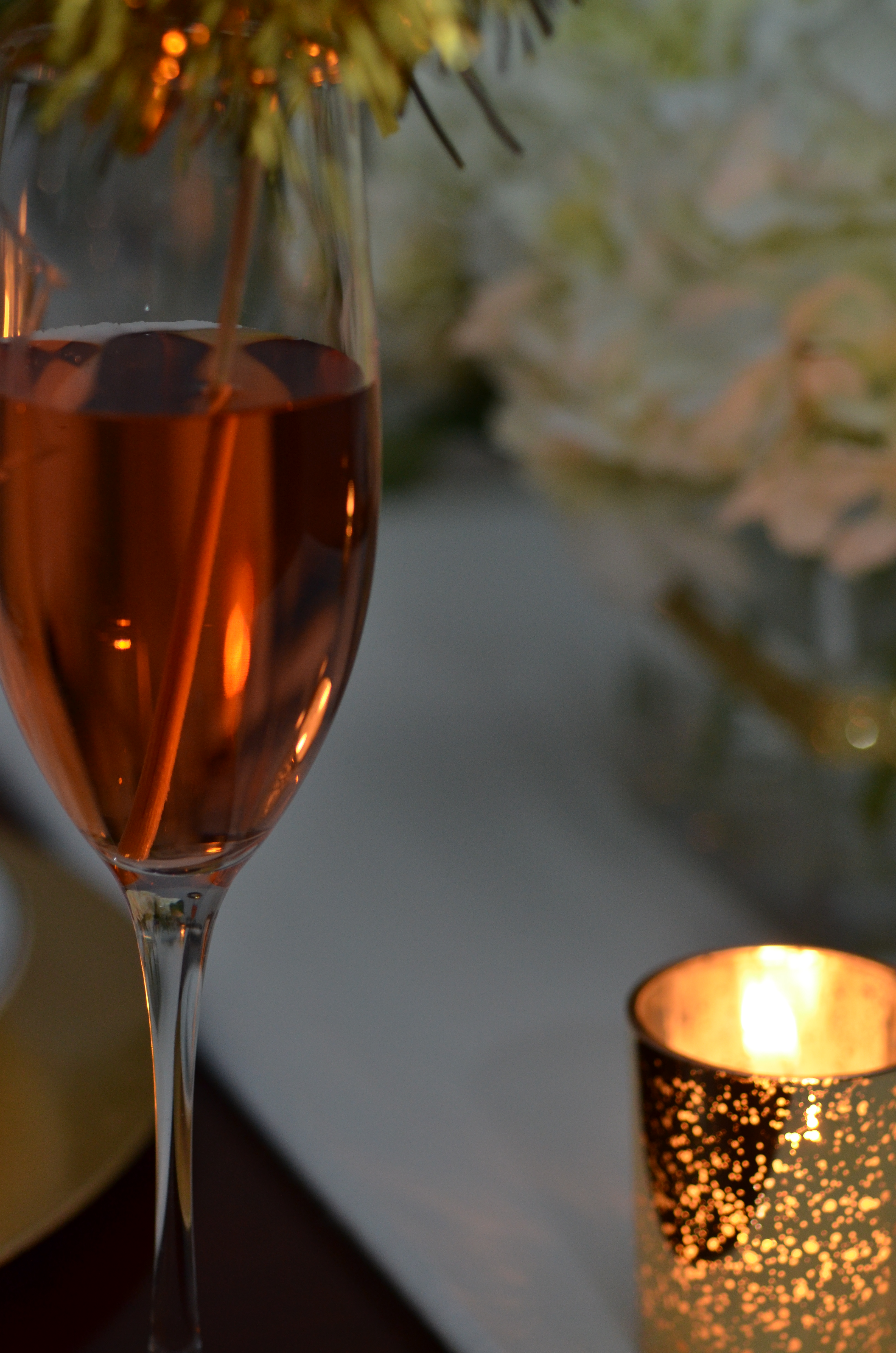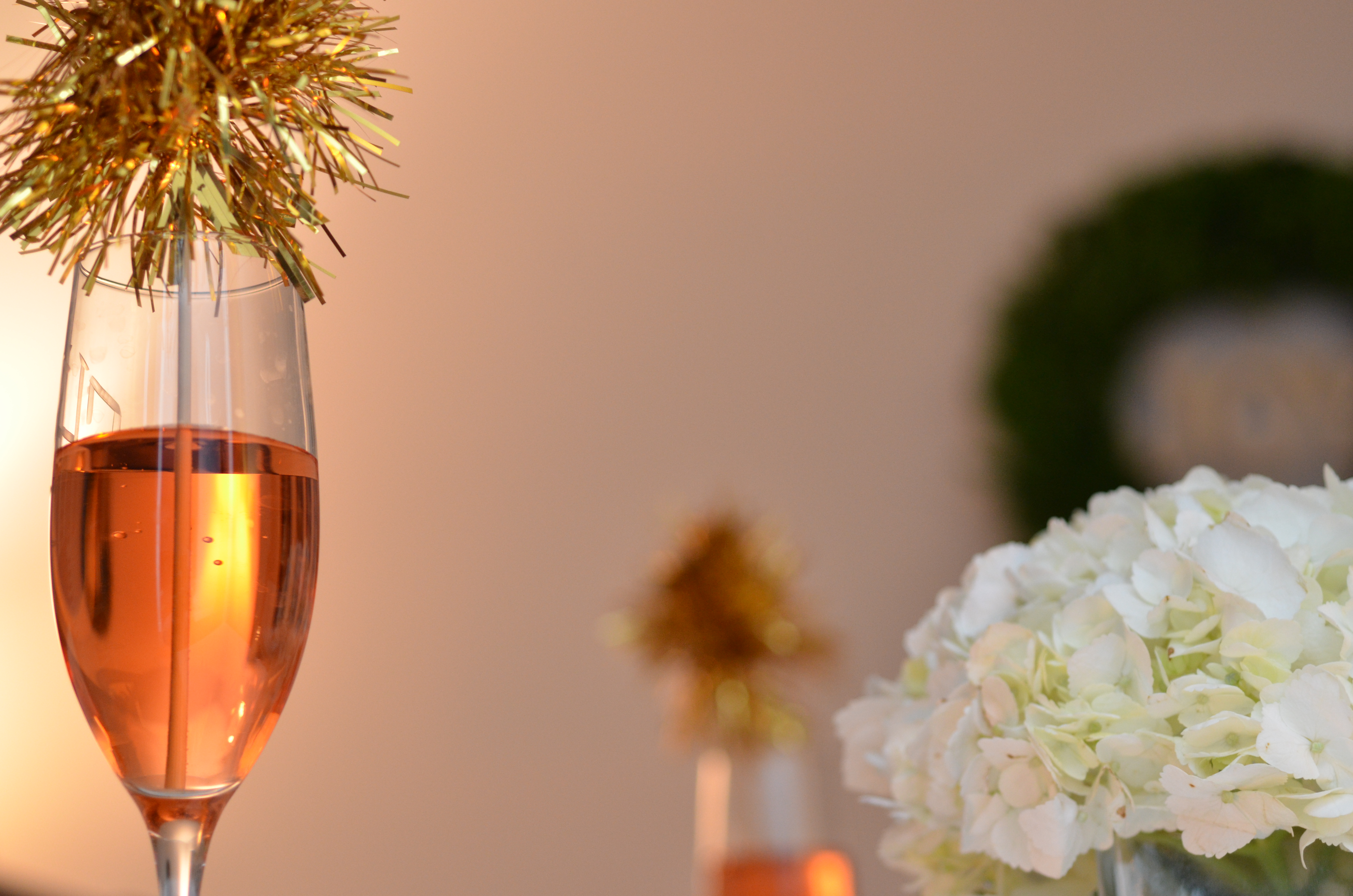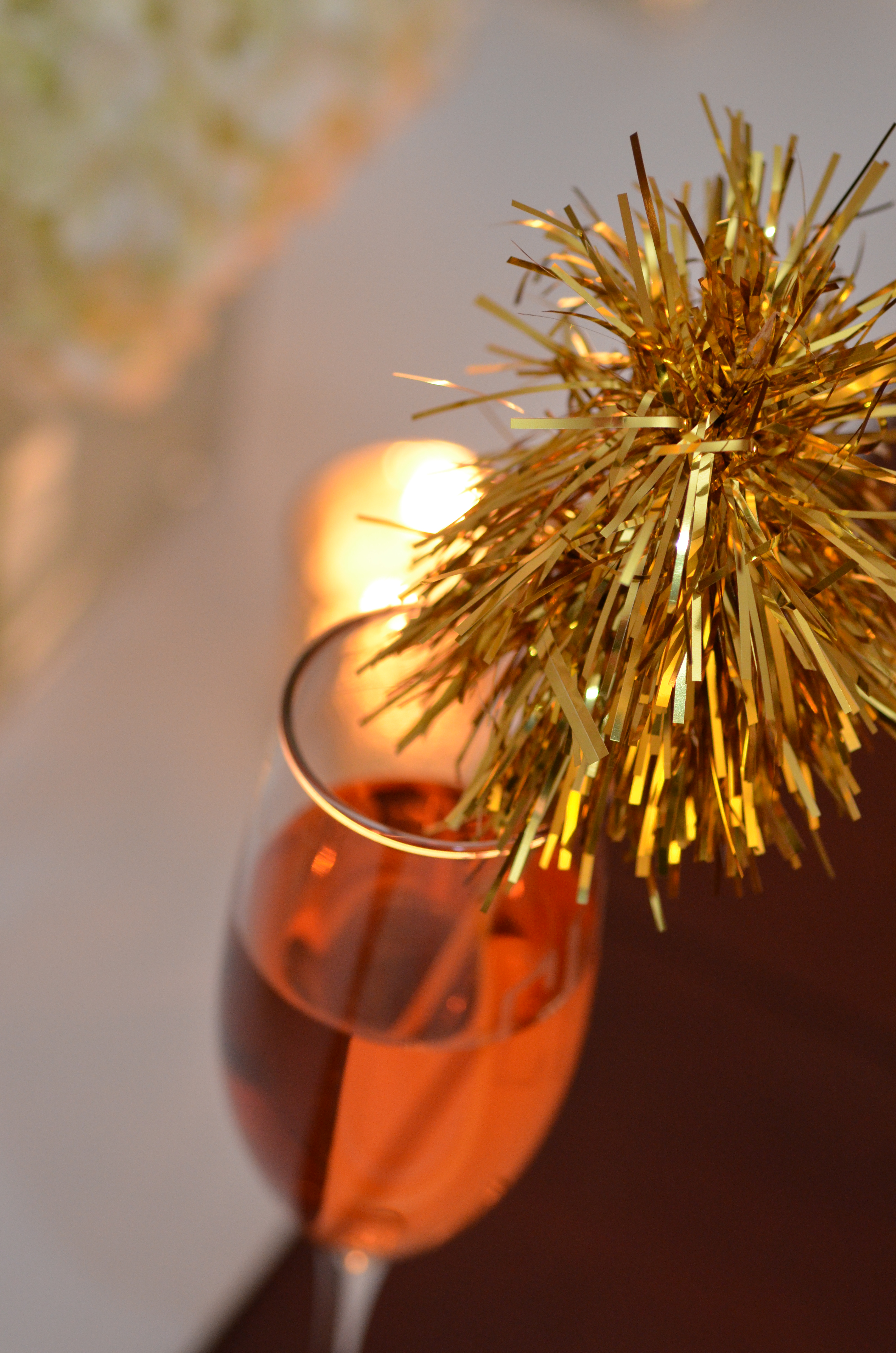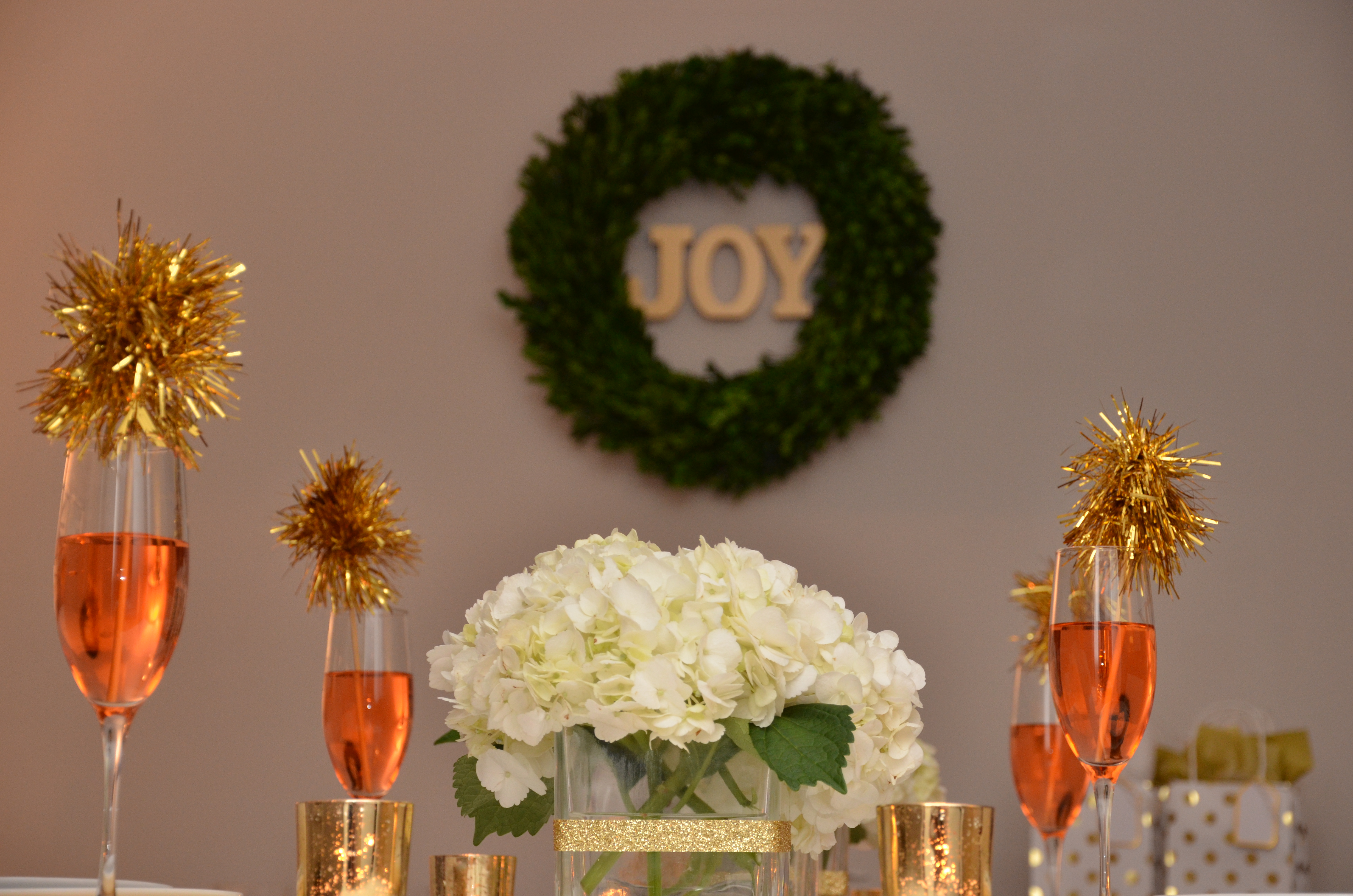 – Monogrammed champagne glasses filled with festive cocktails topped with gold tinsel drink stirrers.