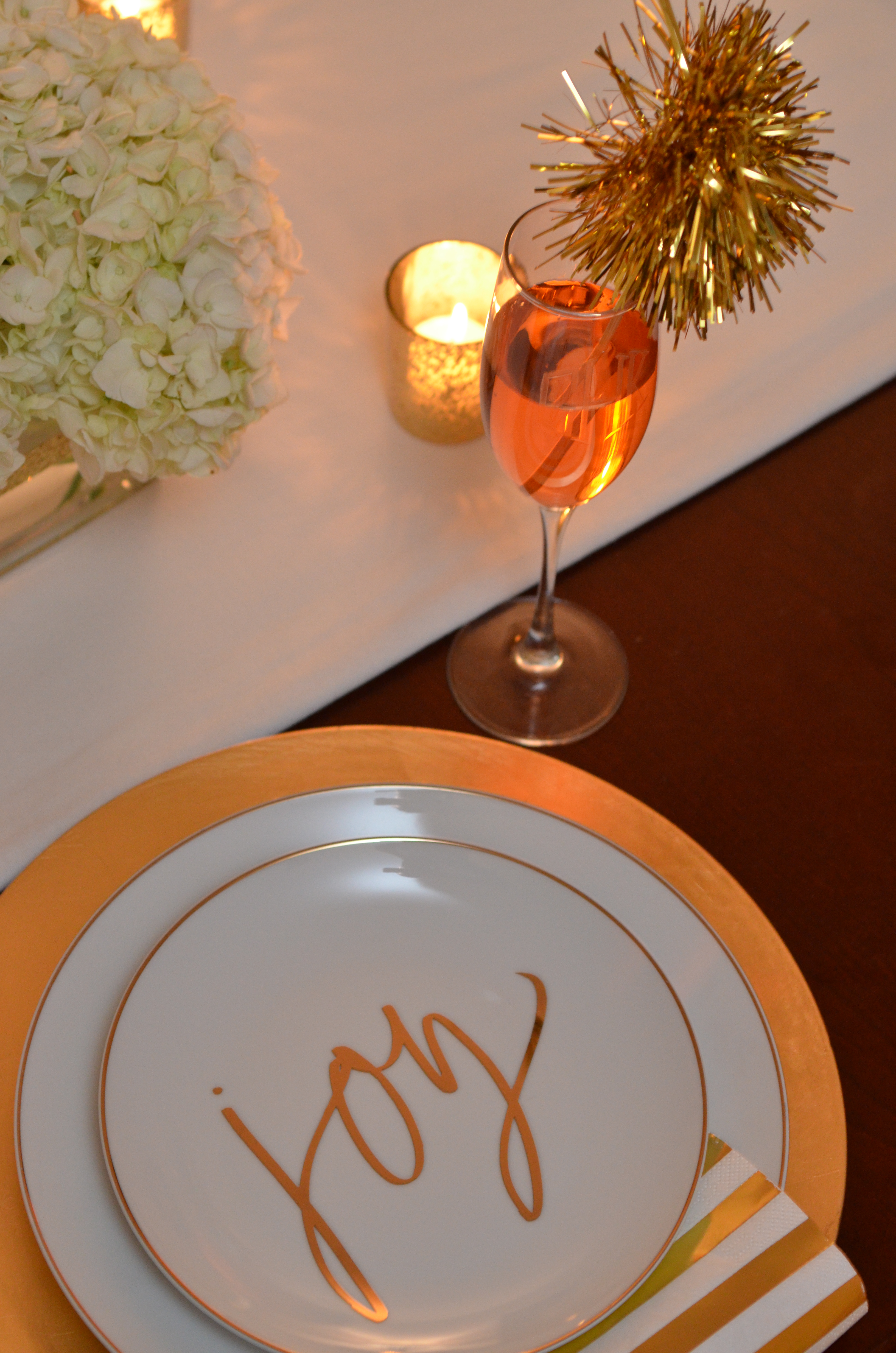 – Festive place settings with gold chargers and metallic rimmed joy plates accented by gold and white napkins.