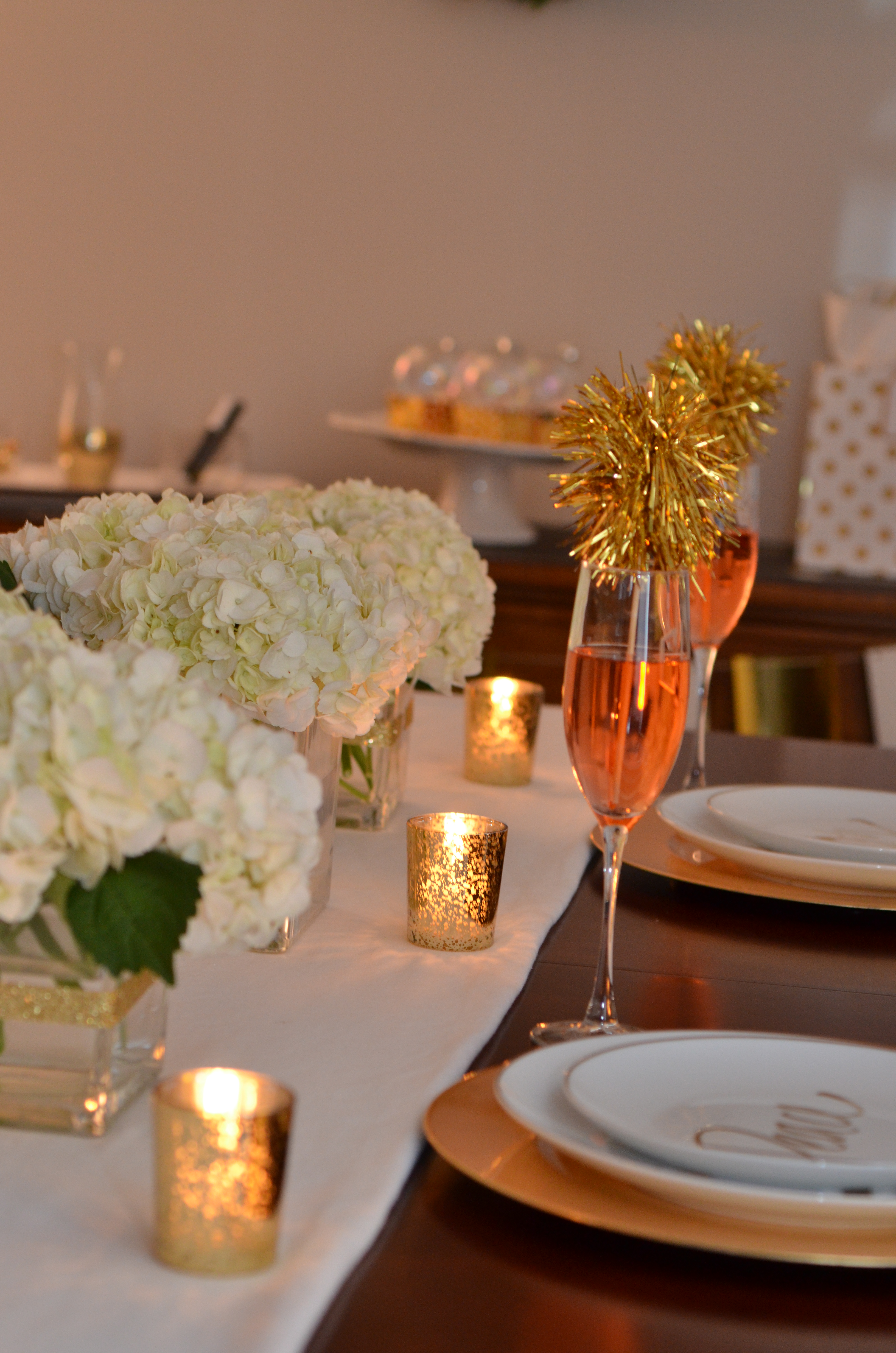– Crisp white table runner with elegant hydrangea centerpieces surrounded by gold metallic votive candles creating beautiful glow to the room.