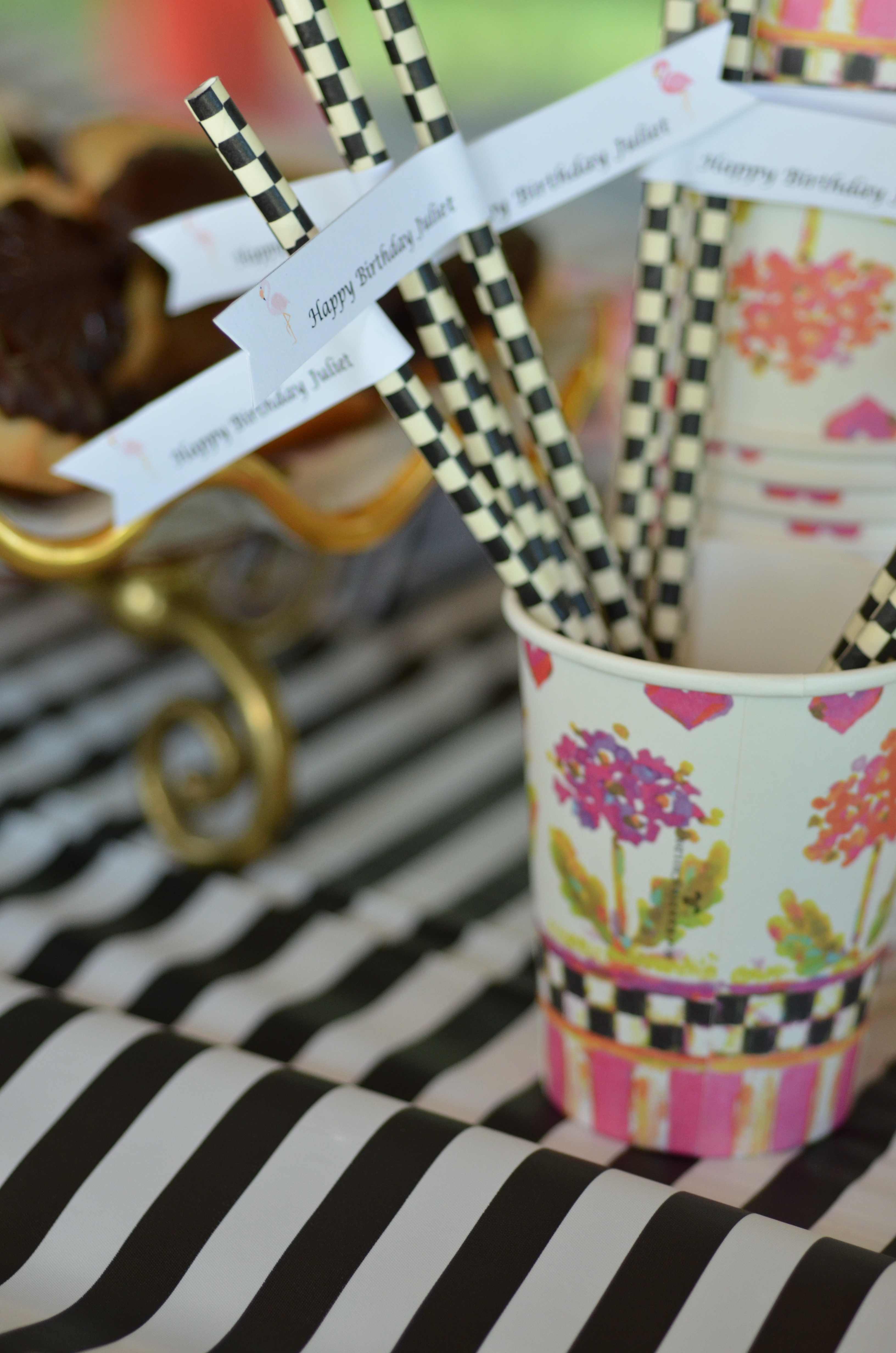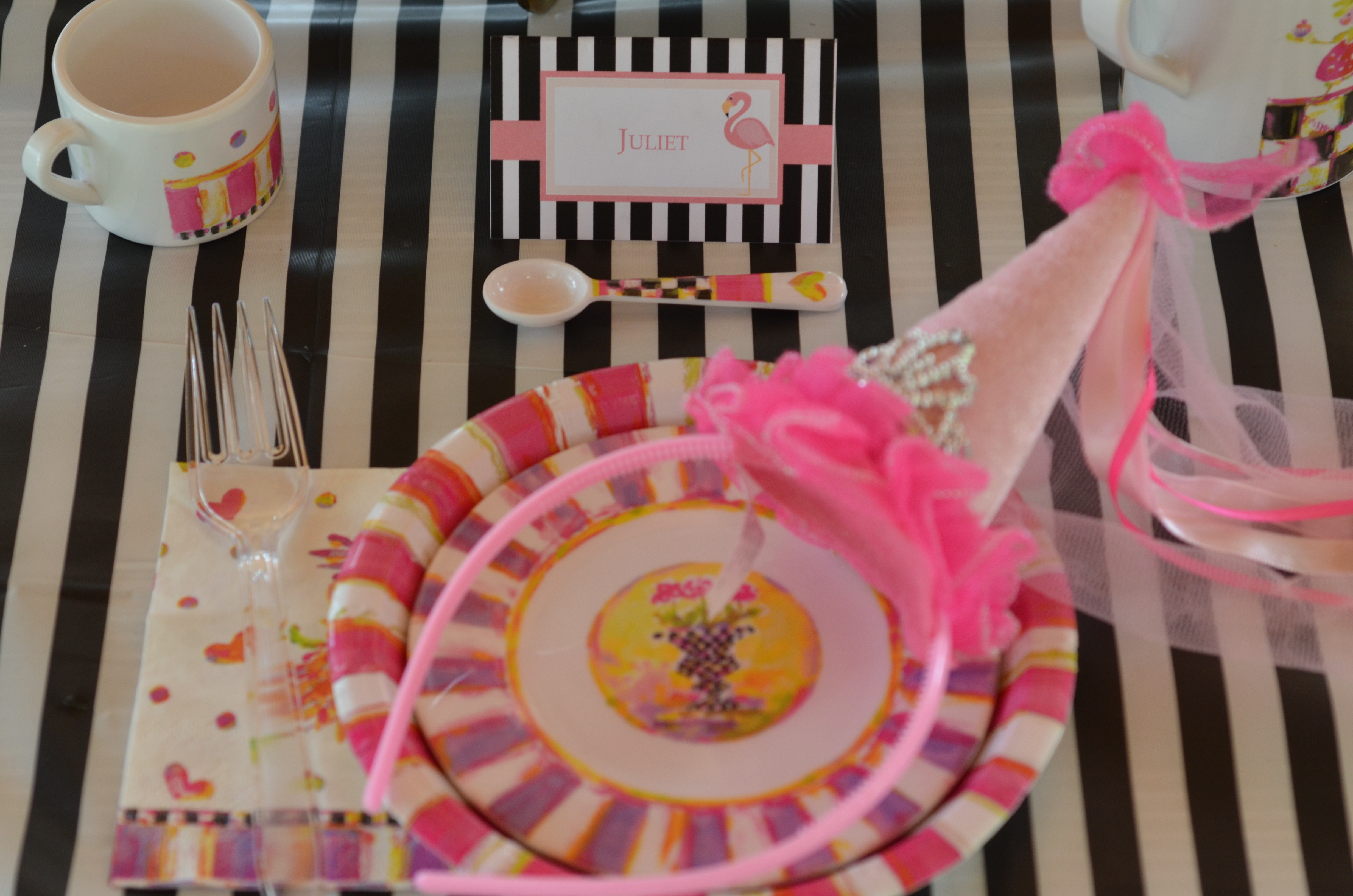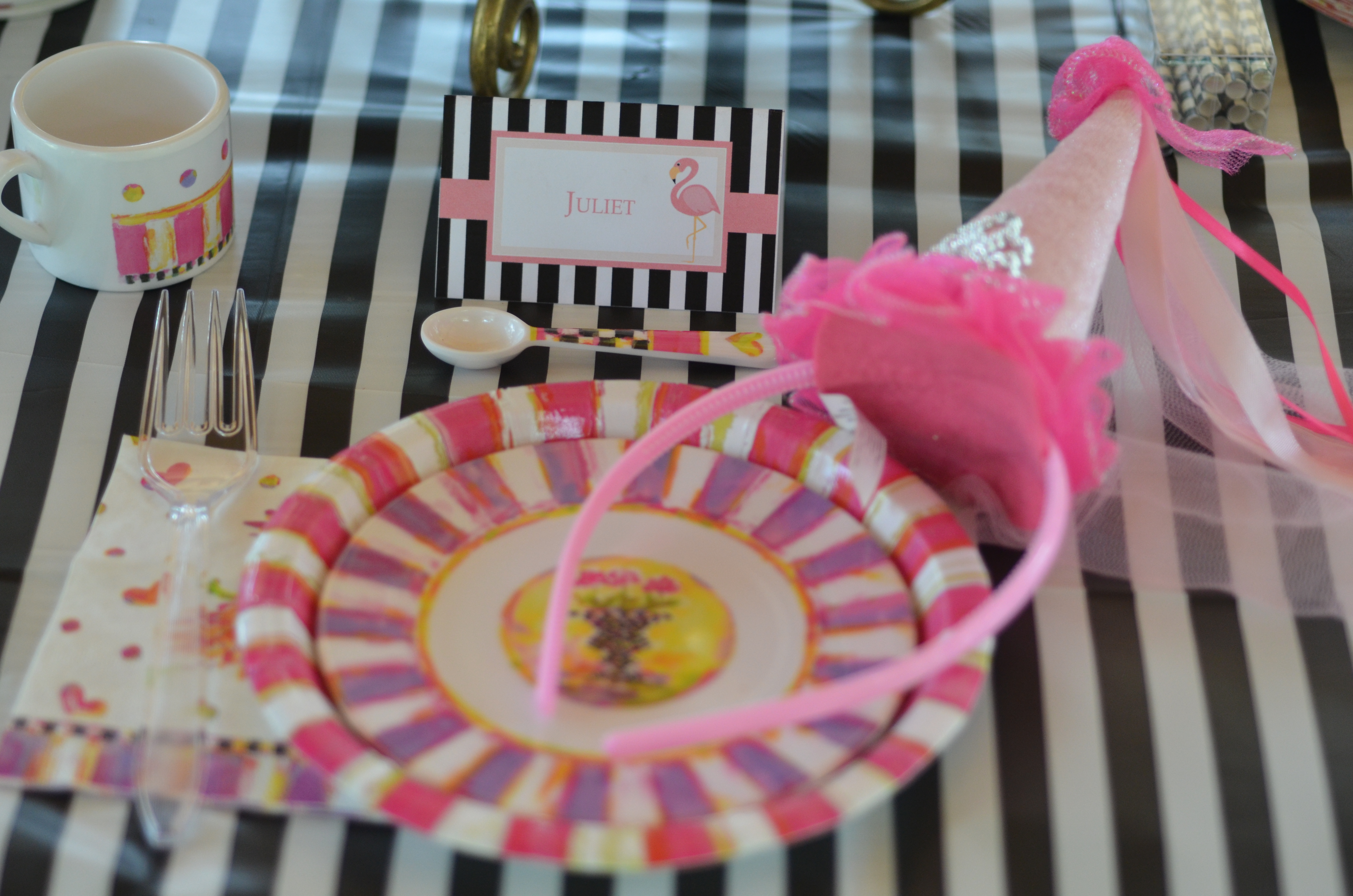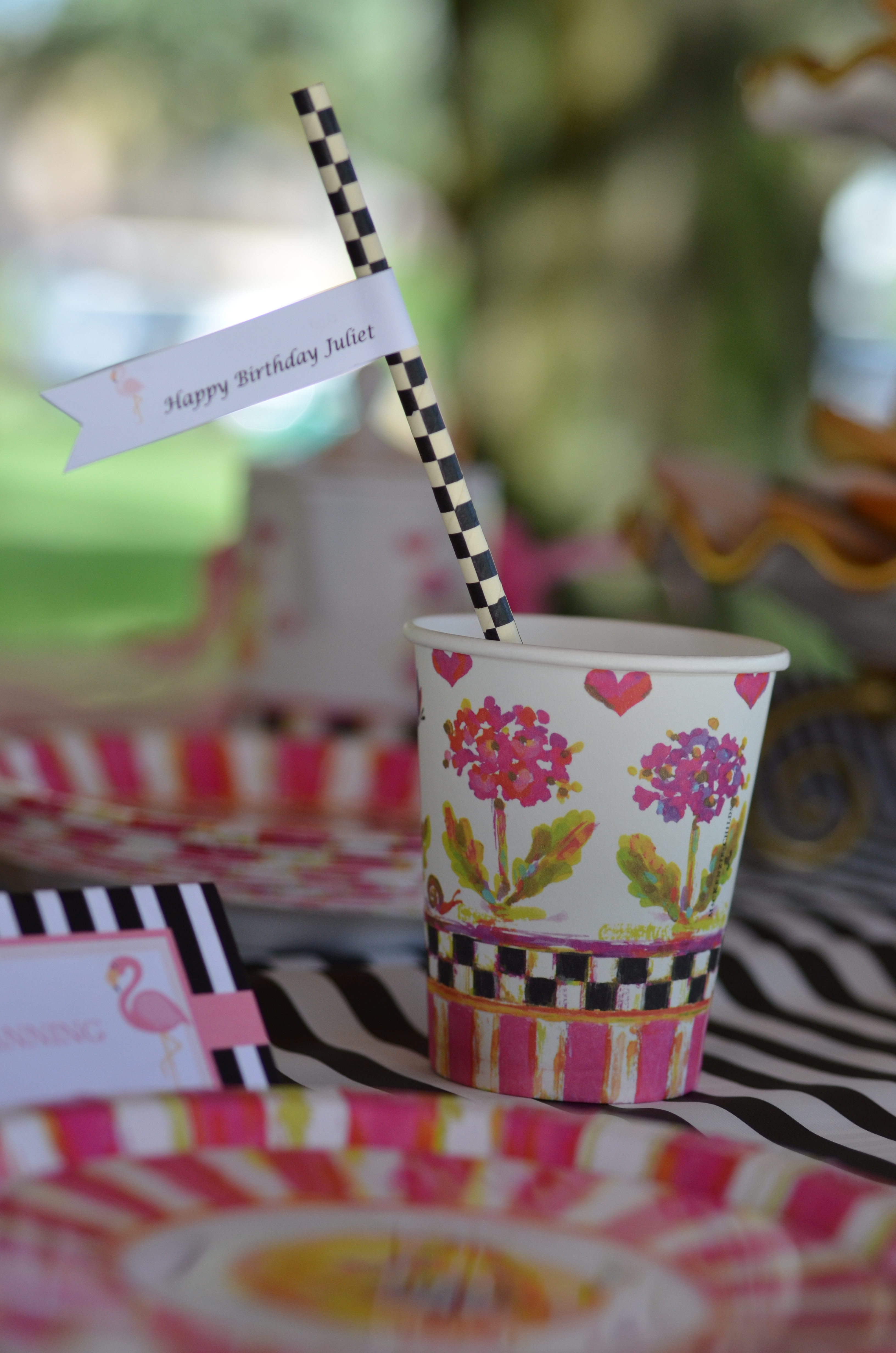 Sometimes all an event needs to go from ordinary to magical is a bit of fairy dust. Their Pixie Party Paper Products feature a bright design of checks, flowers, teapots, hearts, and, of course, impish garden sprites. Fun, fun, fun from first RSVP to last piece of cake, for little and big girls alike. To incorporate the flamingos into our decor we created black and white flamingo place cards and straw flags.