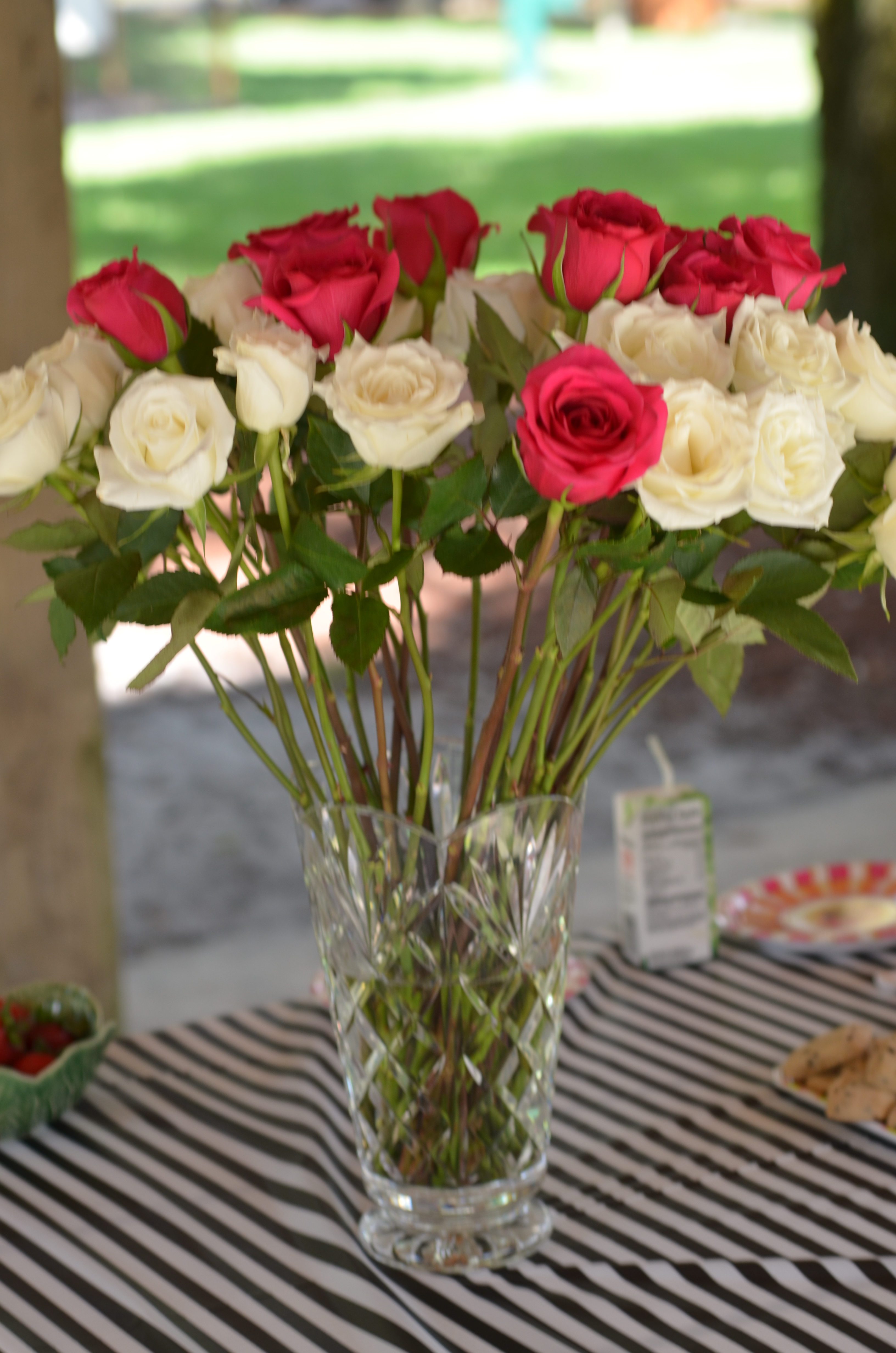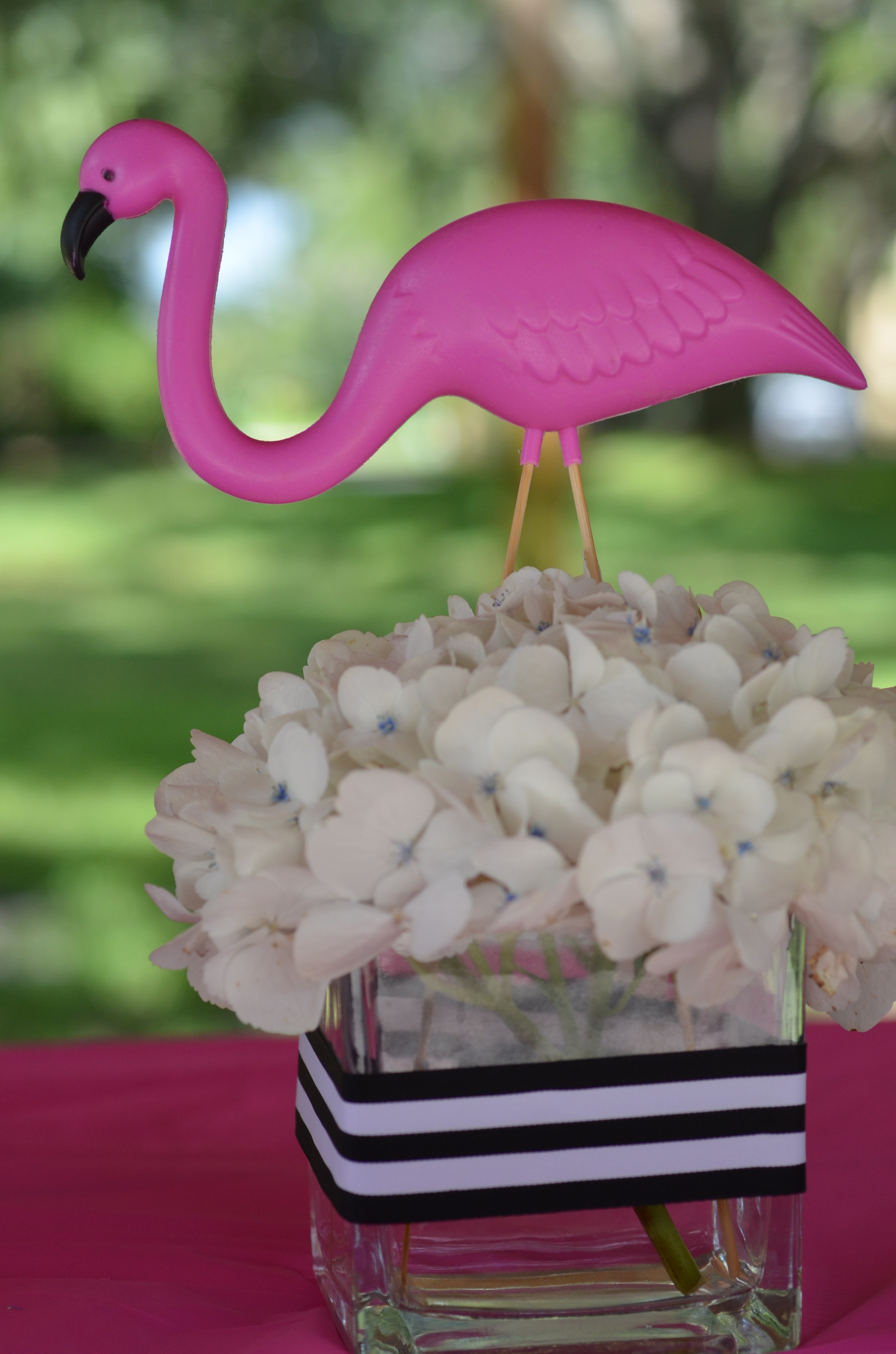 The birthday girl wanted pink and white flowers so that is exactly what she got. We included flamingos in the centerpieces for the gift and favor table with a black and white ribbon to try in our theme.