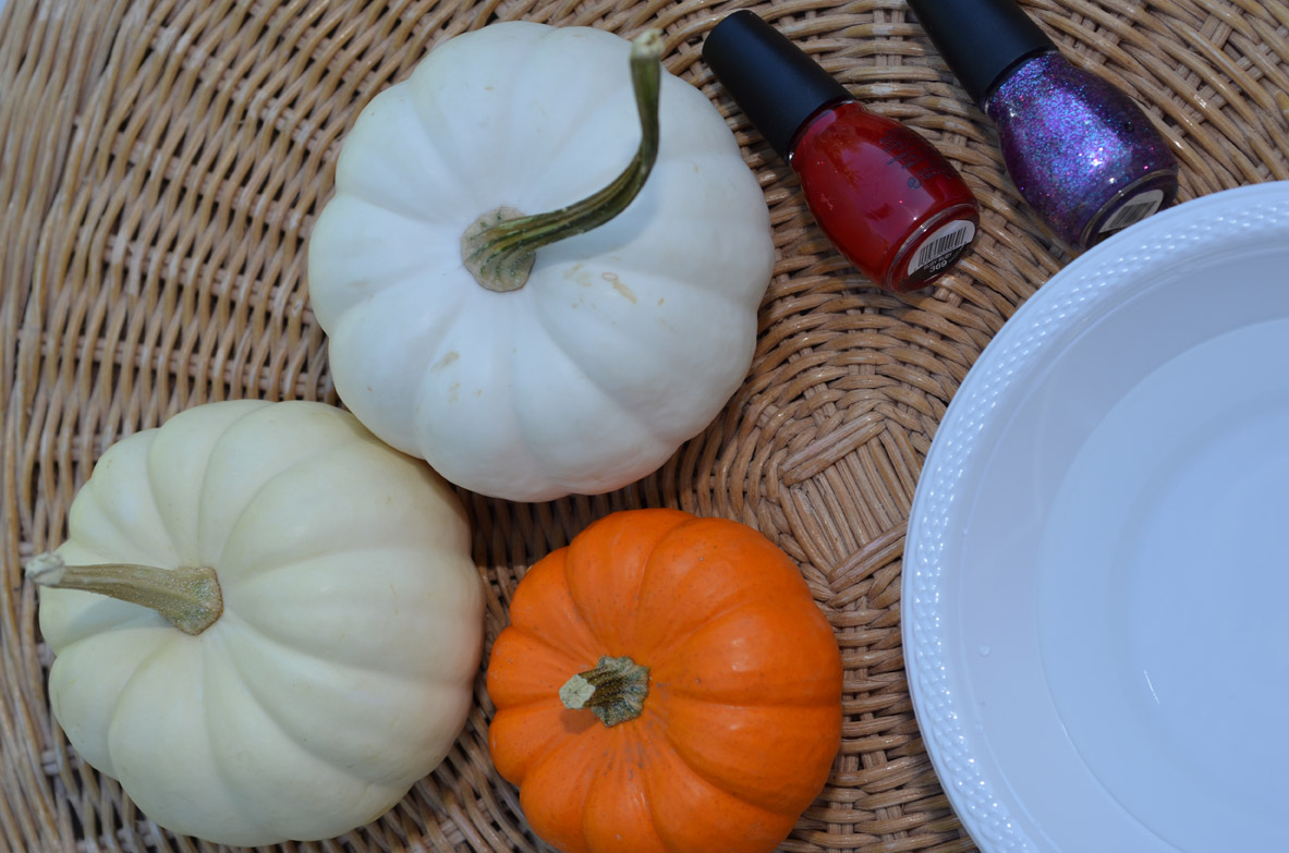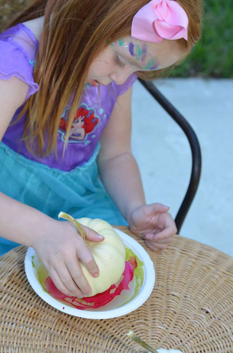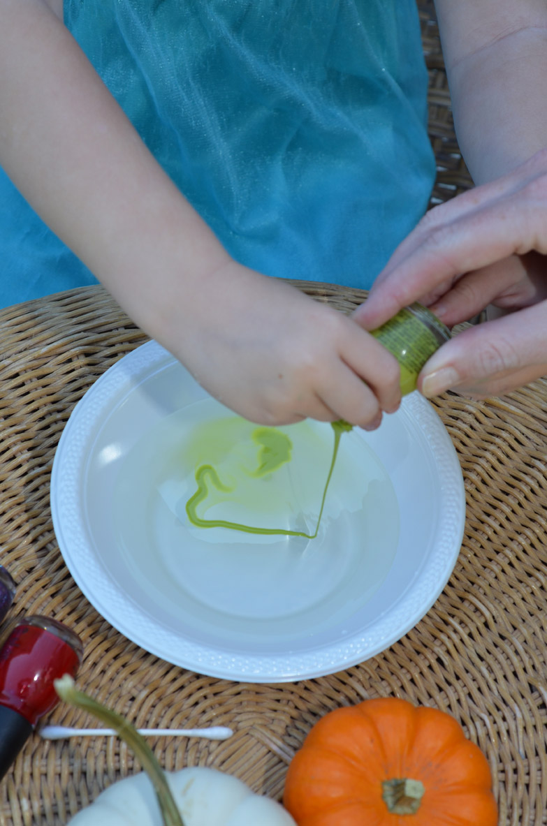 Pro Tip: Make sure the water is warm and not cold and pour the nail polish slowly.  When you pour it too fast it all drops to the bottom of the bowl.  Do not fill the bowl too full so that it does not overflow when you put the pumpkin in.  You can use a tooth pick to create a design.  Bailey and I originally tried with a cotton stab but all the polish stuck to it. White pumpkins work best so the color pops.