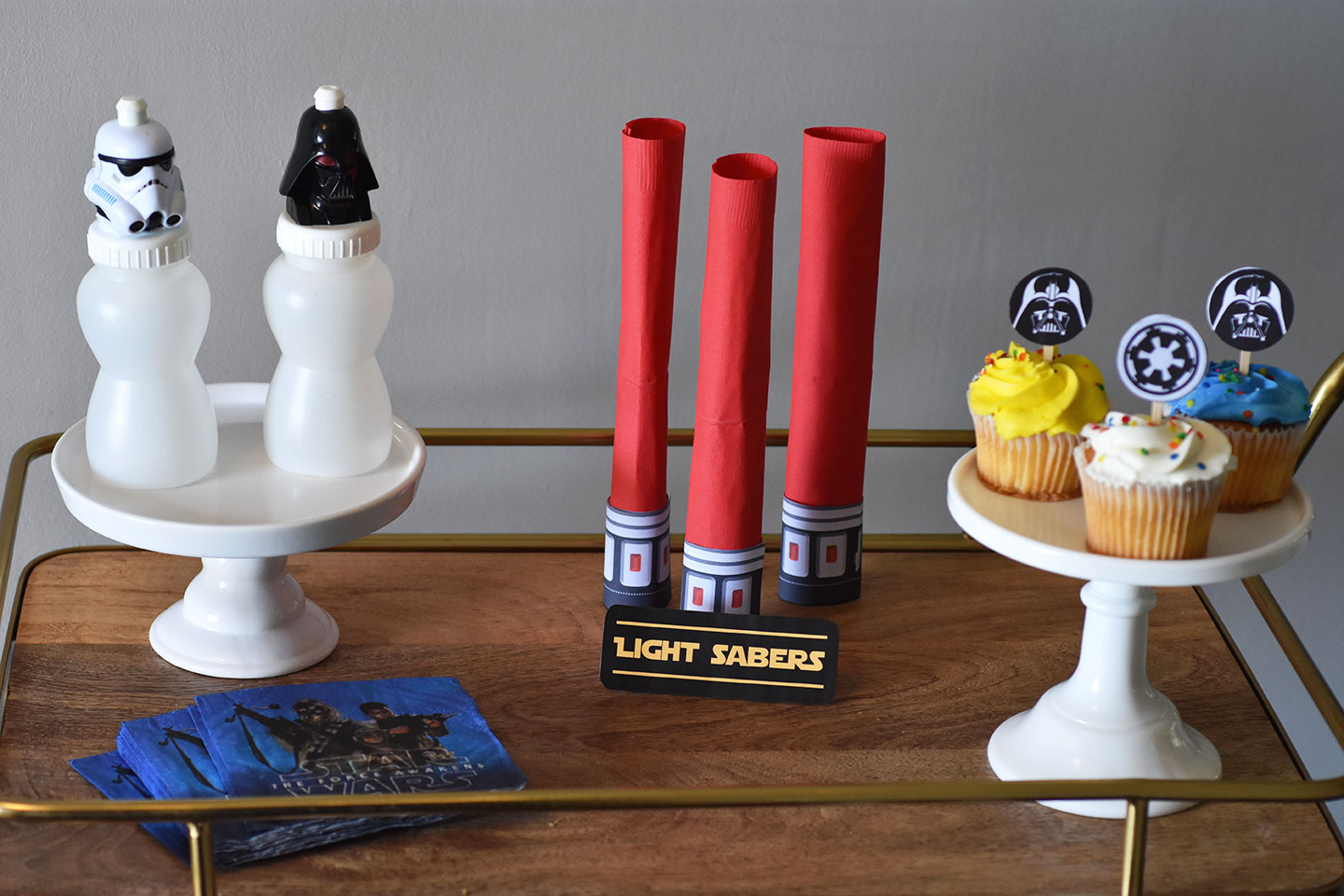 How cute are these Star Wars napkins from Oriental Trading Company? And these Star Wars cups are one of my favorites. They originally come with juice we simply remove the labels so they fit into our party decor.