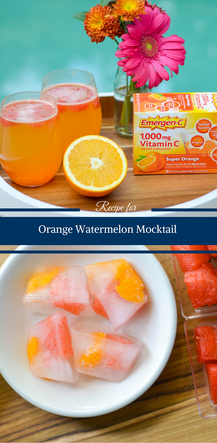 The holidays are here!  And I could not be more excited.  It is truly my favorite time of the year.  We will be traveling for the holidays which means lots of fun and some exhaustion.   I am partnered with Emergen-C to create my Orange Watermelon Mocktail recipe.  Emergen-C  is my go to drink when I need to be refreshed after a busy day so when I saw the opportunity to partner with them I could not wait to get started.  I love the holidays, but I do miss hanging out by the pool.  This mocktail will transport you back to the poolside days of summer!