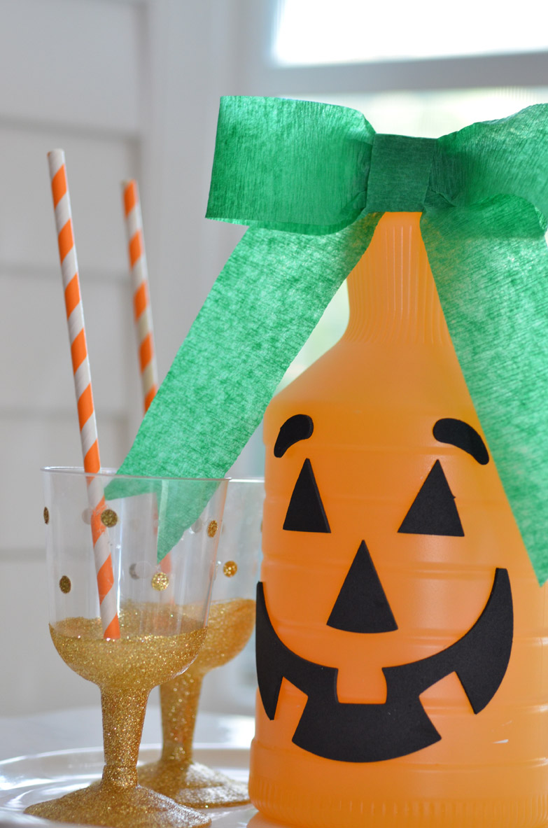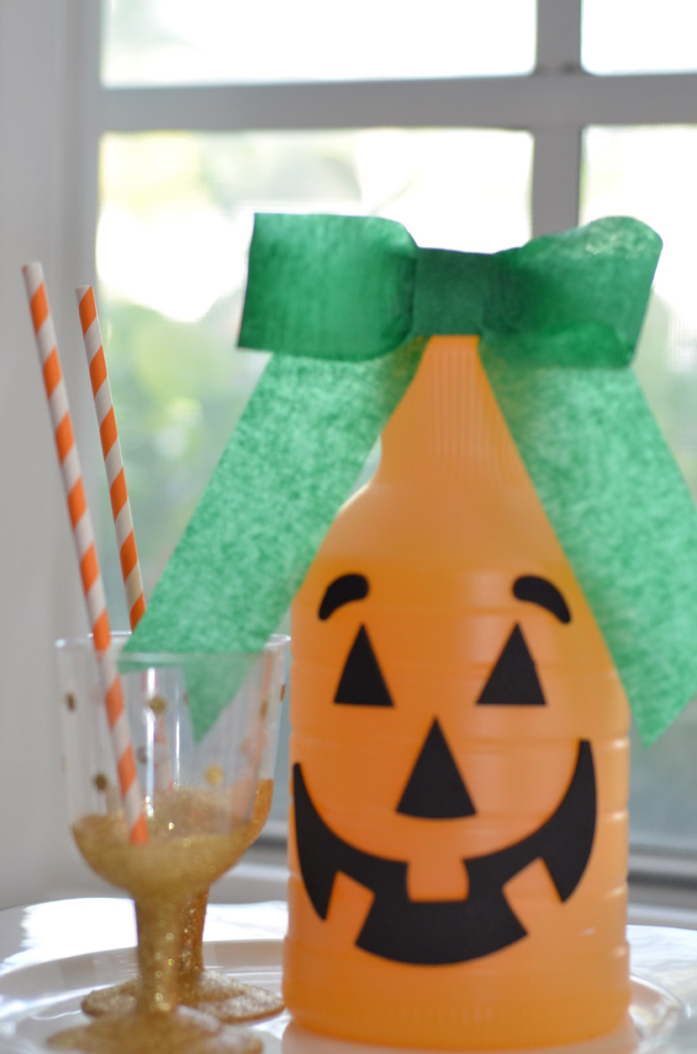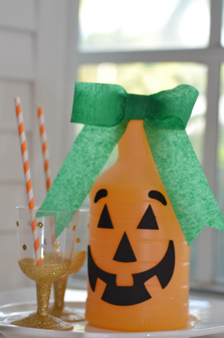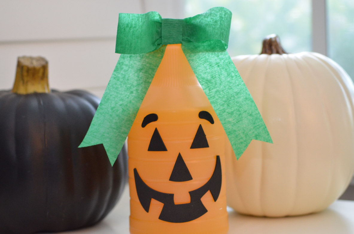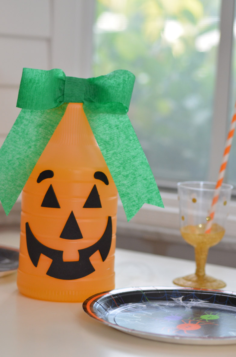 I used a bottle of Sunny D for this project because color was perfect for a pumpkin. It also has a rounder shape for the jack-o-lantern faces. You could do the same with small bottles of juice as well.