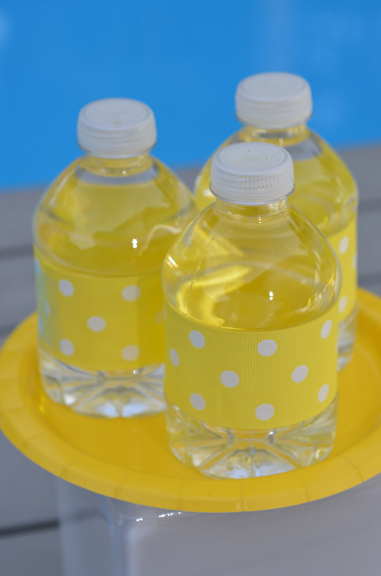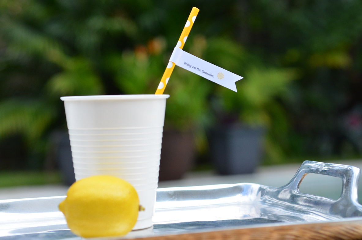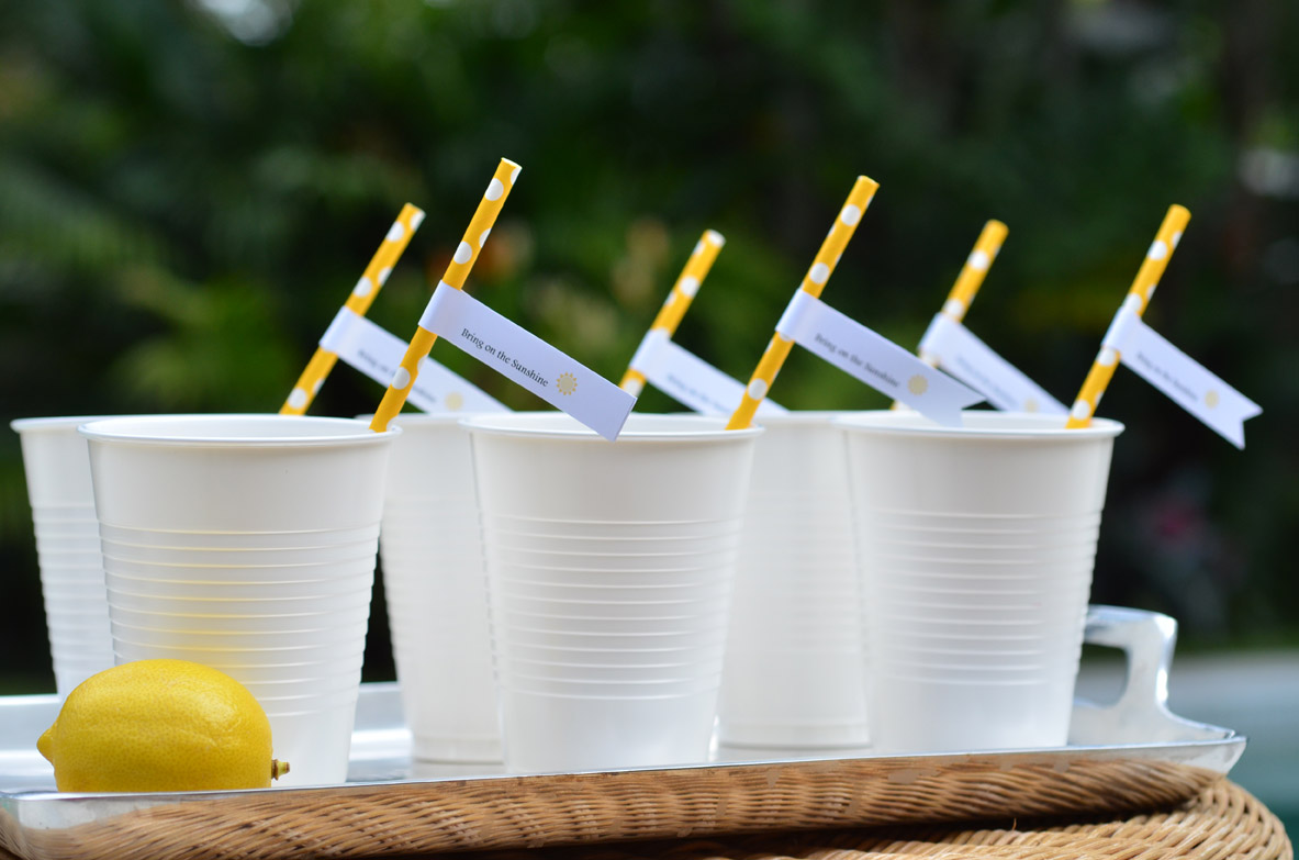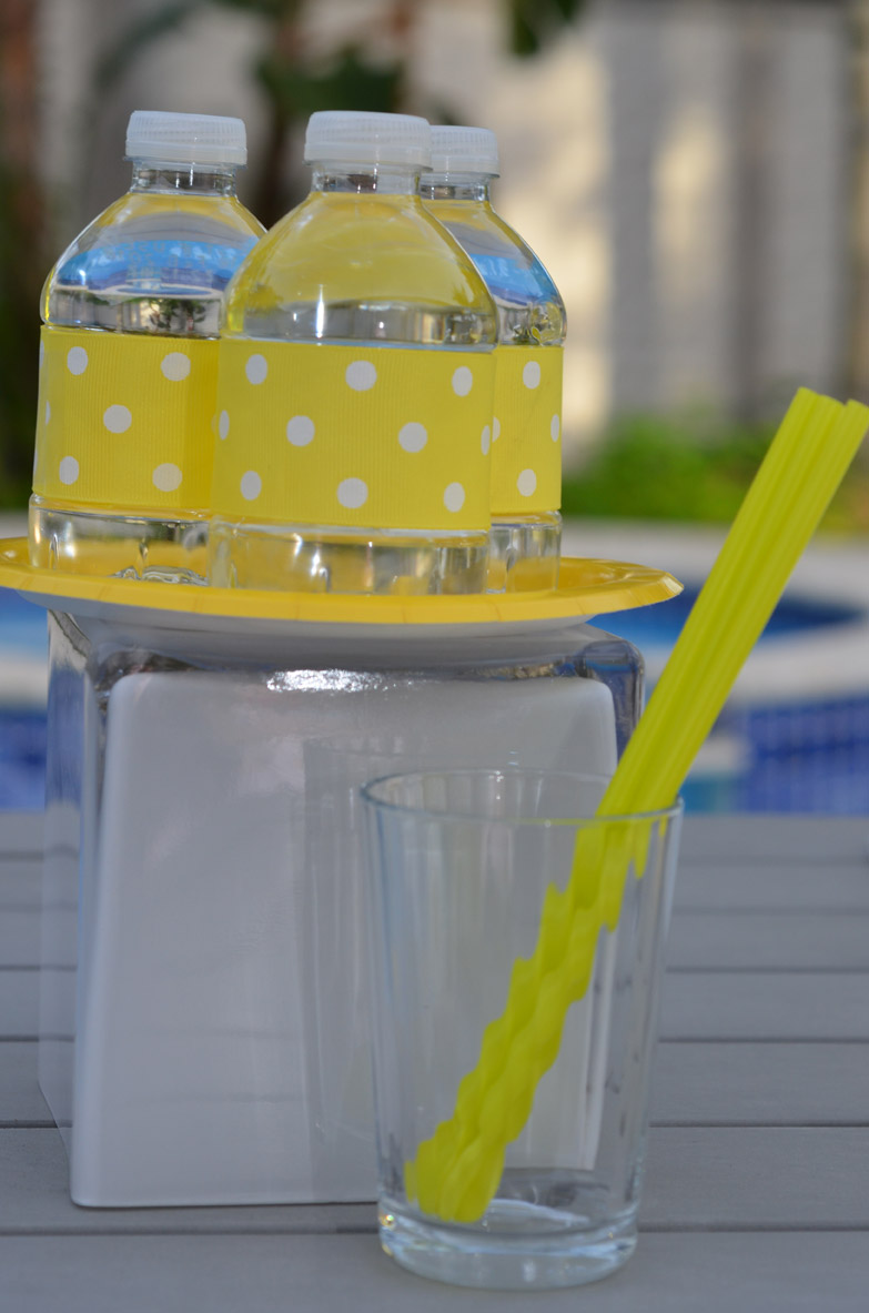The biggest part of our hurricane supplies was water and lots of it. We wrapped the mini water bottles with our cheerful yellow polka dot ribbon to have the bottles add to our Sunshine Party decor. And we created custom straw flags that welcomed the Sunshine Back.
