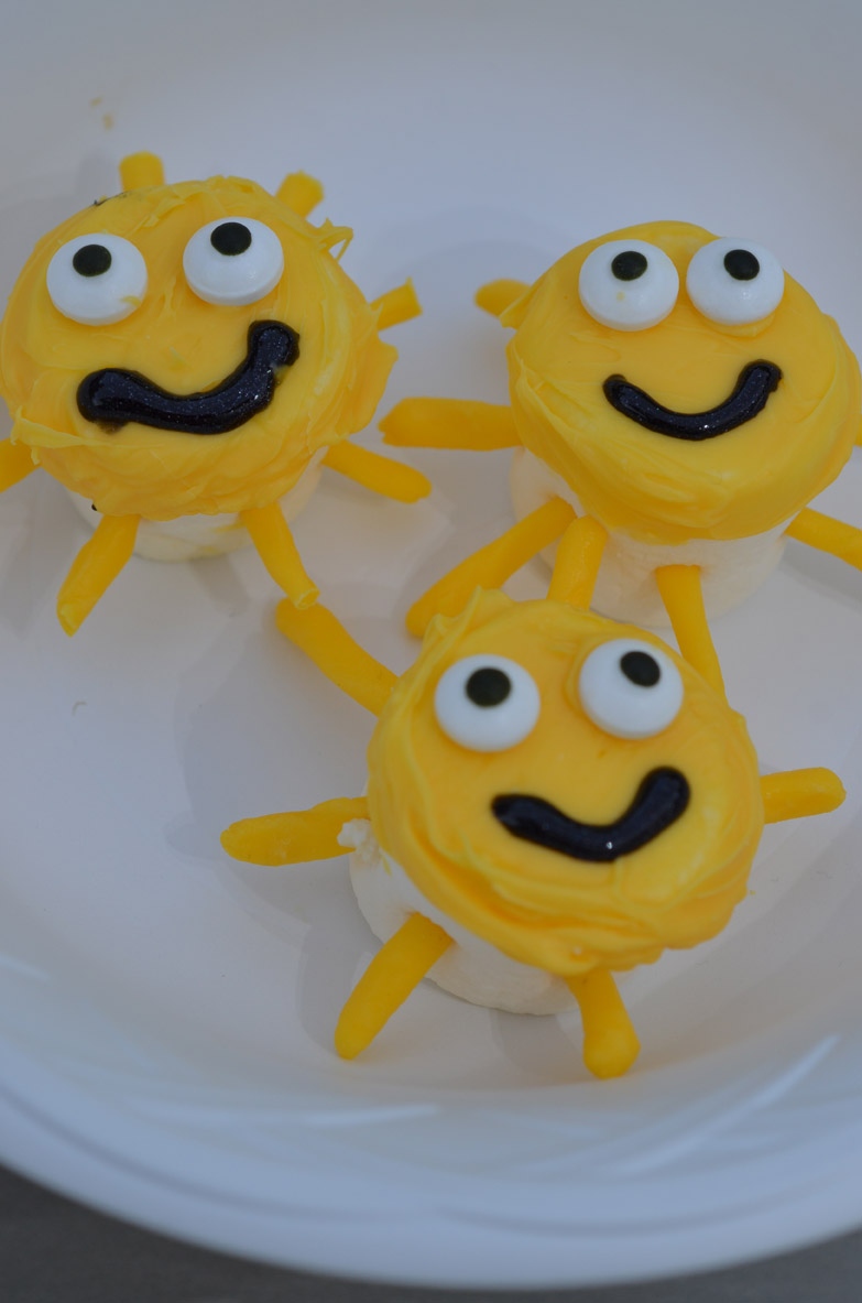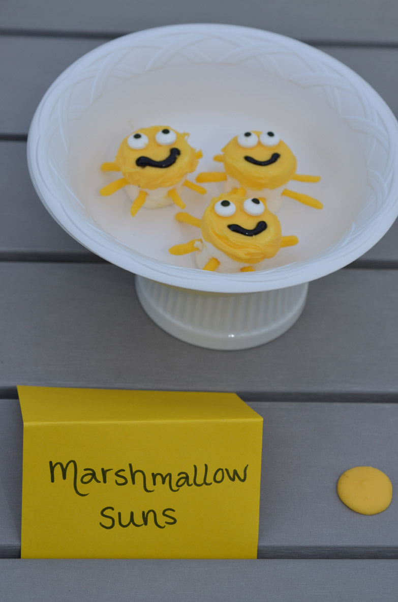 We made the Marshmallow Suns with the yellow candy melts. We originally bought the eyes for a Halloween party. I covered the marshmallows in the yellow melts. I knew they were missing something so I added the eyes and mouth. We took a small amounts of the candy melts and rolled them out into small pieces for the rays. Finally we attached them I used a knife to make holes and put the rays into the side of it. These were Bailey's favorite part of the Sunshine Party snacks.