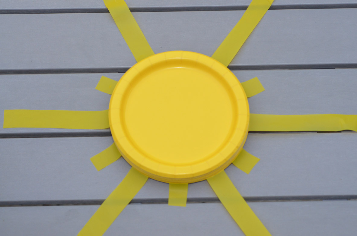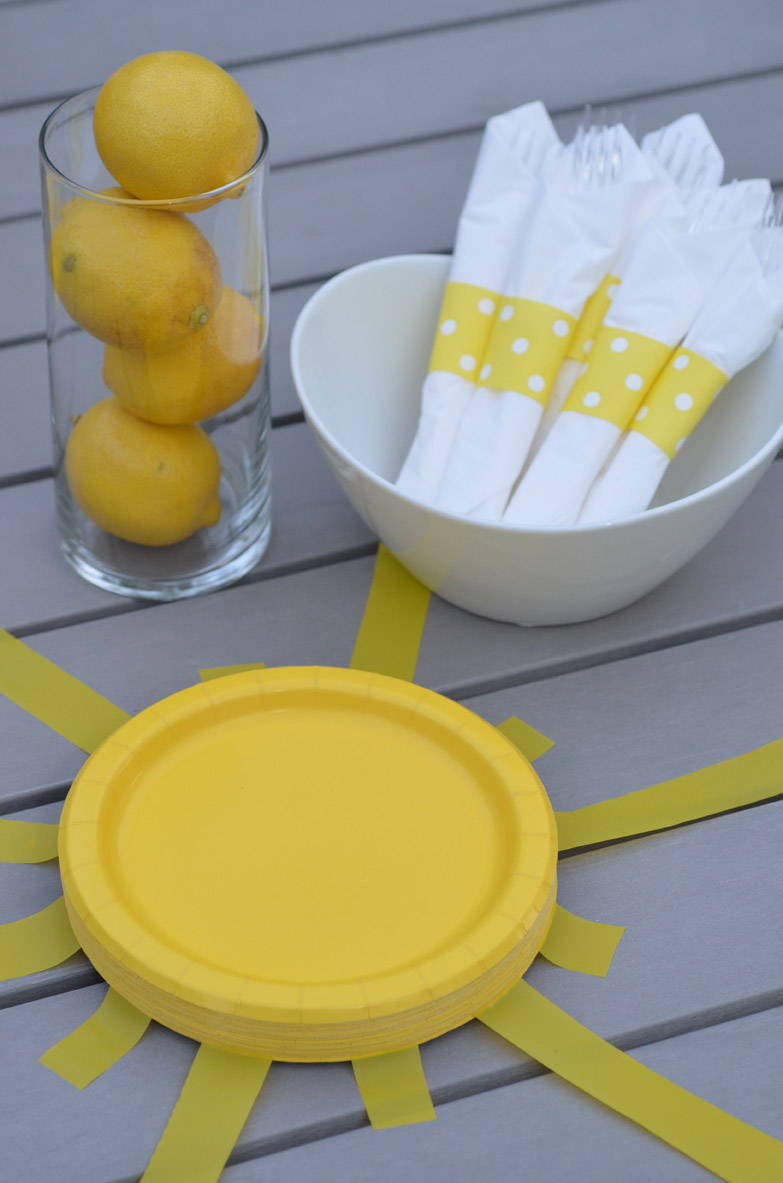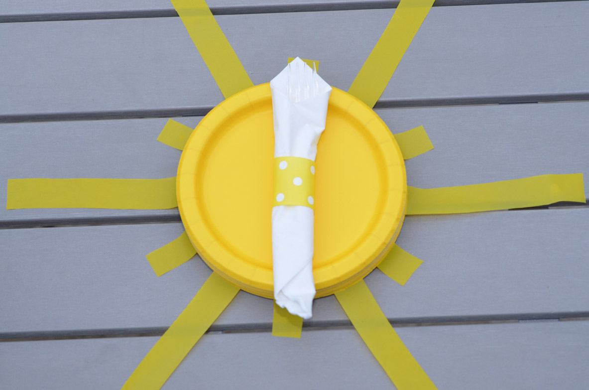 We took a vinyl table cloth and cut 1" stripes then cut them into 2 sizes. Then I taped the vinyl pieces to the bottom plate alternating the long and short ones to form the sun below for our Sunshine Party. Finally it was a windy day so I had to tape down the longer pieces. For the silverware I wrapped them in a white napkin and accented it with our yellow polka dot ribbon.