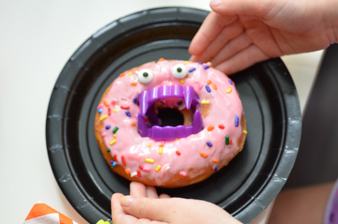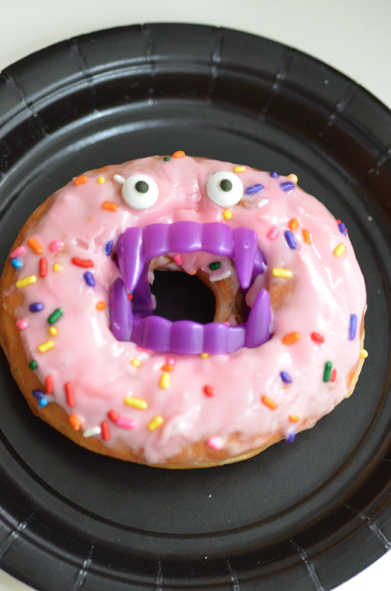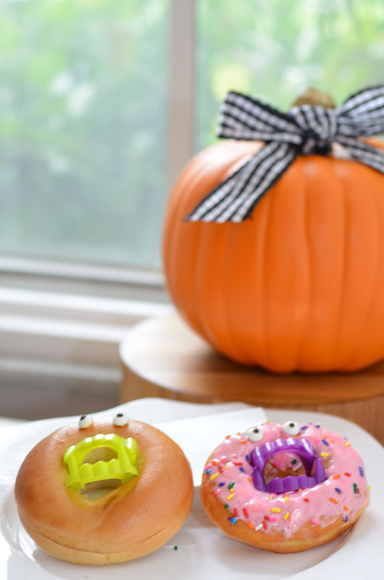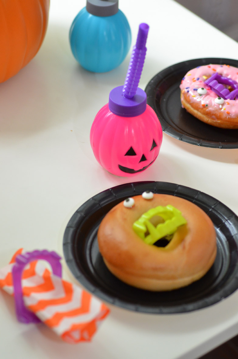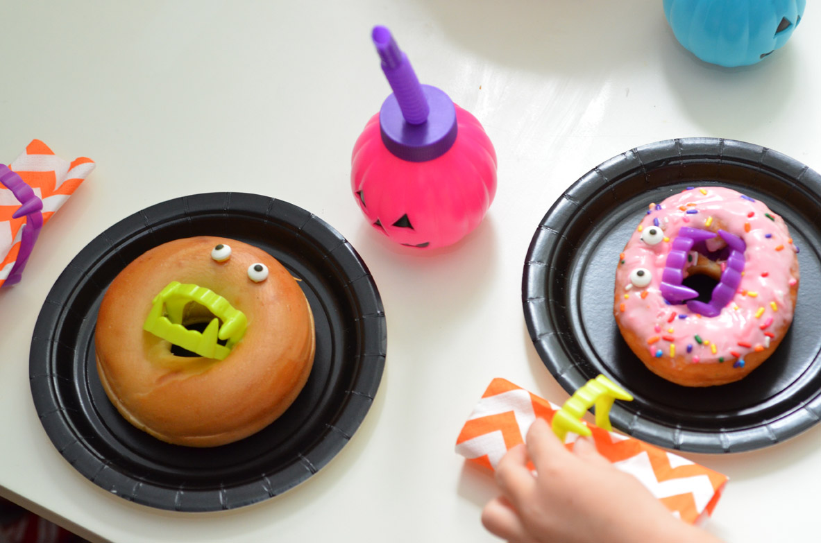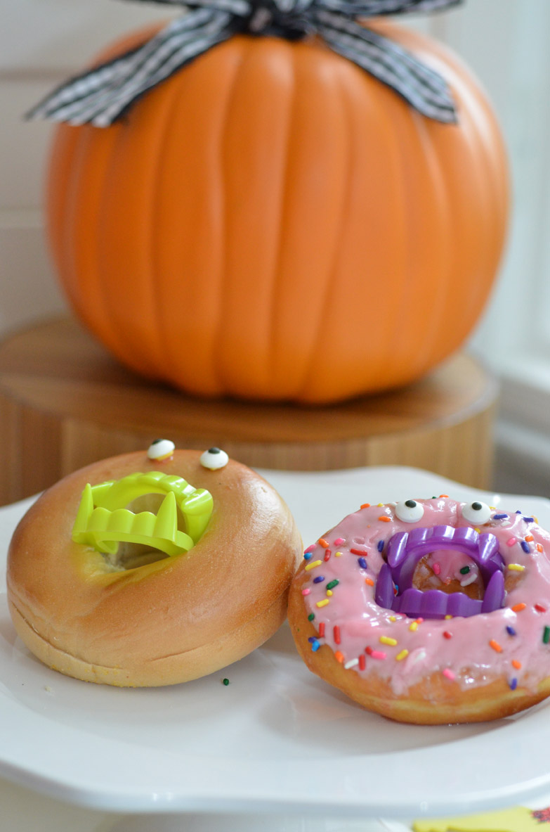 Simply fold the vampire teeth in half and place in the middle of the bagel or donut. Add two eyes and serve! To make our breakfast table complete I added a pumpkin as the centerpiece. And used orange and white napkins wrapped in the vampire teeth. I used the colorful vampire teeth so it was more playful than scary.
